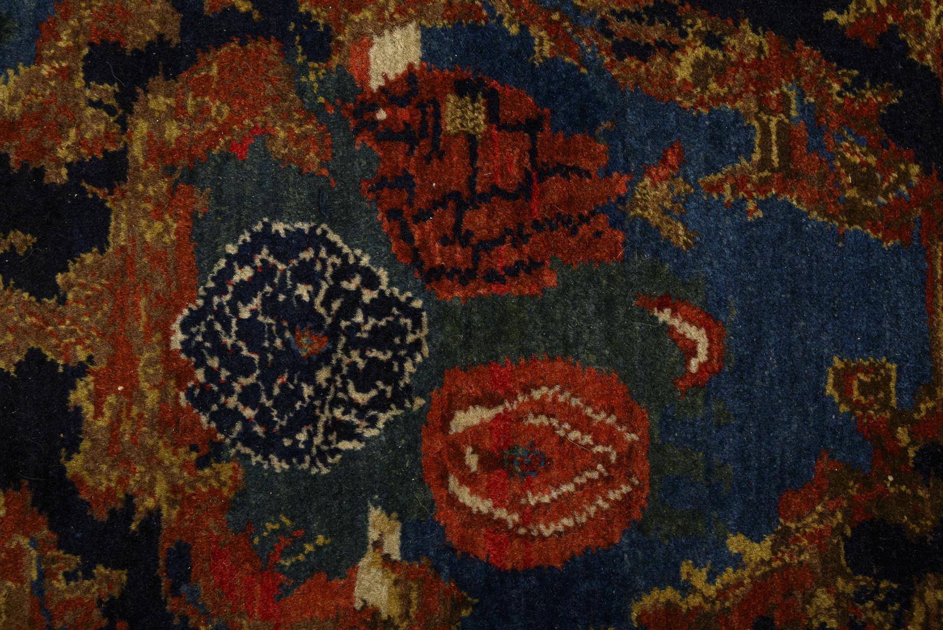 Aus der im 19. Jahrhundert entstandenen Mode für Orientteppiche ausgehendes Floralmuster im französischen Stil. Allover durchgemustertes Mittelfeld mit großen "Gol-Farang"-Motiven (sinngemäß übersetzt als "fremde Blume"), schmale Bordüre mit Blumenreihe. Schmalseiten kurz abgewebt und mit kurzen Fransen. Alters- und Gebrauchsspuren, partiell kleine Defekte und leicht fleckig, Kolorit etwas verblichen, restauriert.