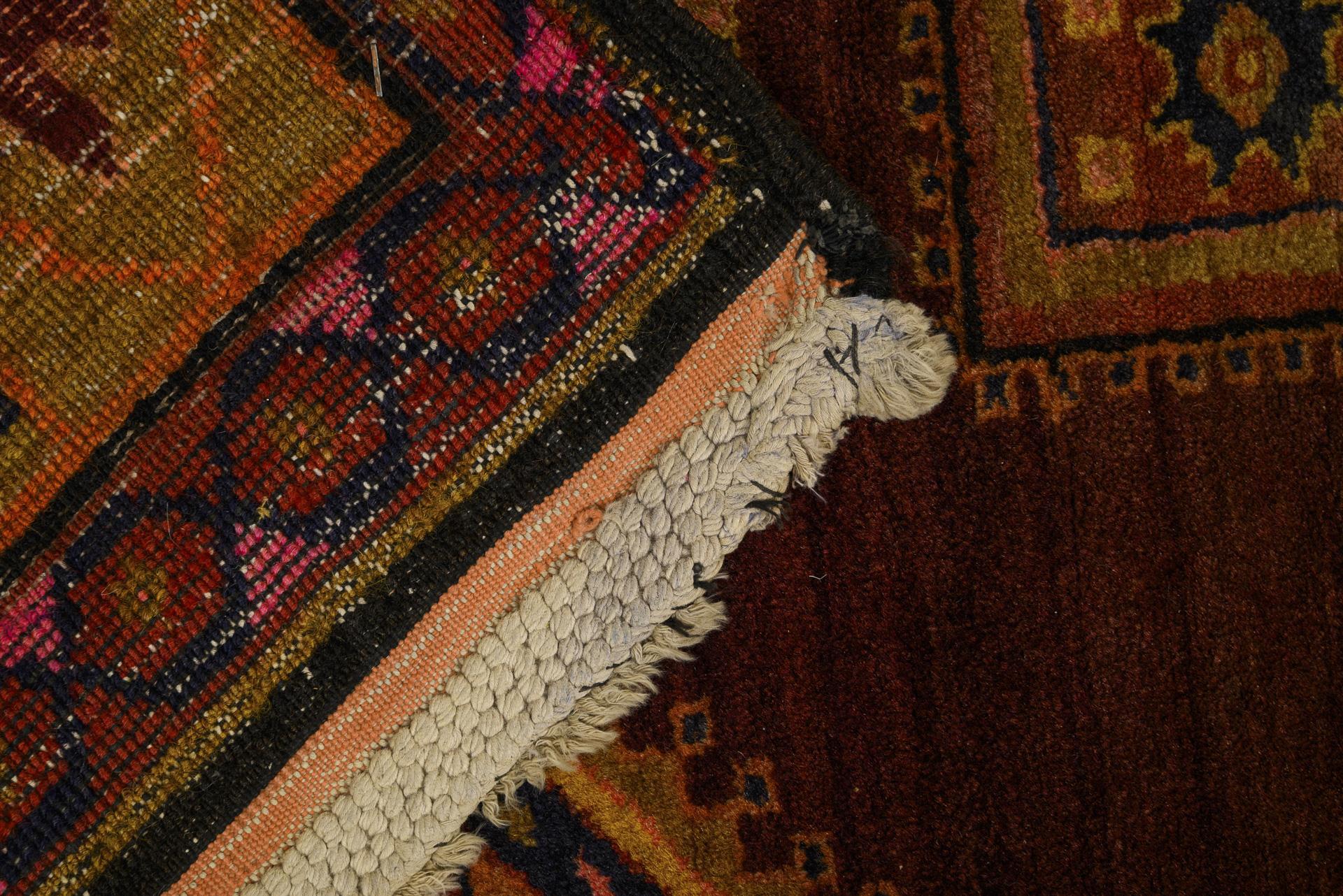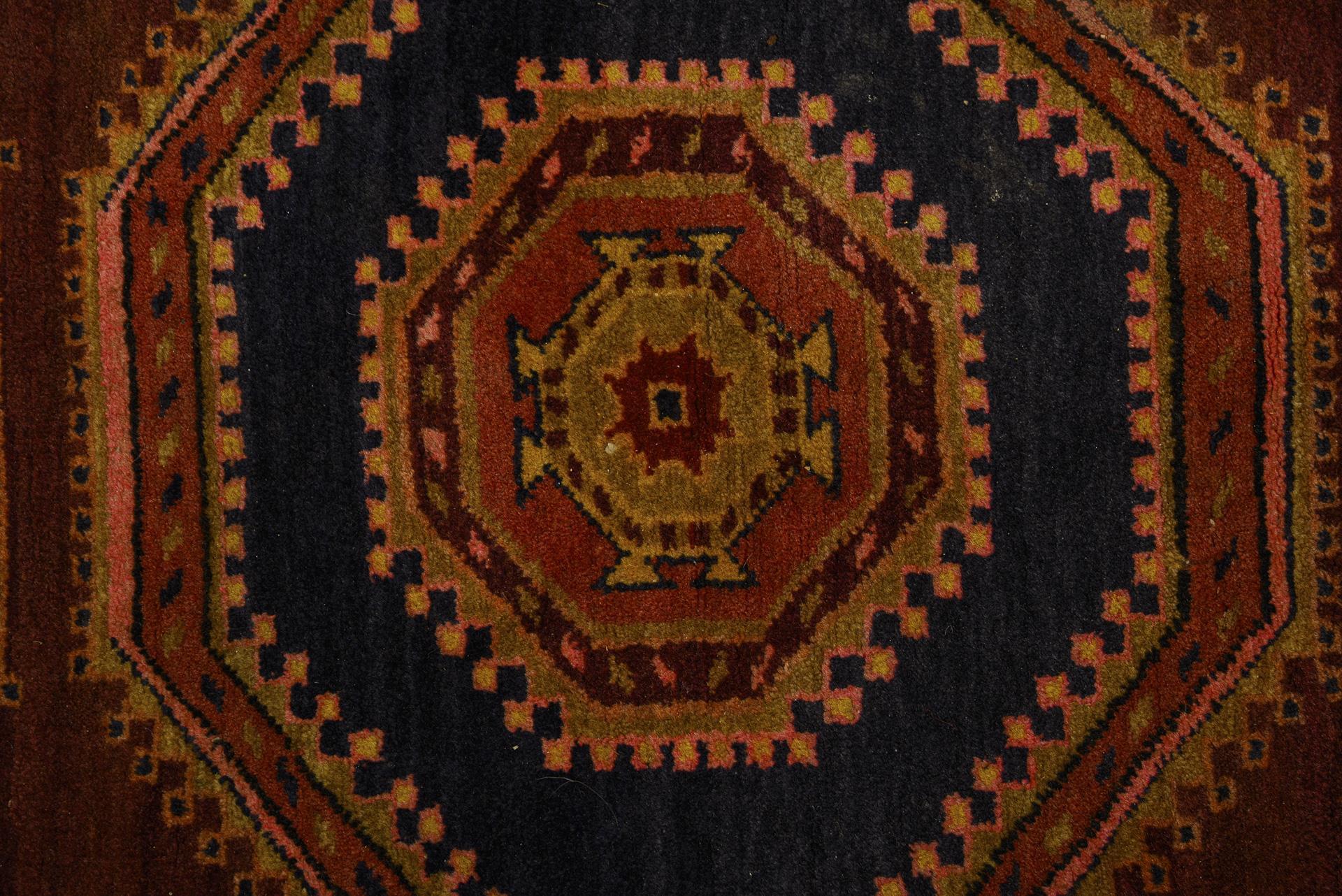 Wolle, handgeknüpft. Polychromdekor mit dominierendem Violettrot, Pink, Gelb und Grün, mit Abrasch. Ca. 207 x 123 cm.