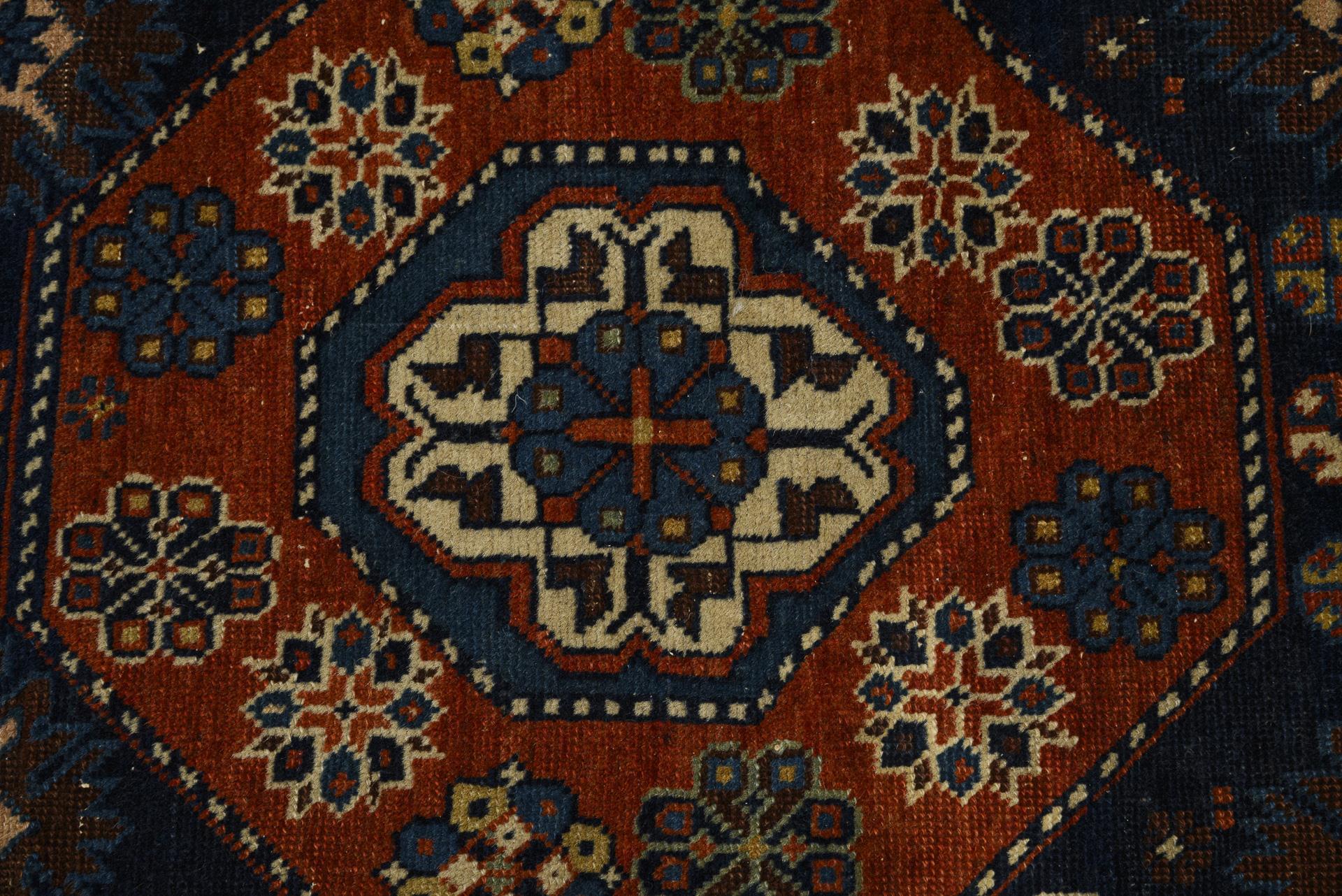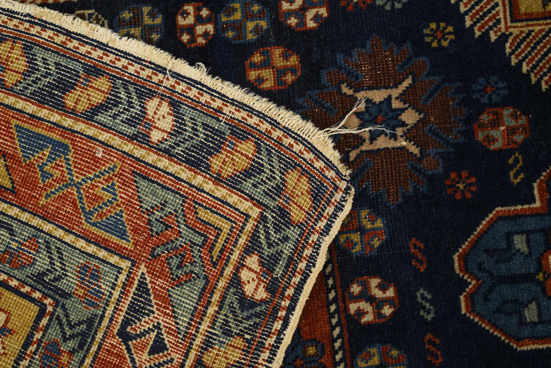Oktogonales, rotes Medaillon mit einer großen Blüte, begleitet von 2 großen blauen Blüten auf nachtblauem Spiegel mit stilisiertem Streublumendekor. Dreireihige Bordüre mit Blumenranken und Hakenband. Alters- und Gebrauchsspuren, fleckig, partiell leicht abgenutzter Flor, verblasstes Kolorit, defekte Schmalseitenabschlüsse.