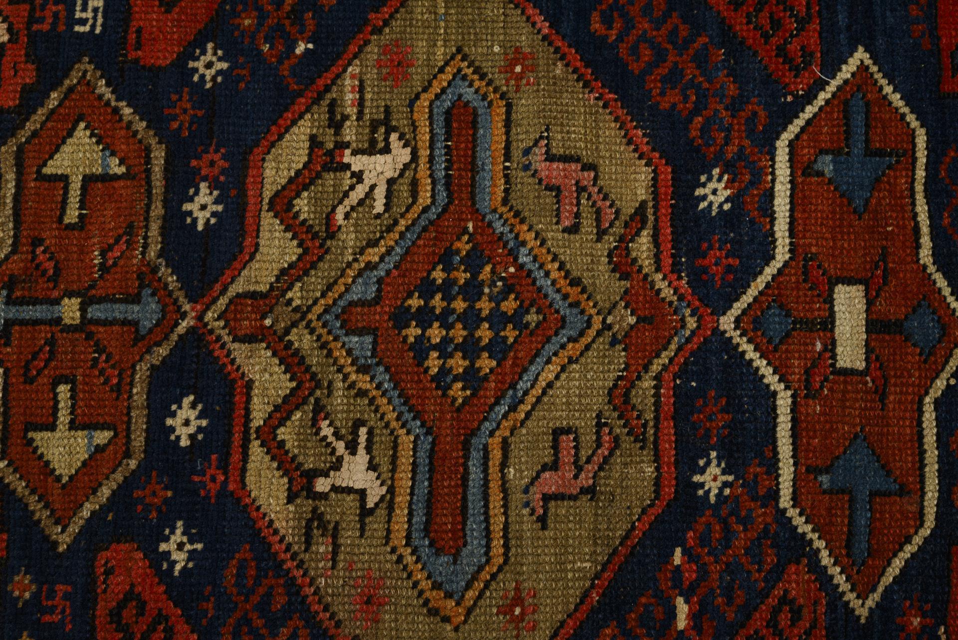 Mittelfeld mit einem Spiegel aus 3 Rauten, gefüllt mit alternierend großen und kleinen kreuz- und rautenförmigen Medaillons, umgeben von stilisierten Blüten und hakenbesetzten Ornamenten. Bordüre mit "Laufendem Hund"/Wellenbandbordüre und S-Borten. Alters- und Gebrauchsspuren, mit Defekten, kleinen Fehlstellen und Reparaturen.