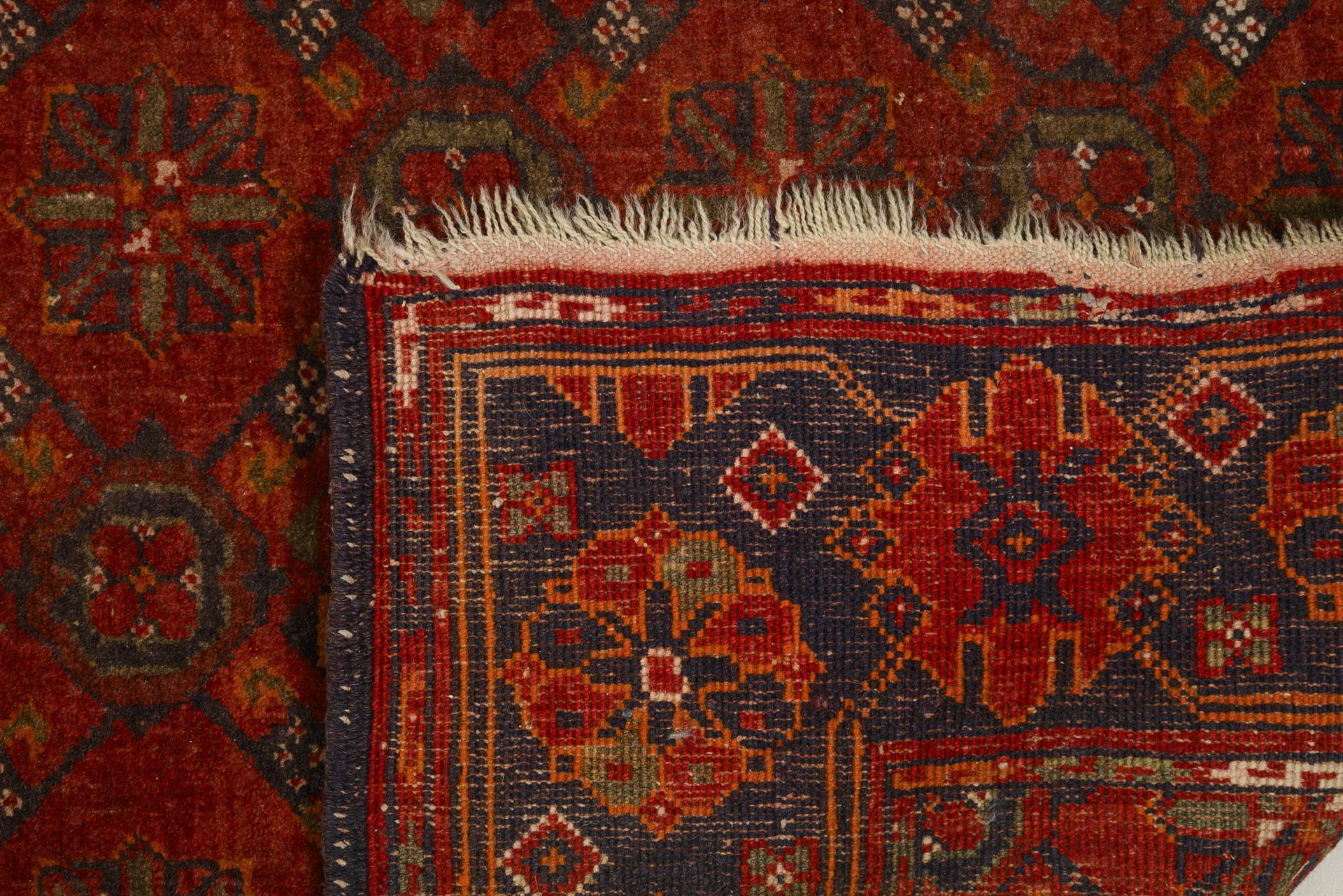 Gitterartig durchgemustertes Mittelfeld mit stilisierten Kreuzblüten und Rosetten. Breite korrespondierende Bordüre mit schmalen S-Borten. Kurze, teils defekte Fransenabschlüsse. Alters- und Gebrauchsspuren, partiell kleine Defekte, Kolorit leicht verblasst und teils verwaschen.