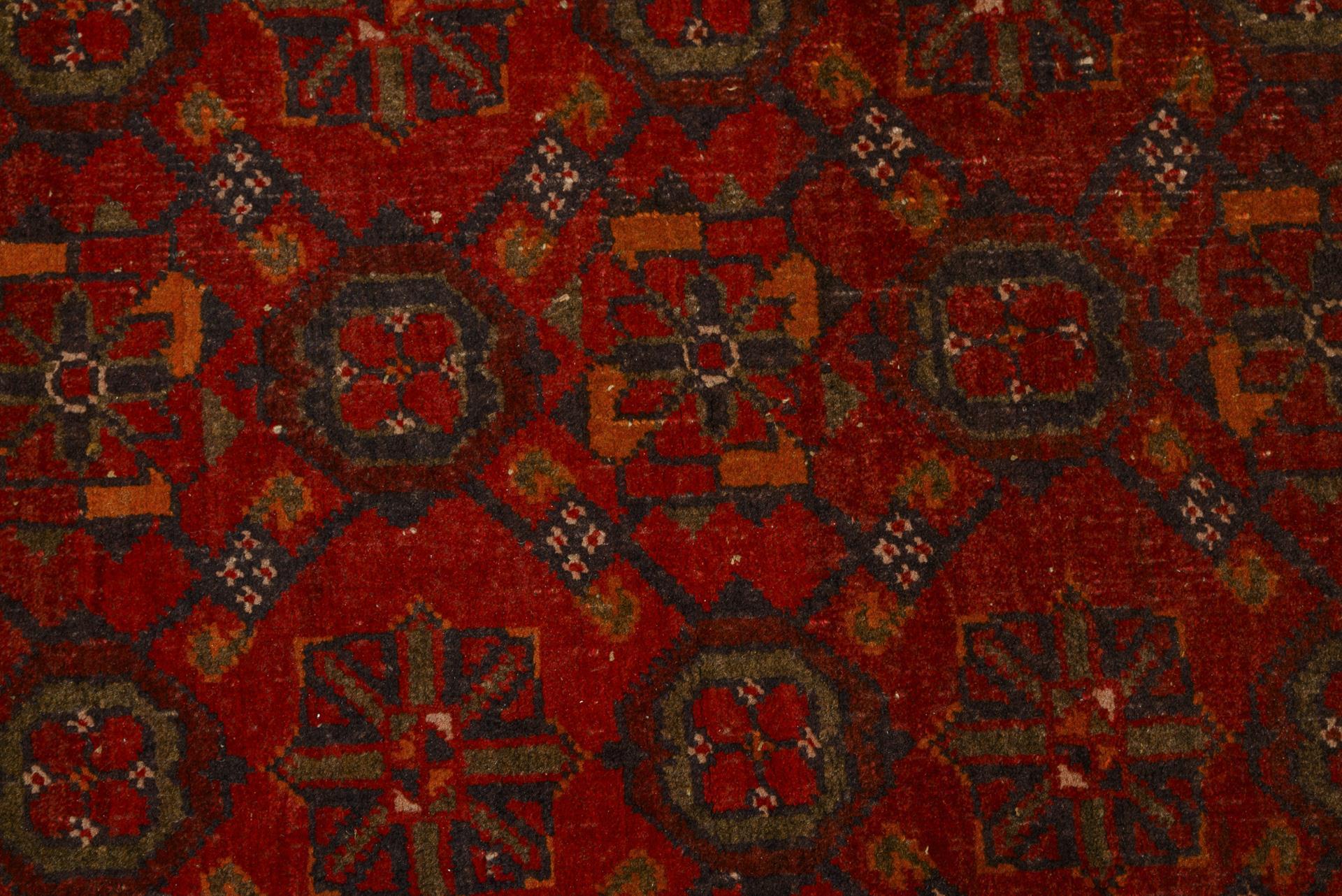 Wolle, handgeknüpft. Polychromdekor in vorwiegend Rot, Violettblau, Orange, Grün und Weiß. Ca. 188 x 100 cm.