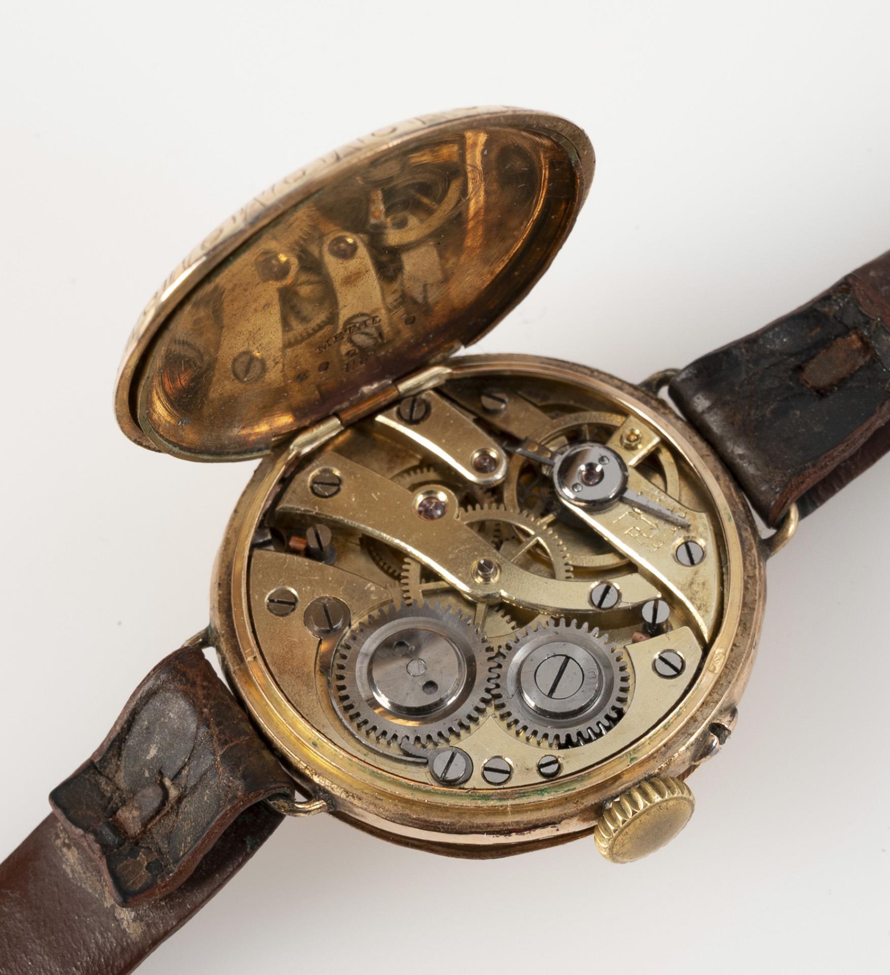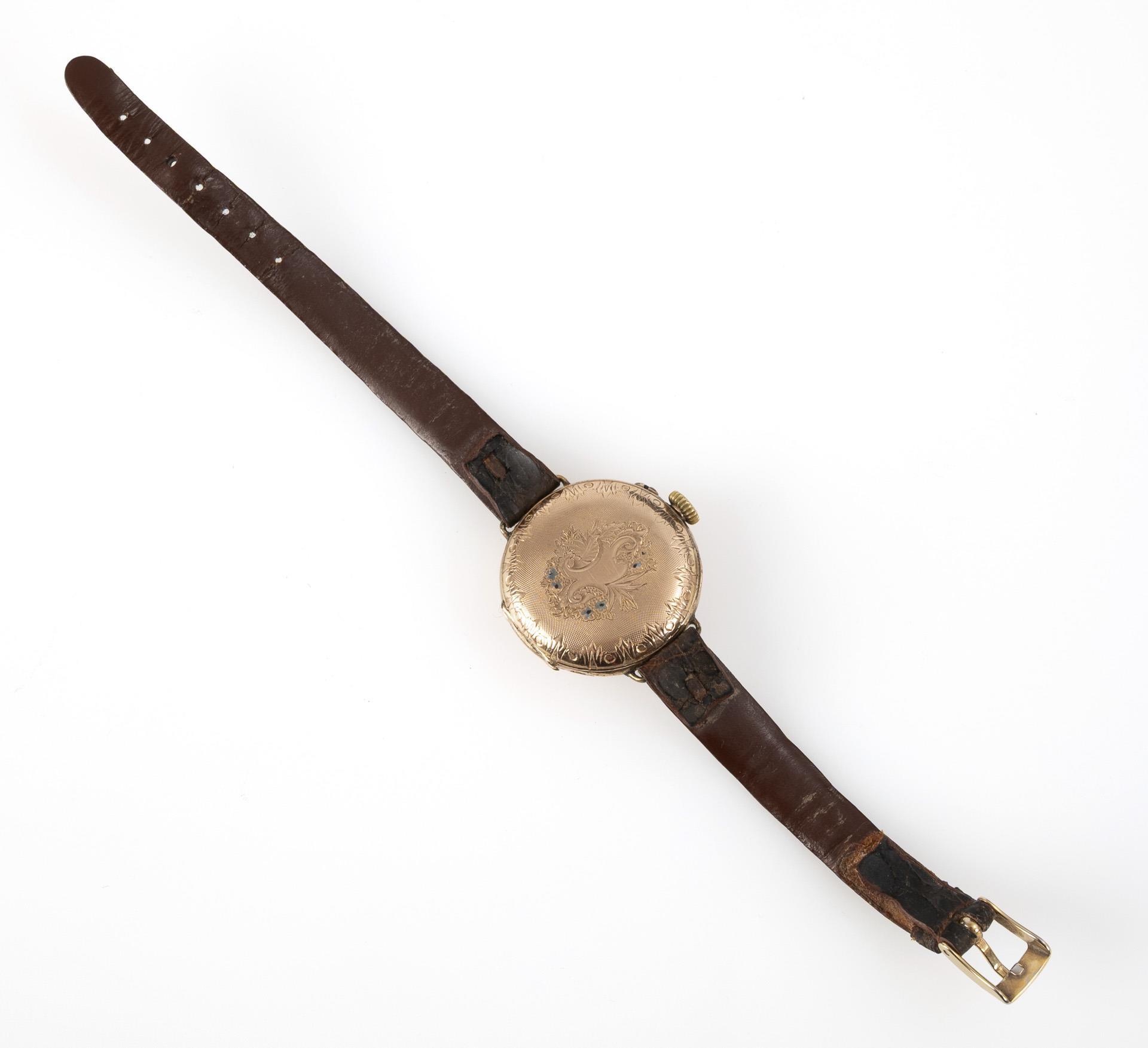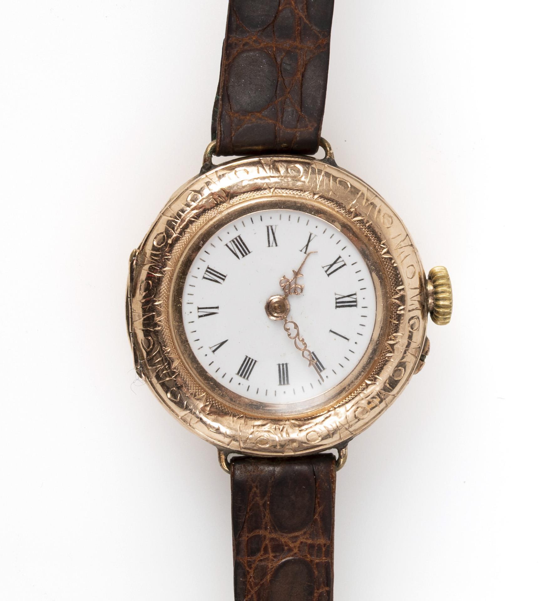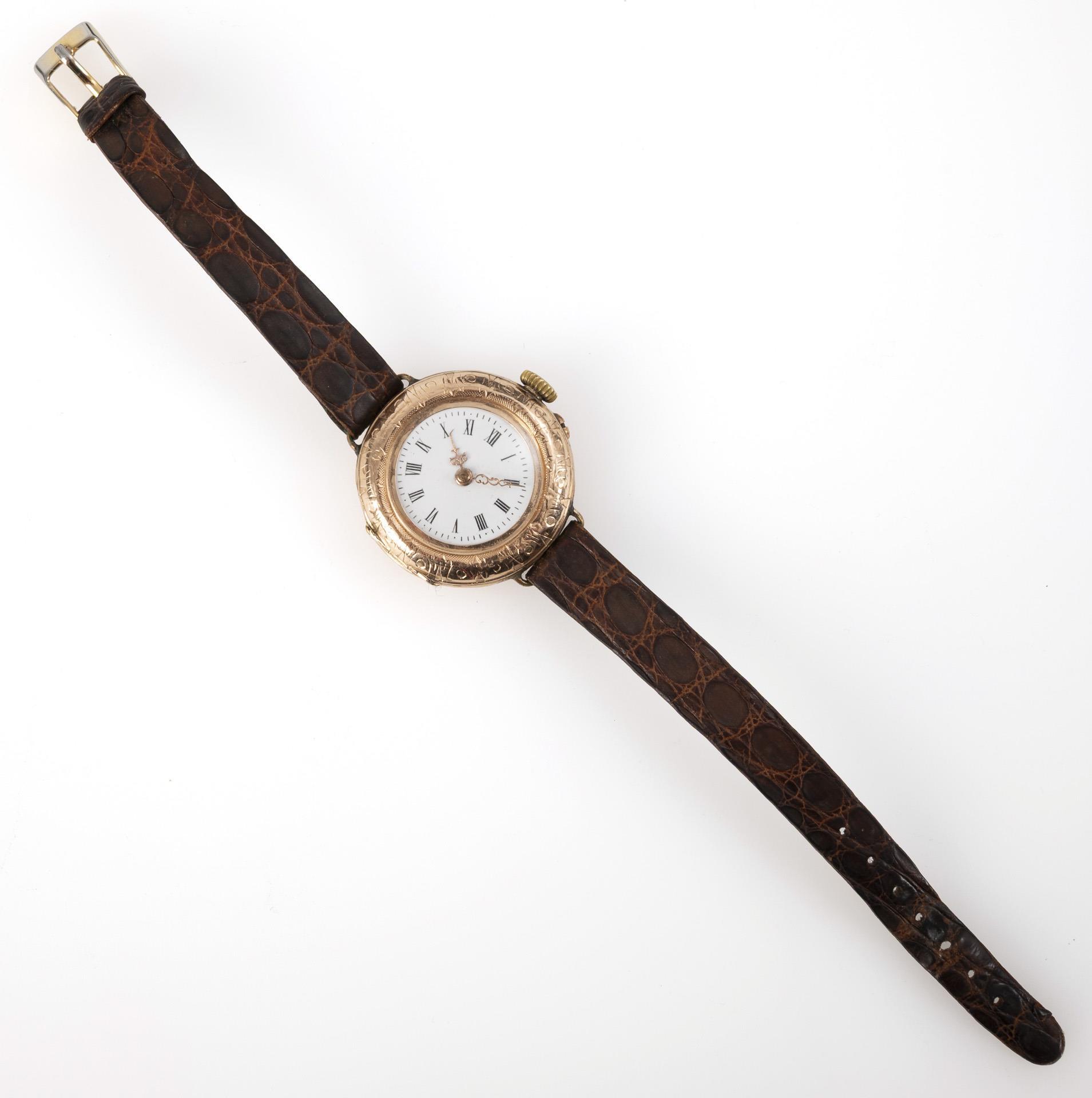 Taschenuhrengehäuse mit guillochiertem Rückdeckel mit feinen floralen Gravuren und Resten farbiger Emailblumen. Bei 3 und 9 Uhr nachtäglich angelötete Stege. An braunem Krokodillederband mit Dornschließe. Alters- und Gebrauchsspuren, kleine Dellen, Spitze des Stundenzeigers verbogen, Fehlstellen an Emaillierung.