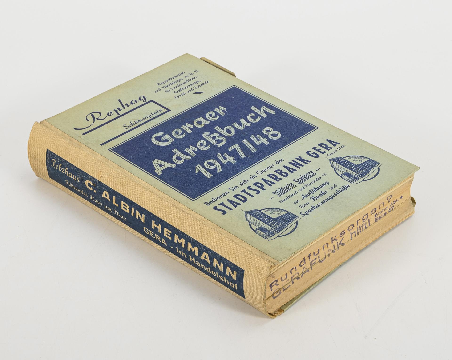 51. Ausgabe, Erscheinungstag 1. Mai 1947. Einwohnerbuch der Stadt Gera. Mit Aufstellungen über Firmen, Einwohnerverzeichnis, Straßenverzeichnis, Bezugsquellenverzeichnis und Behörden. Im Halbleineneinband. Gebrauchsspuren.