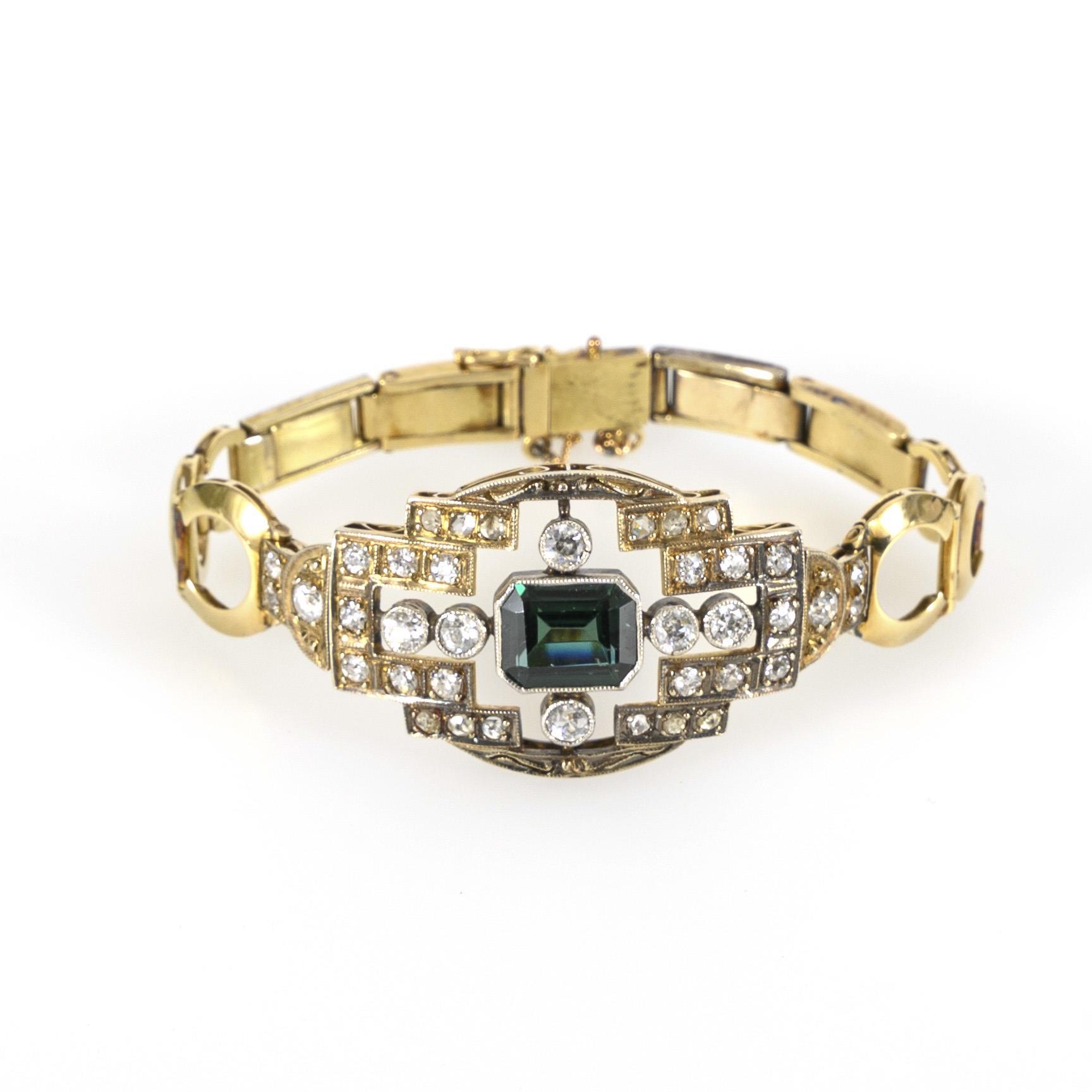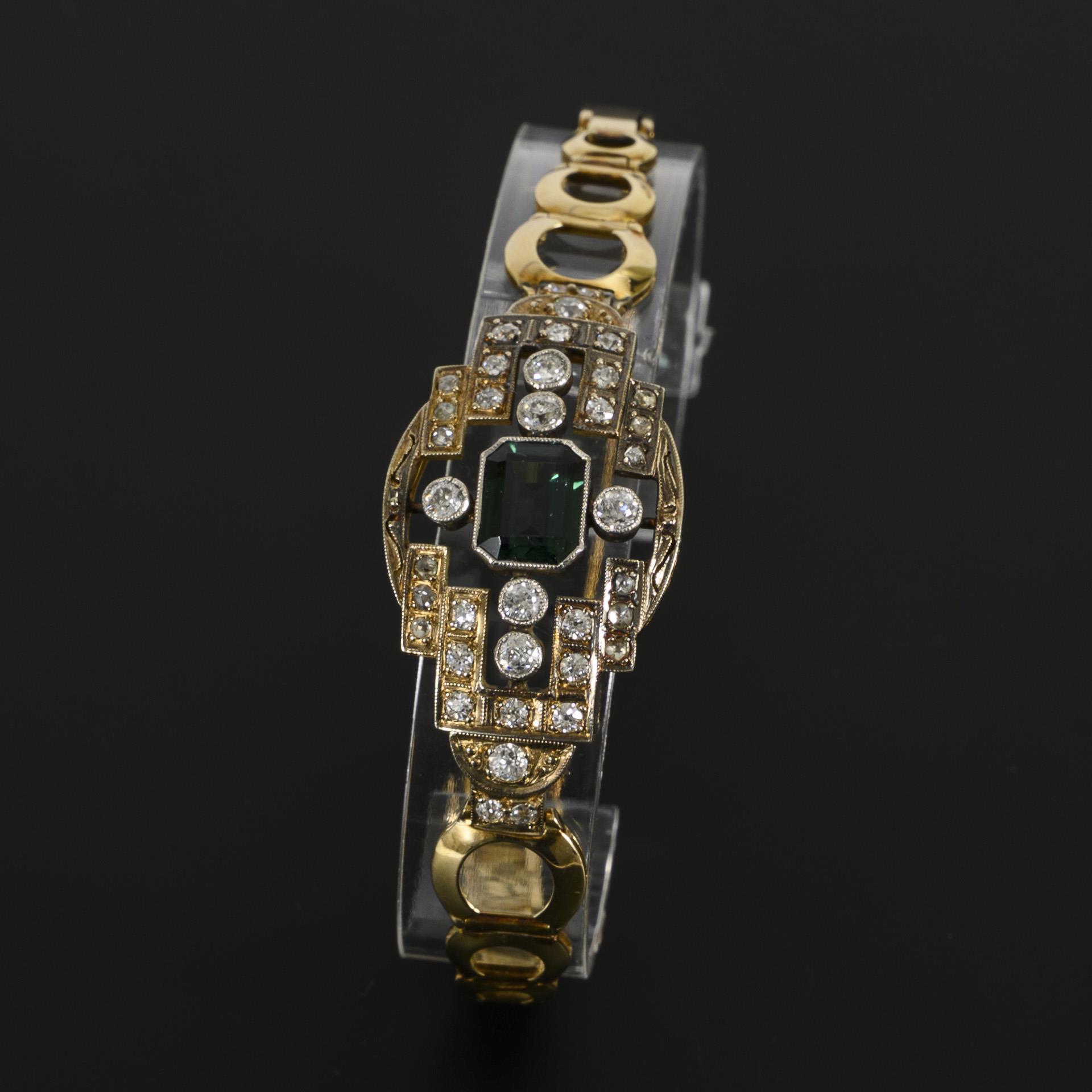 Opulentes, zweifarbiges Armband aus der Zeit des Art déco mit einem zentralen grünen Farbstein, wohl Turmalin, im Smaragdschliff, umgeben von einem geometrischen Besatz aus Altschliff-Brillanten und kleinen Diamanten im Rosenschliff. Die Fassungen zeittypisch mit Millegriffes-Zier versehen, die Fassungen der größten Altschliff-Brillanten sind in Weißgold gehalten. Das Kastenschloss mit Achtersicherung und Sicherheitskettchen.