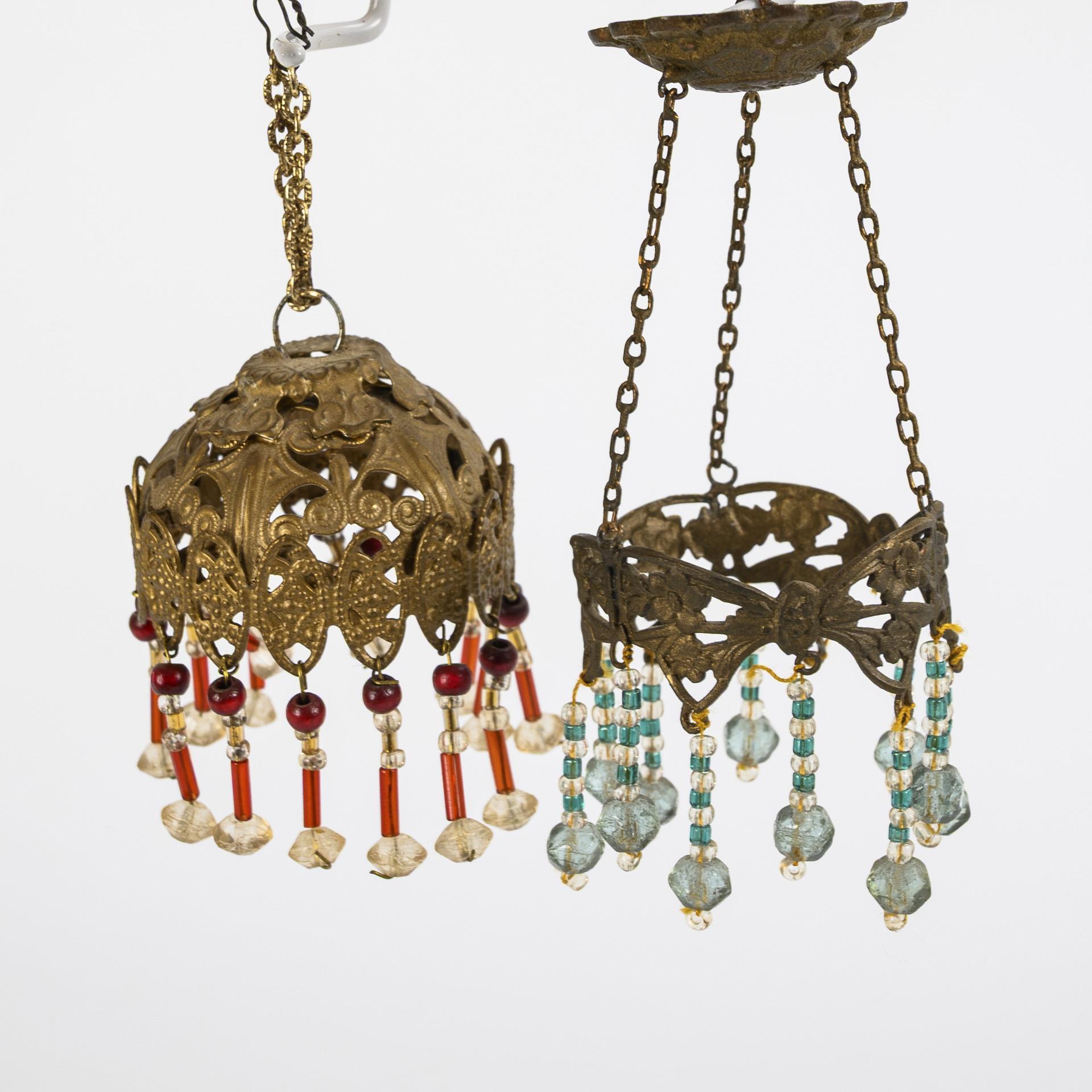 Verschiedene Lampen, einige mit Glasperlenbehang. Teils leichte Altersspuren.