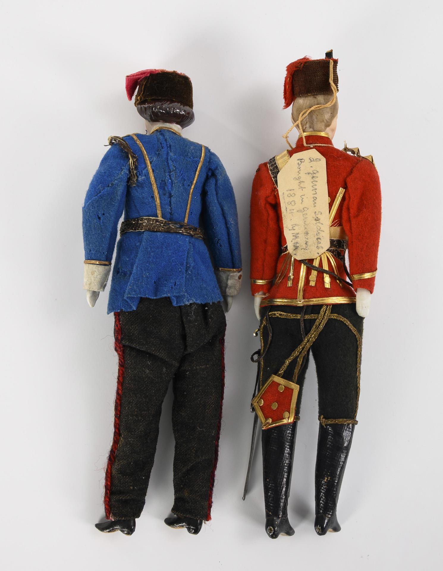 Beide mit Brustkopf, Schnurrbart, Stoffkörper, Biskuitarmen und originaler Uniform aus Filz. Altersspuren.