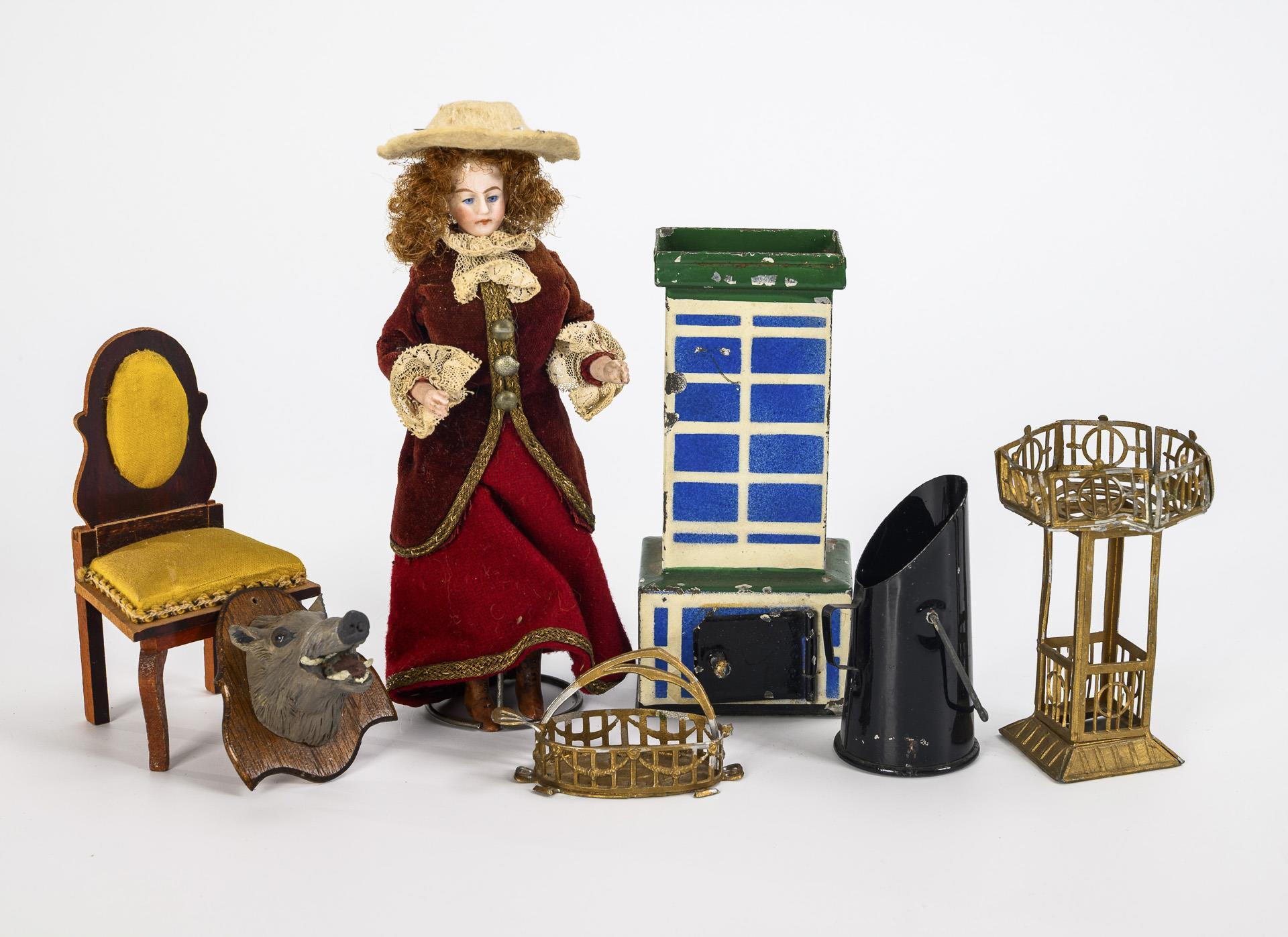 9 Möbel in verschiedenen Stilen, Art Déco-Blechofen, Waschschüssel in Gestell, Blumentisch etc. Dazu kleine Puppenstuben-Dame mit Hut (L 16 cm). Altersspuren, Defekte.