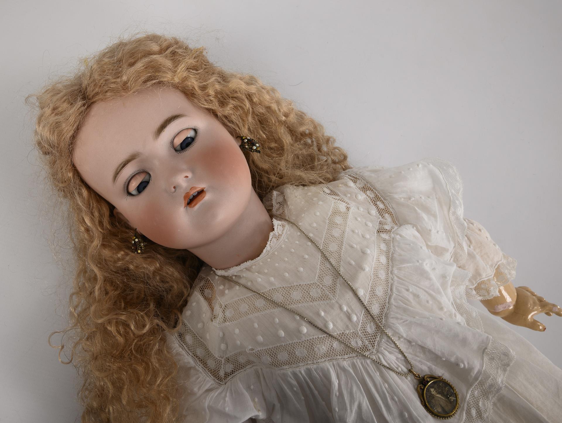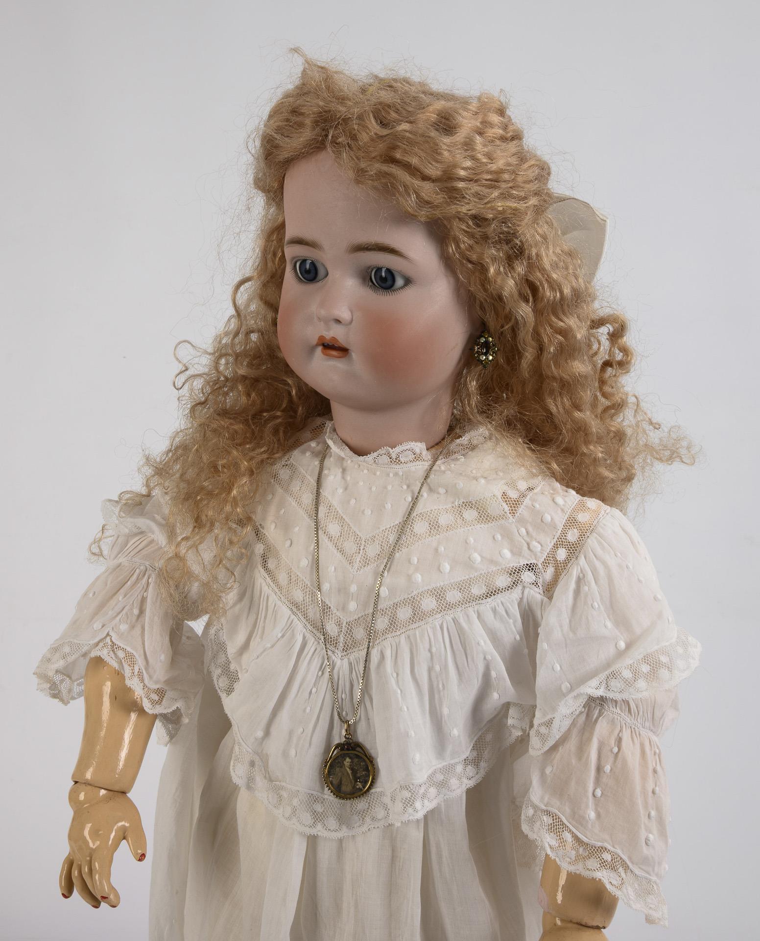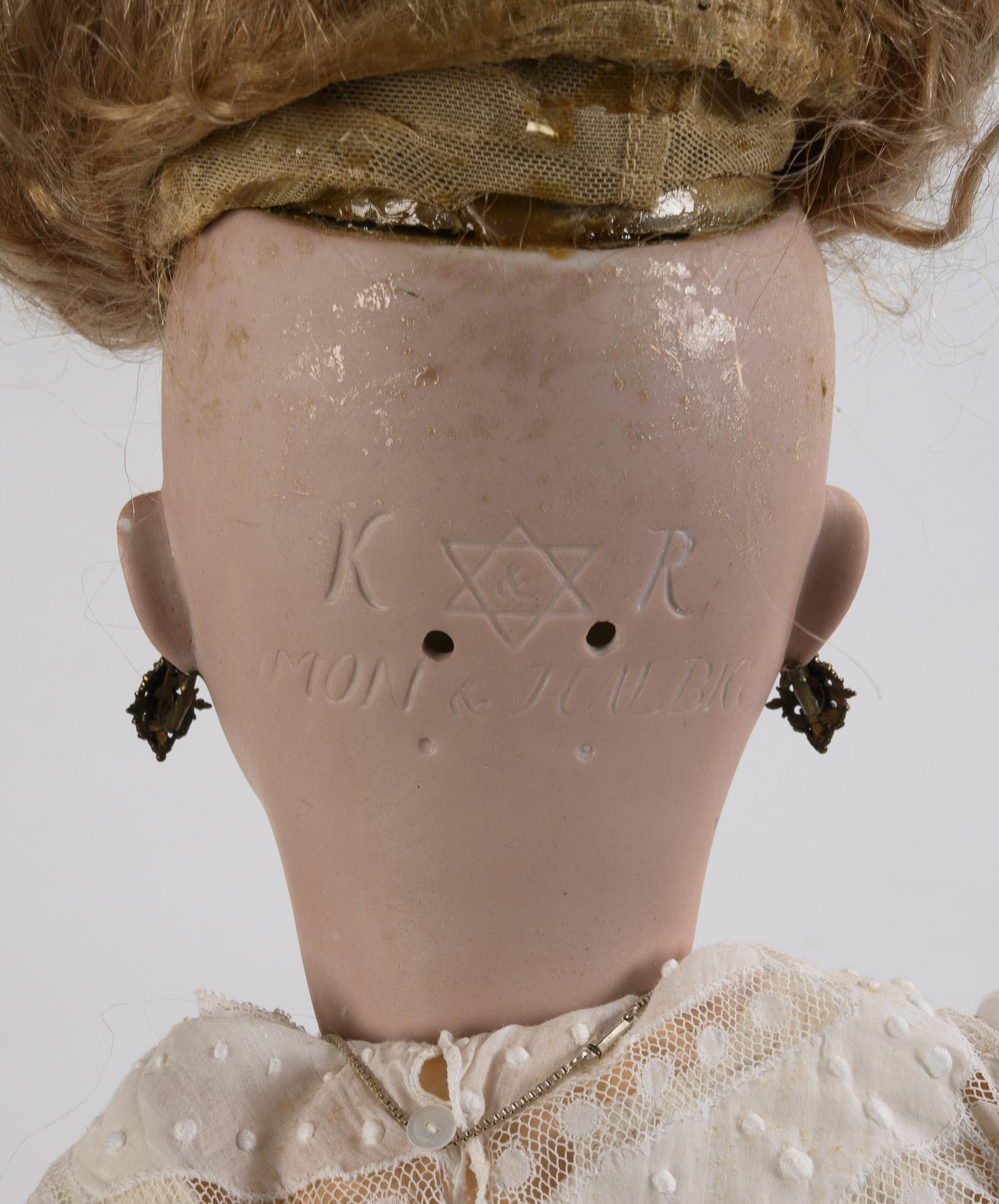 Kurbelkopf, blaue Schlafaugen, Ohrringe, blonde Mohairperücke. 15-teiliger Gliederkörper. Weißes Kleid, alte Kinderschuhe. Kopfdeckel fest: nicht durchleuchtet. Ohrlöcher mit kleinem Chip, linkes Ohr mit weiterem Chip und Brandriss. Körper mit Übermalungen und Farbabplatzern.