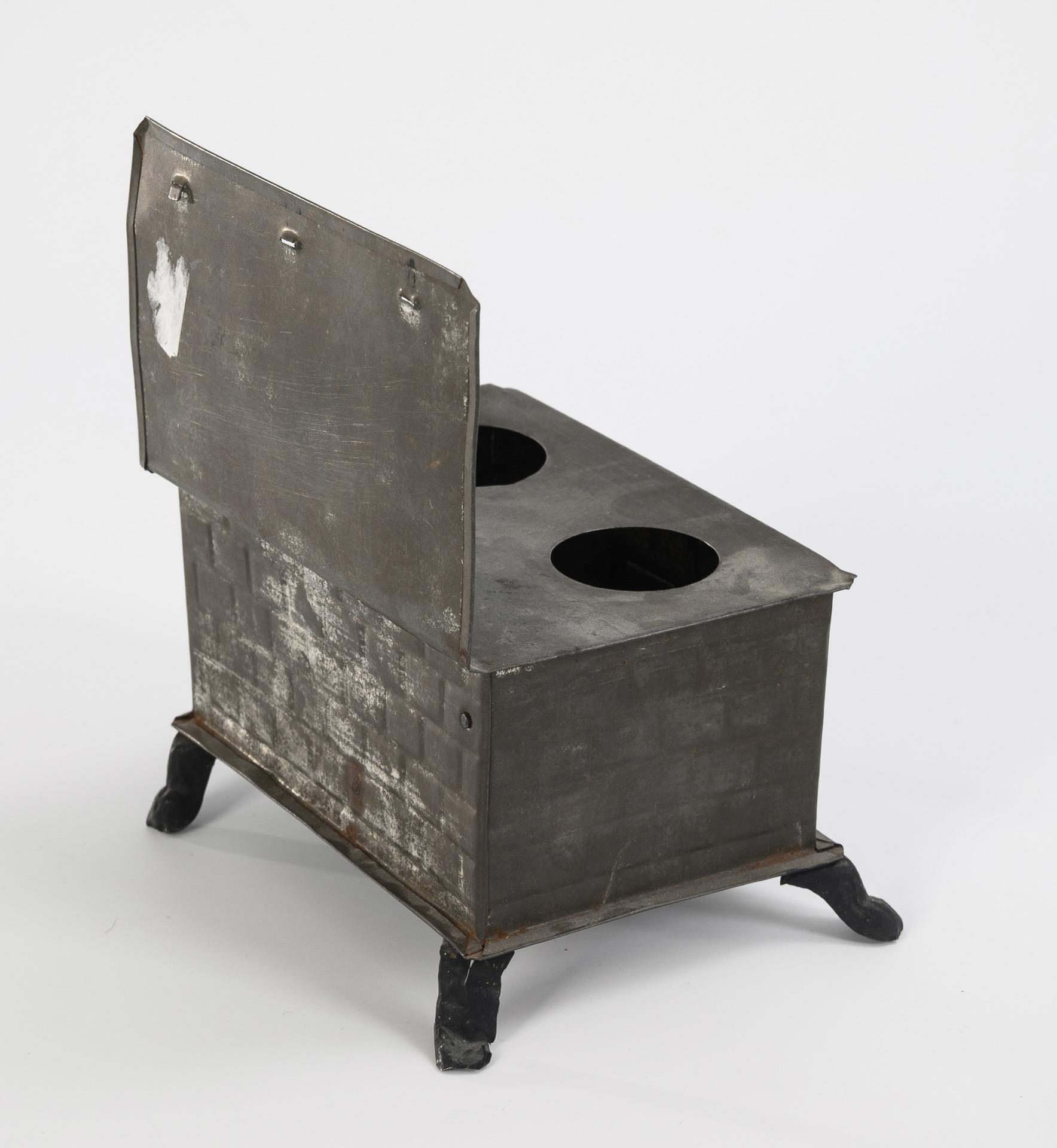 Einfacher Herd mit 2 Kochstellen (16,5 x 14 x 10 cm). Dazu blau-weißes Emaille-Geschirr, 6 graublaue Steinzeugtöpfe, ovale Brotdose, etwas Weißblech etc. Altersspuren, kleine Defekte.