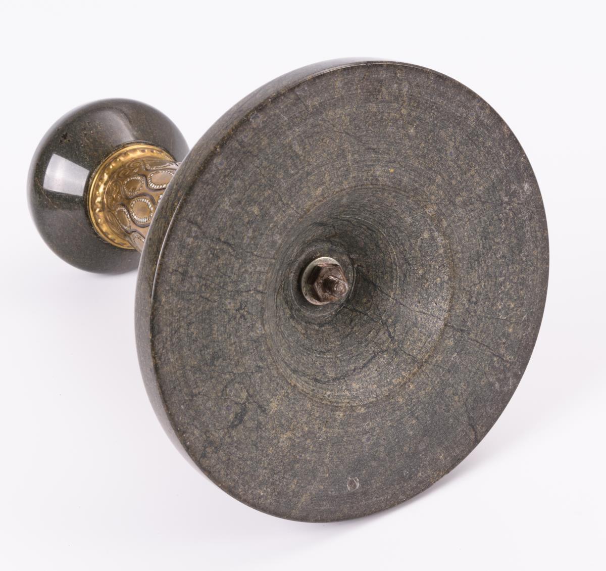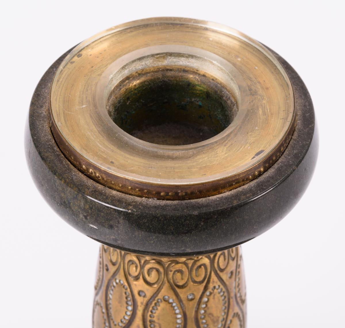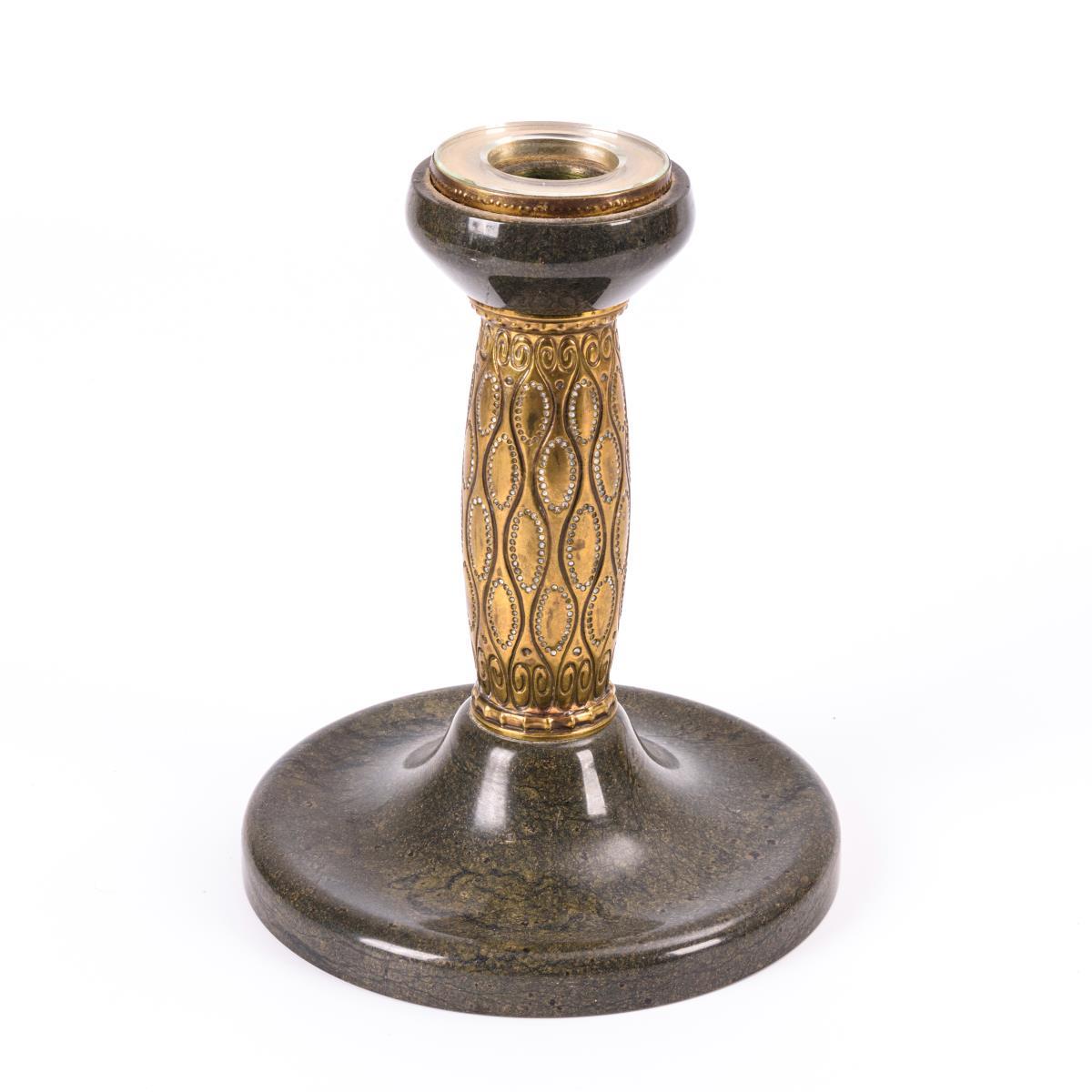 Gedrungener Leuchter in der Kombination von Steinschnitt und ornamentiertem Messing.