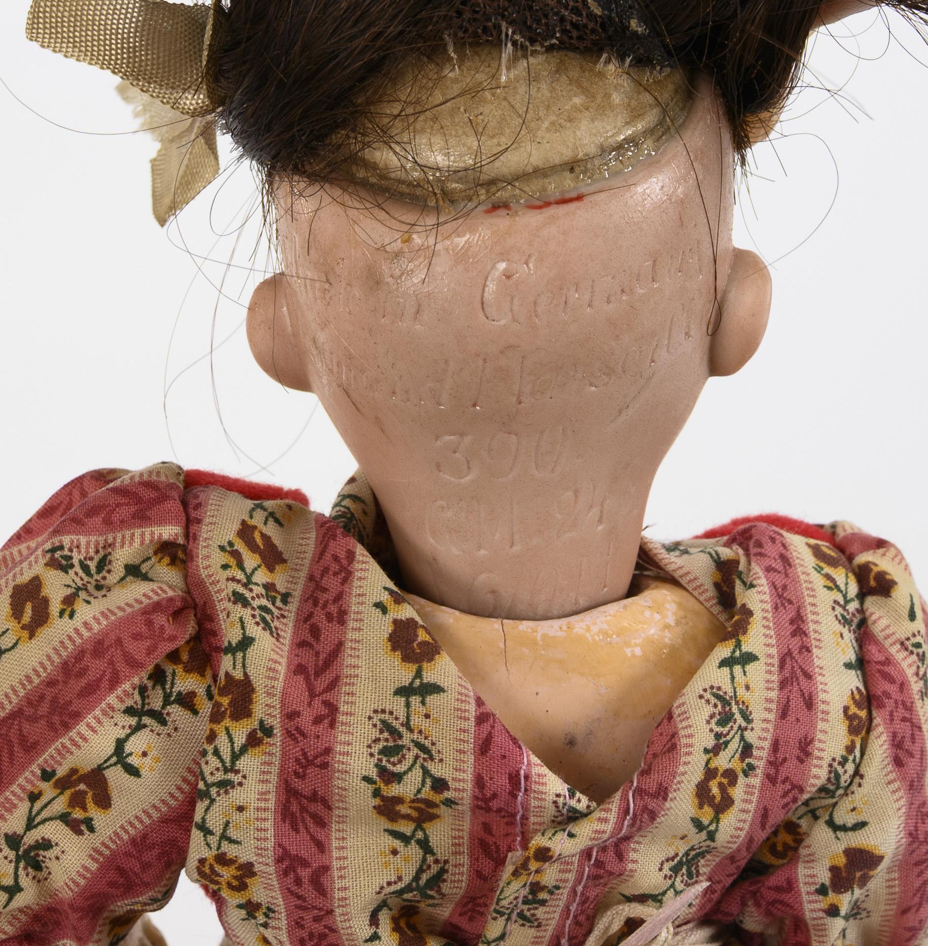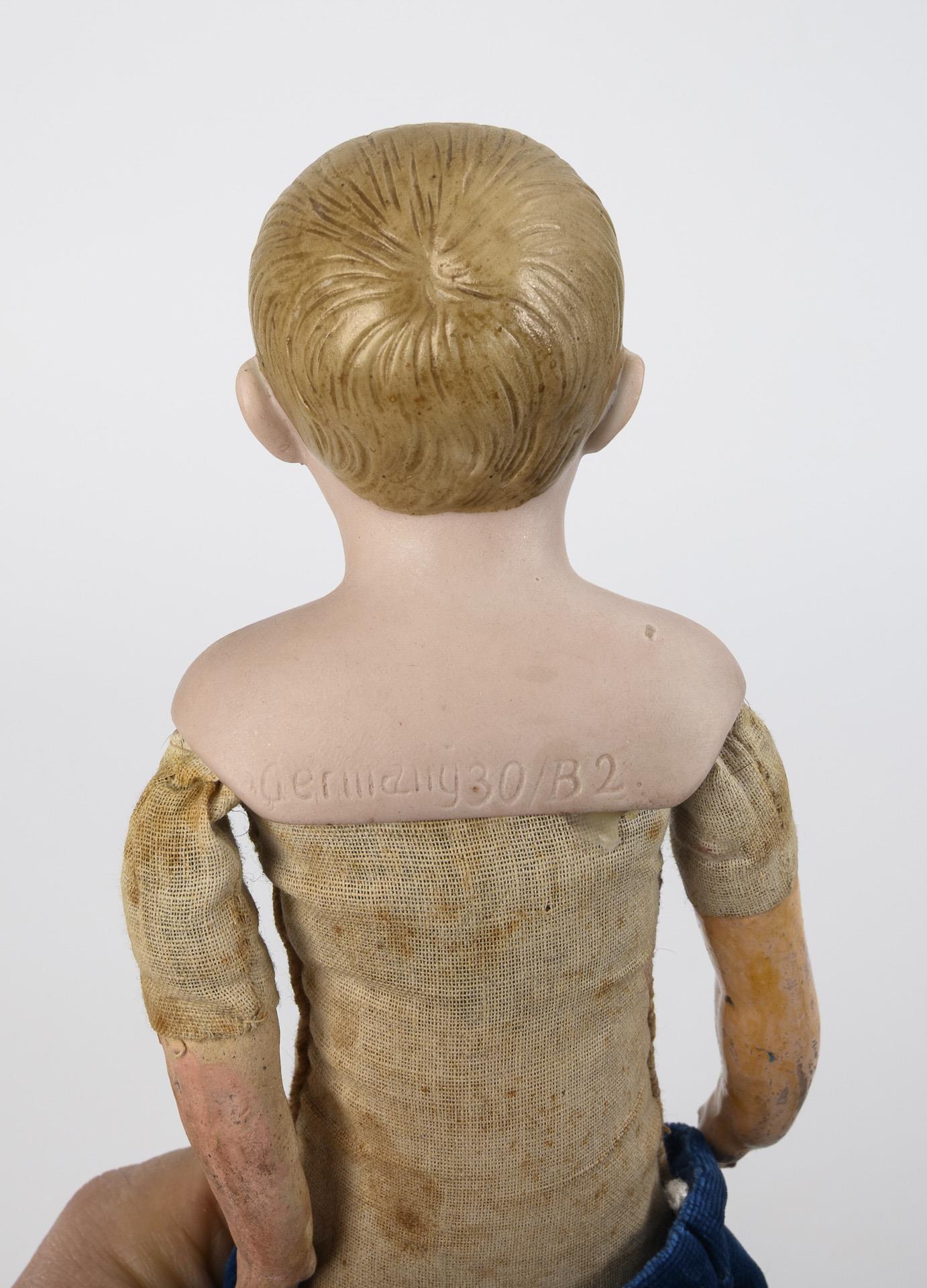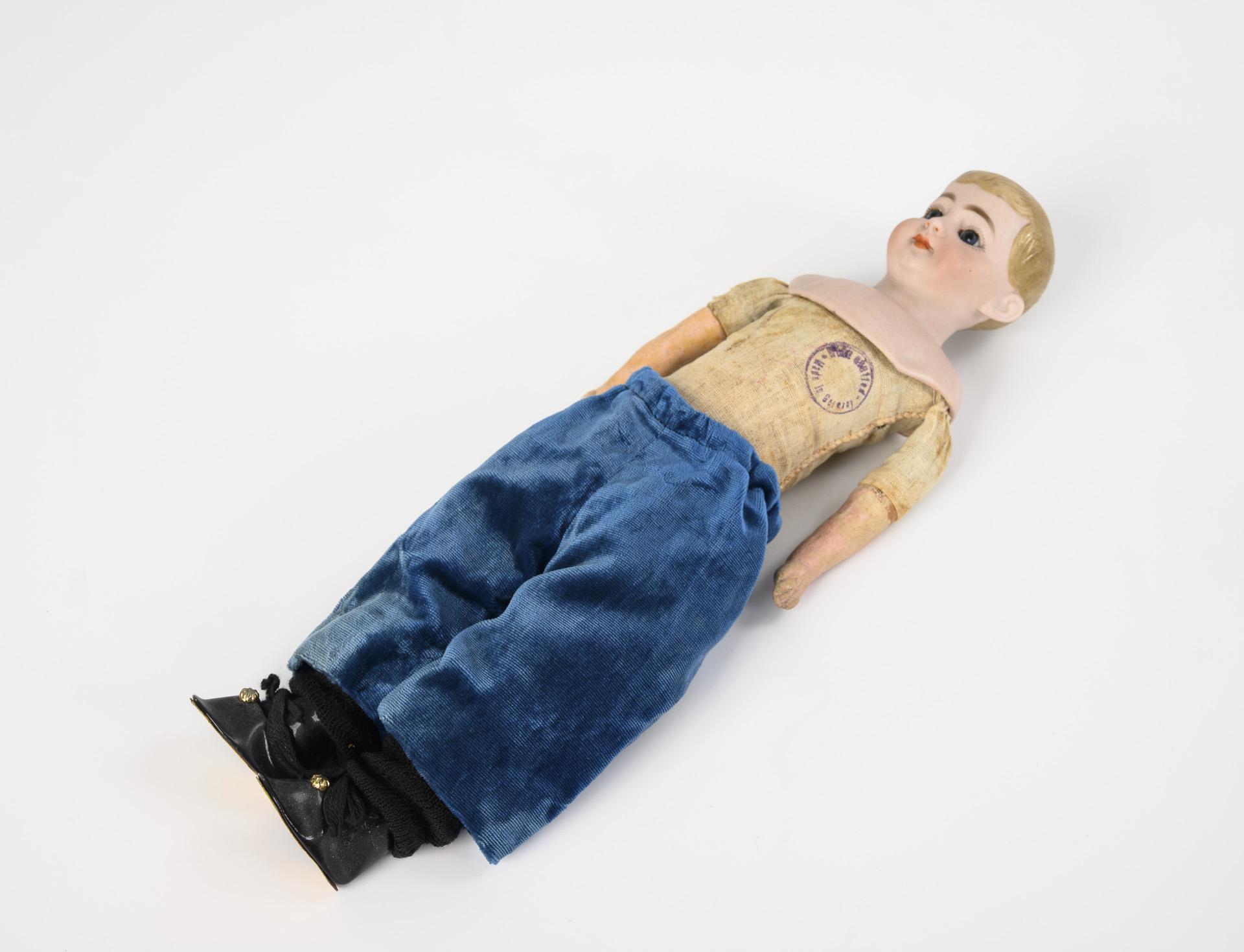 Blonder Puppenjunge (Germany 930, wohl Kling) mit Brustkopf, blauen Glasaugen, modellierten Haaren, Stoffkörper mit Kreisstempel (...stuffed, made in Germany), Massearmen und blauem Samtanzug. L 31 cm. / Puppenmädchen Armand Marseille (390) mit Kurbelkopf, blauen Glasaugen, brauner Echthaarperücke, 11-teiligem Gliederkörper und Dirndl. Kleine Reparaturstelle am rechten Augenrand. L 28 cm. Beide bespielt, mit Altersspuren.