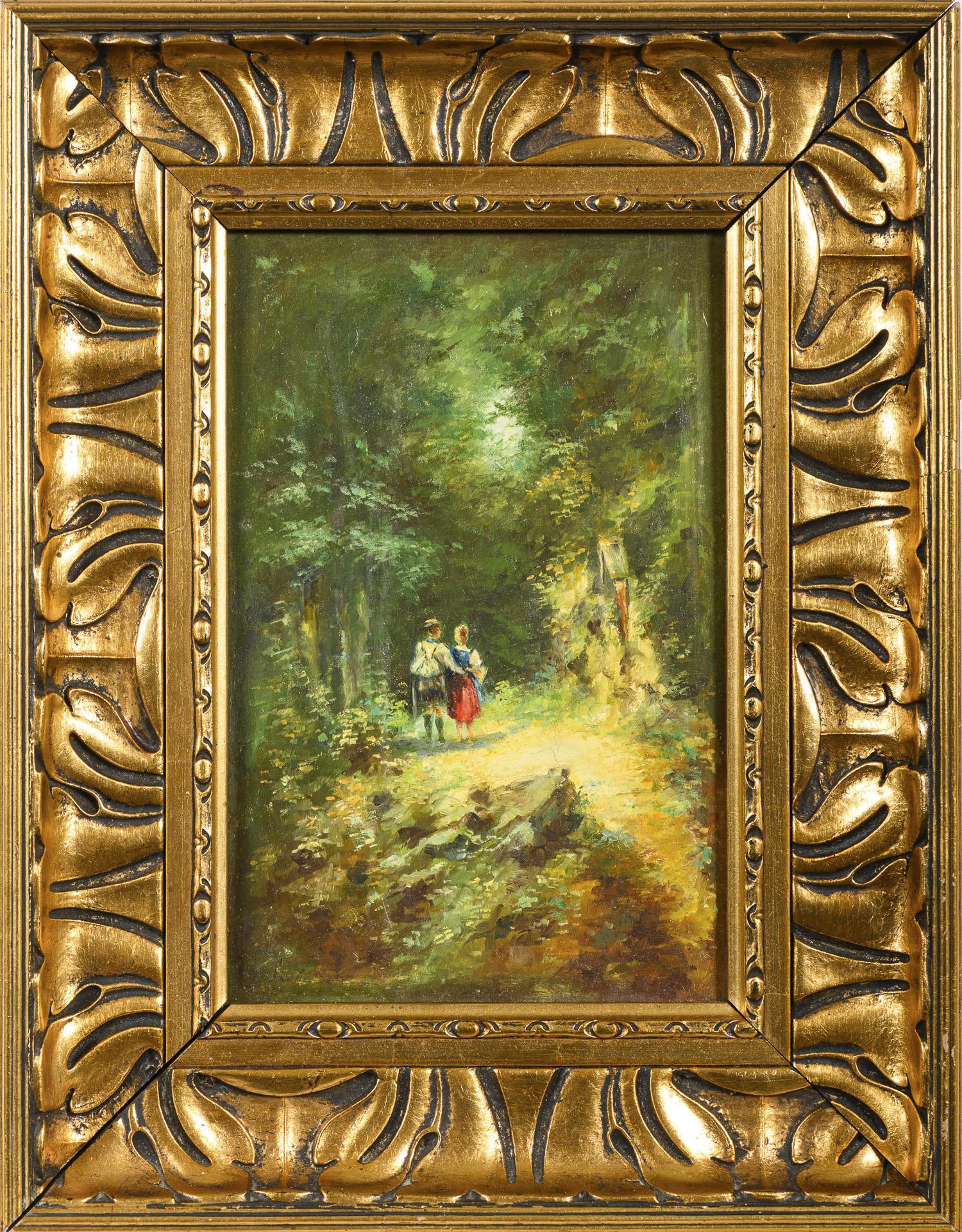 Das Paar auf einem Waldweg nahe einem Marterl im Sonnenschein.