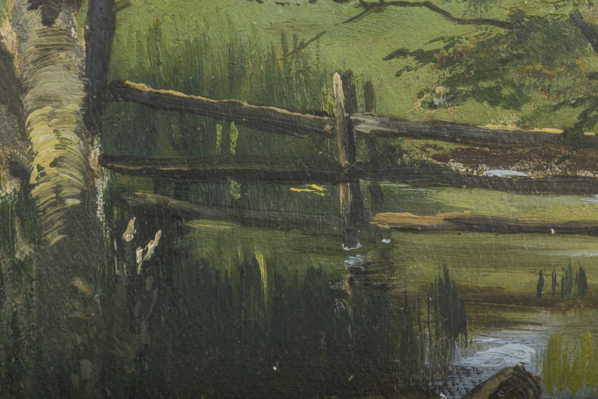 Das Gewässer zwischen hohem Gras unter sommerlichen Bäumen nahe einem Zaun. Nadellöcher in den Ecken.