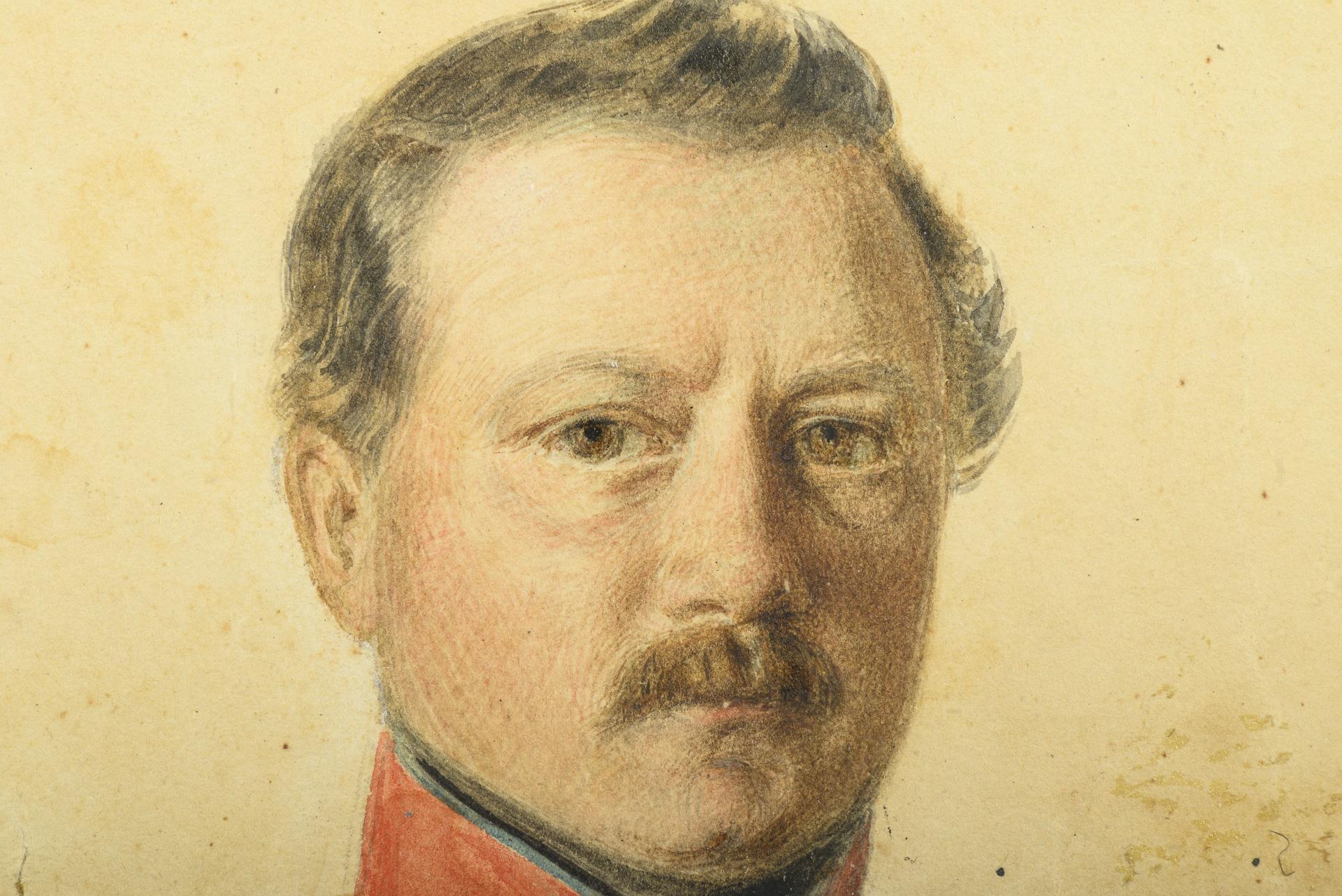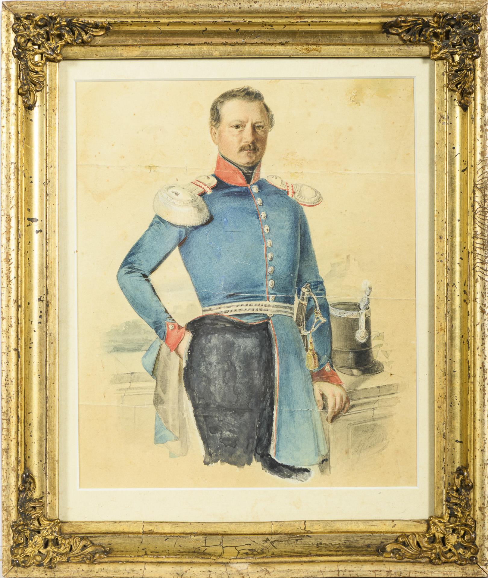 Porträt eines älteren Soldaten in blauer Uniform mit großen Epauletten. Knicke und Risse.