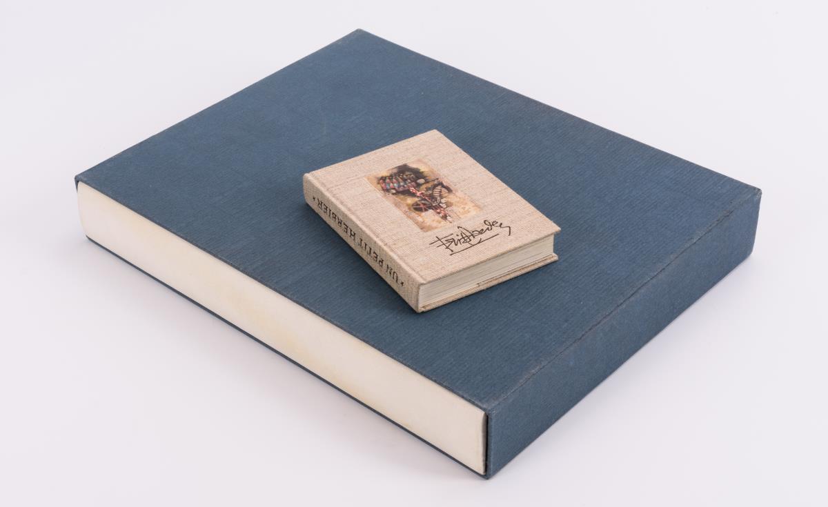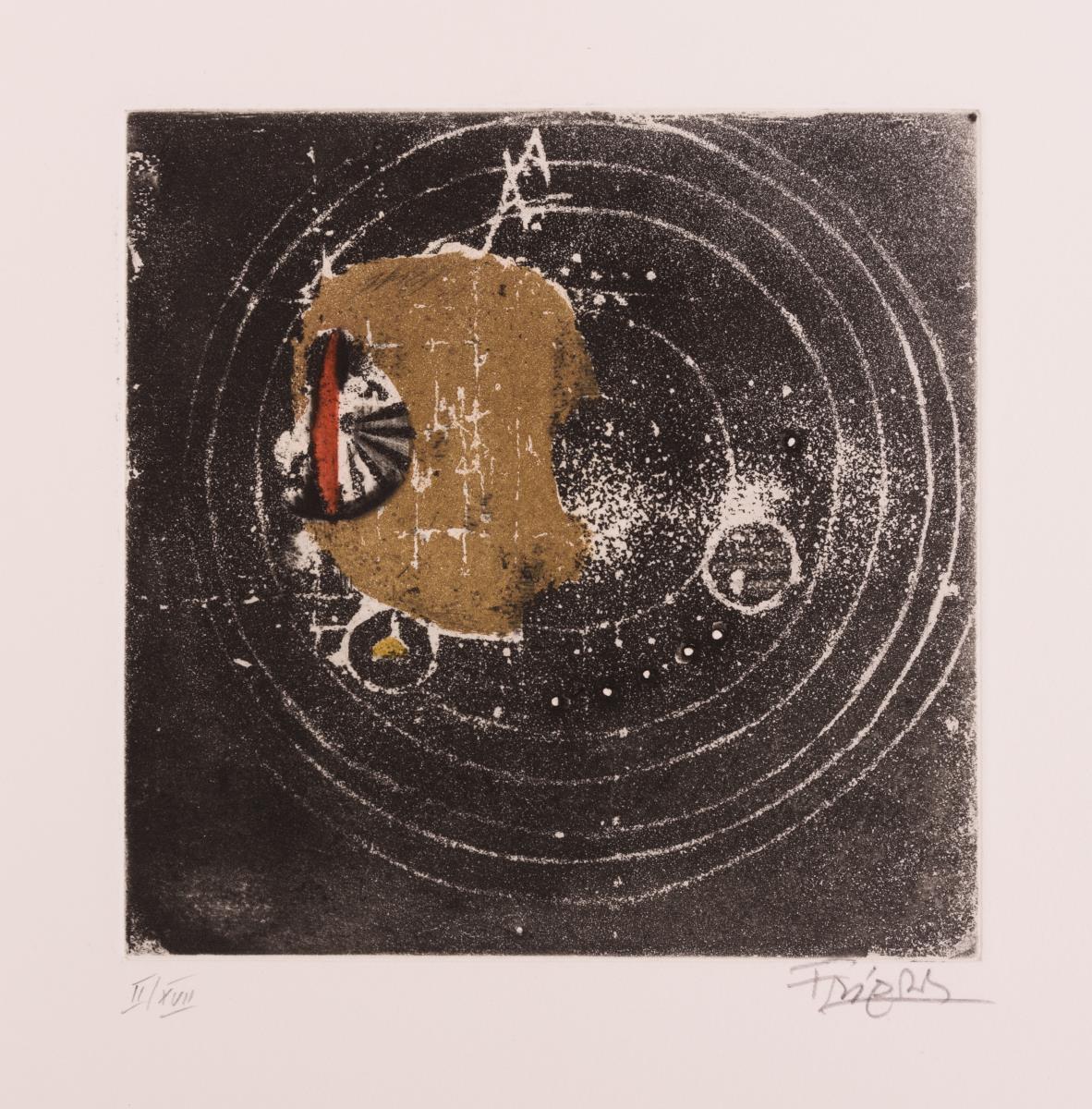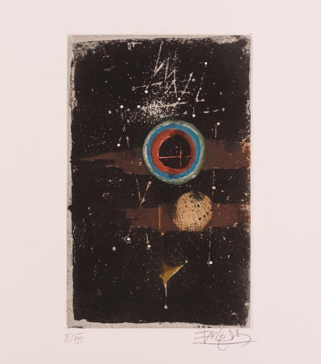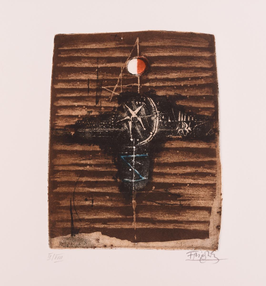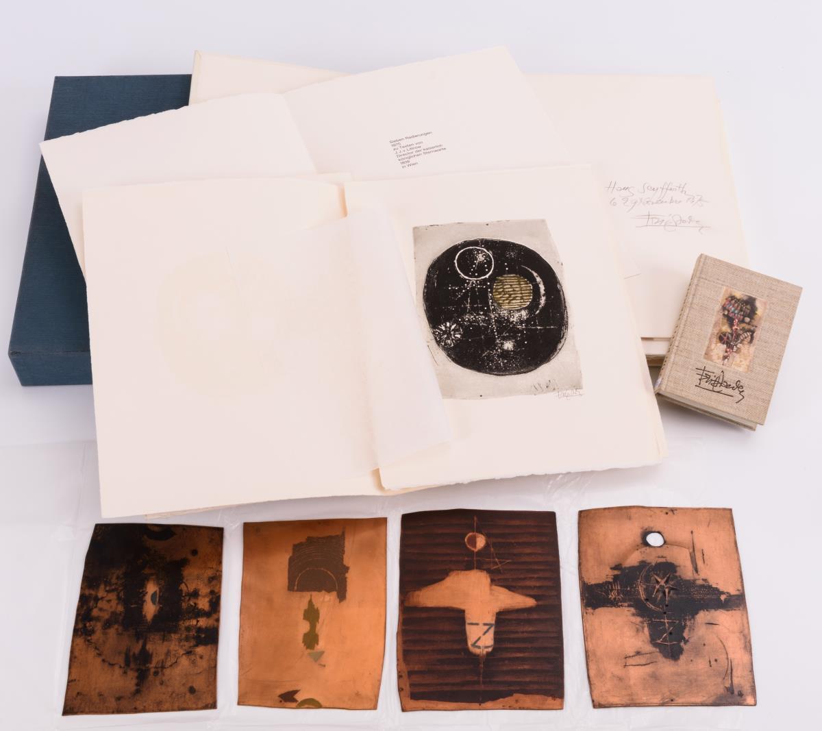 Vorzugsausgabe mit persönlicher Widmung in Original-Mappe mit Schuber: Folge von 7 handsignierten Farbradierungen auf Papier d´Arches zu Texten von J.J. von Littrow, Direktor der kaiserlich königlichen Sternwarte in Wien (1839), einer Suite mit 7 handsignierten Radierungen in Schwarz und 4 Druckplatten mit Stahlstempel "GJF" (je ca. 20 x 14 cm). Die Originalradierungen wurden unter Aufsicht des Künstlers auf der Handpresse von Georges Leblanc, Paris abgezogen; Satz aus Helvetica breitmager von Klaus Ulrich Düsselberg, Krefeld. Als Beigabe ein kleines handsigniertes Büchlein "Un Petit Herbier" mit reproduzierten Aquarellen von J. Friedlaender, 1980, mit Widmung (ca. 14,5 x 10 cm).