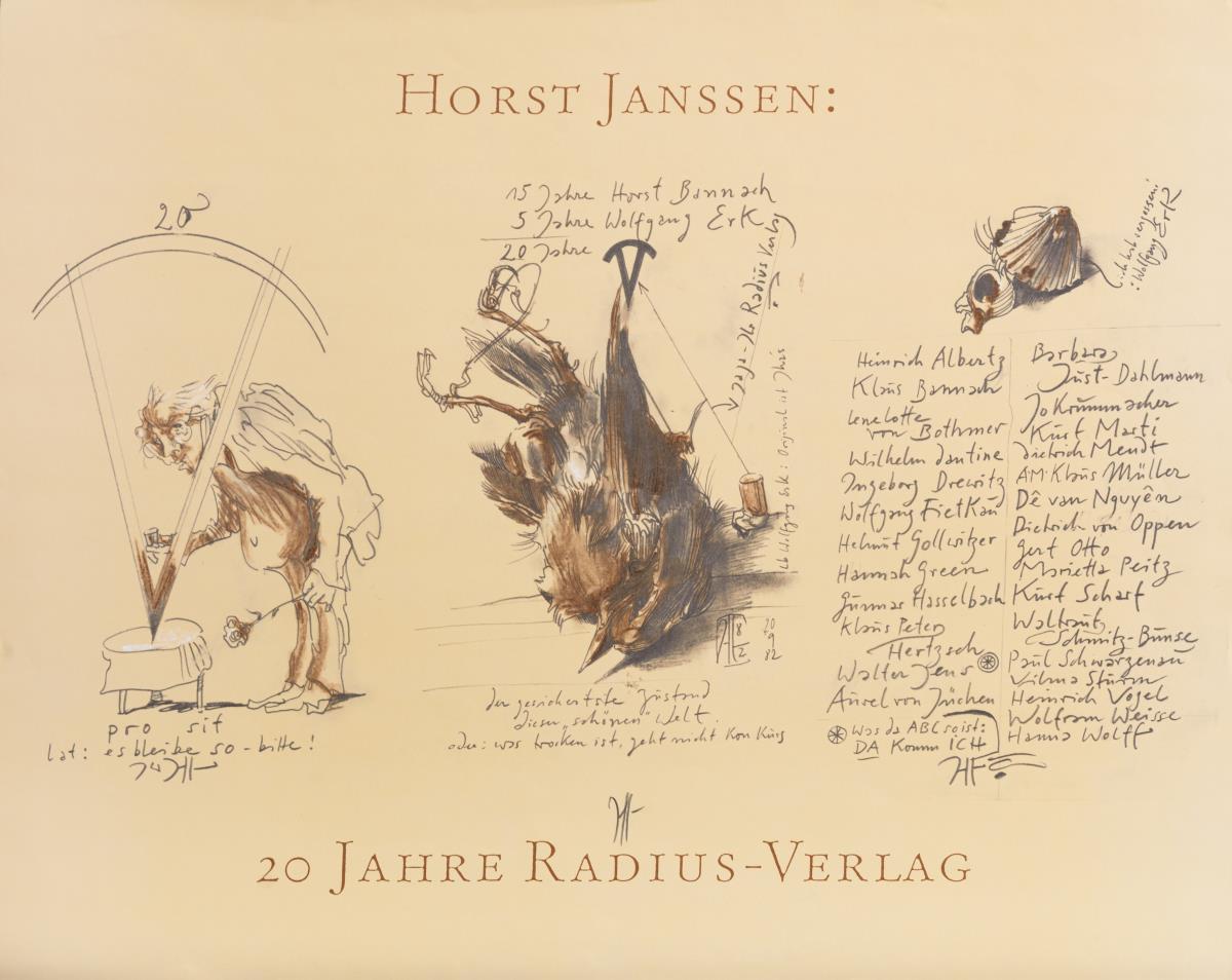 "Für Alexander Schlüter: Pfingsten"; "Horst Janssen: 20 Jahre Radius Verlag"; Atlantis: "Janssen"; Isar Galleri 1+1: "Horst Janssen: Briefe an Mirjam"; "Edition Volker Huber - Galerie v. Leo Parenti"; Atlantis: "Janssen"; Galerie Neumann: "H Janssen: Radierungen + Zeichnungen vom 30.11.79 - 31.1.80"; Thalia Theater: "Macbeth"; Galerie Seifert Binder: "Blumen für die Binderin weil: 20 Jahre!!!"; "Arsen + Spitzenhäubchen" und Galerie Peerlings: "H. Janssen Ausstellung vom 15. Nov. 77 - 30. Jan. 78". Teils mit kleinen Knicken.