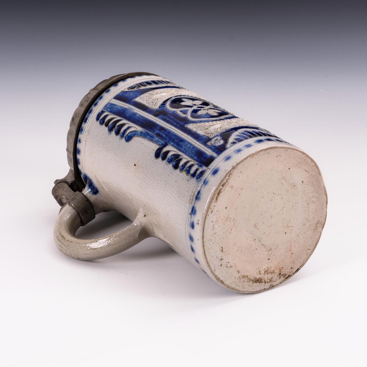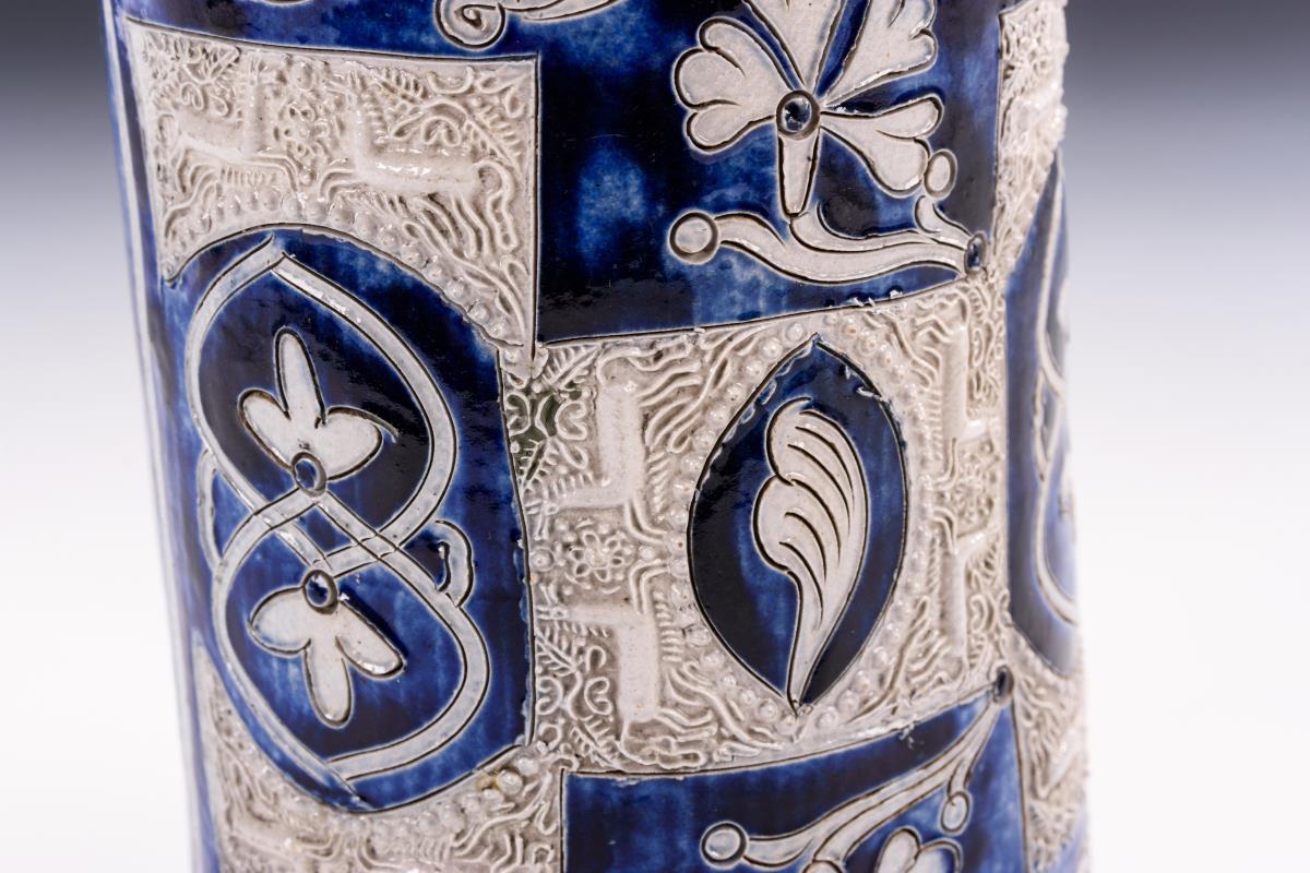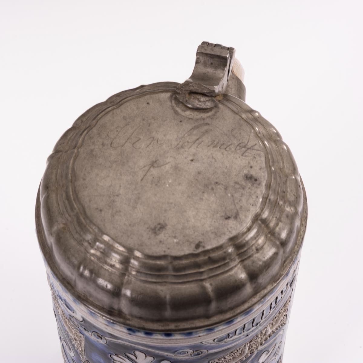 Barocker Walzenkrug mit Tiermodeln und Ritzblumen.