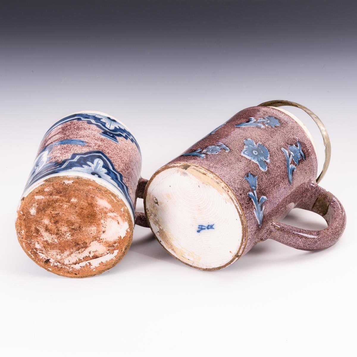 Zylindrische Krüge mit springendem Pferd (H 16,5 cm) und Kartusche mit Vogelmotiv (H 16 cm). Jeweils mit Defekten und fehlender Zinnmontierung.