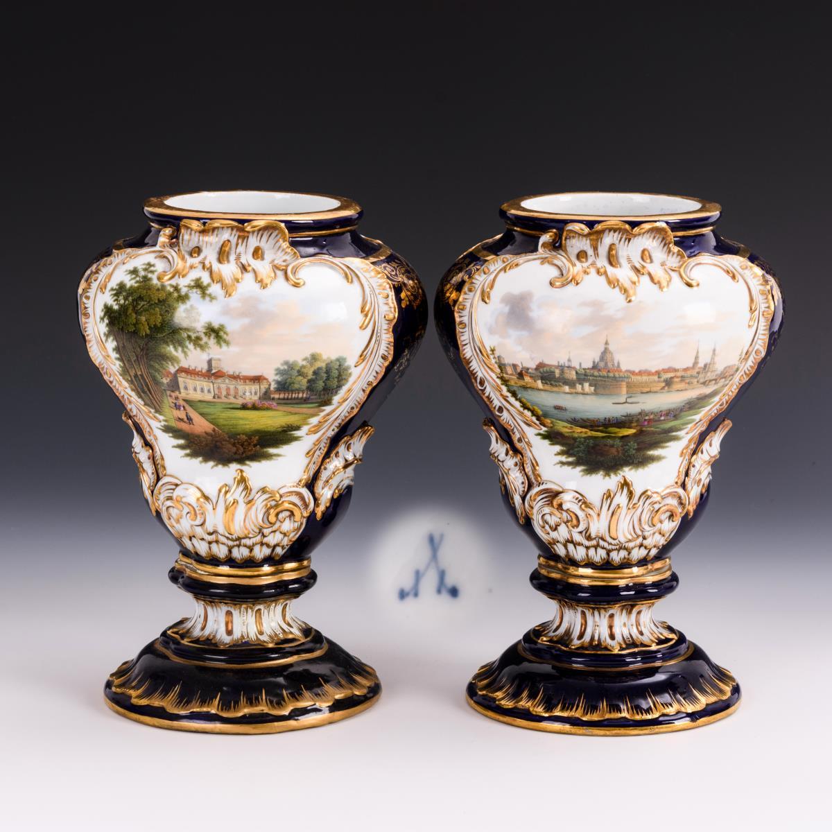 Balusterform mit Rocaillerelief. Kobaltblauer Teilfond, schauseitig eine fein gemalte Ansicht (1x Dresden, 1x eine Schlossansicht), verso Vogelmalerei. 1x Fuß lose (dieser restauriert), 1x kleine Bestoßung am Fuß, 1x kleiner Chip am Mündungsrand.
