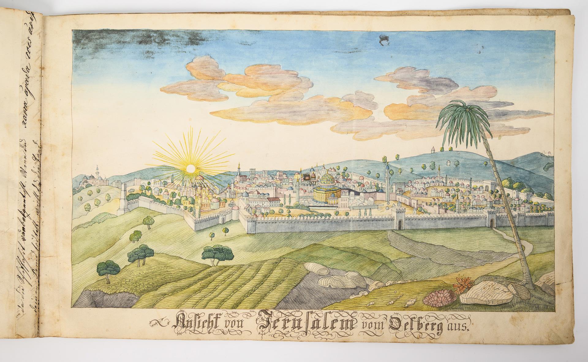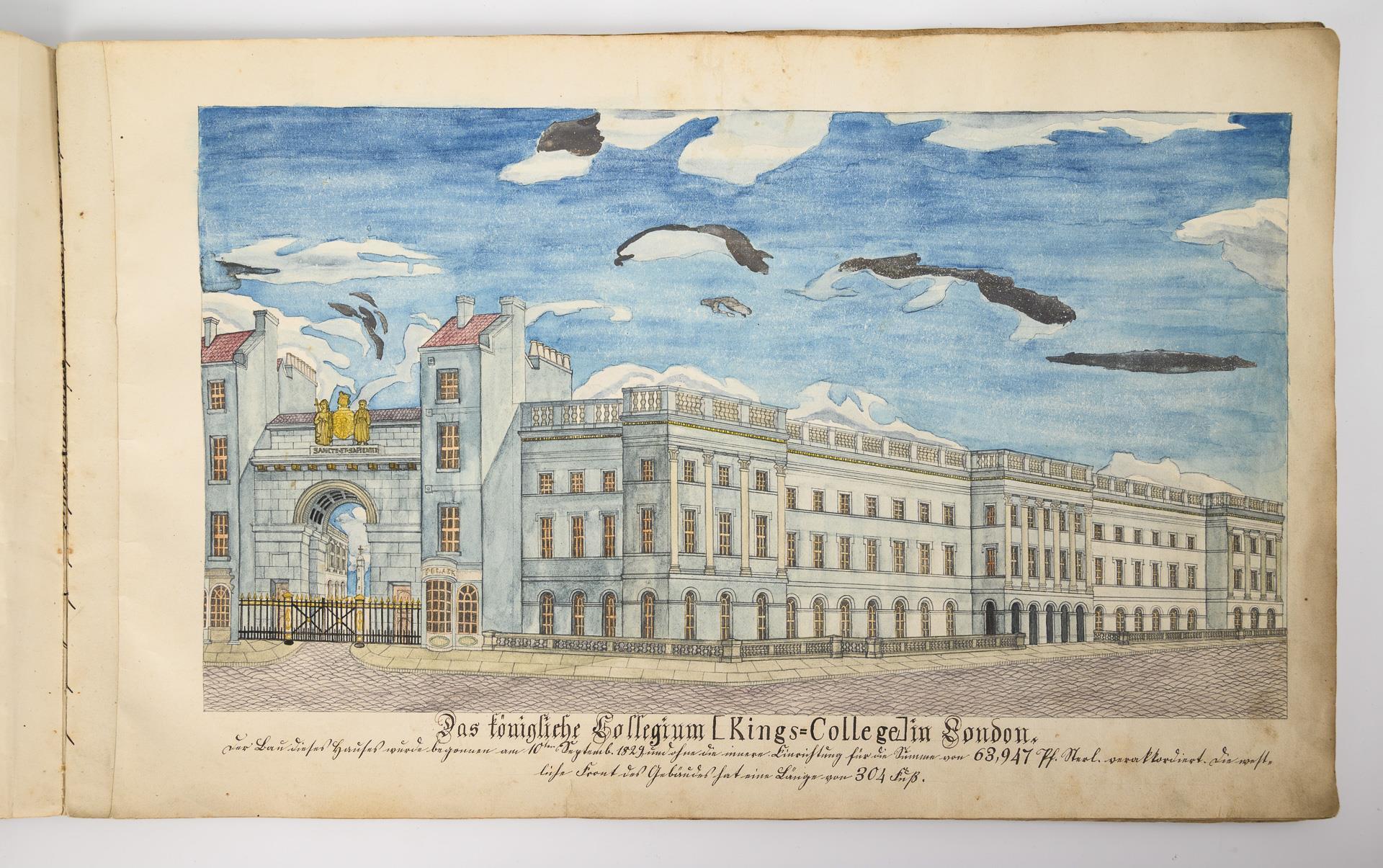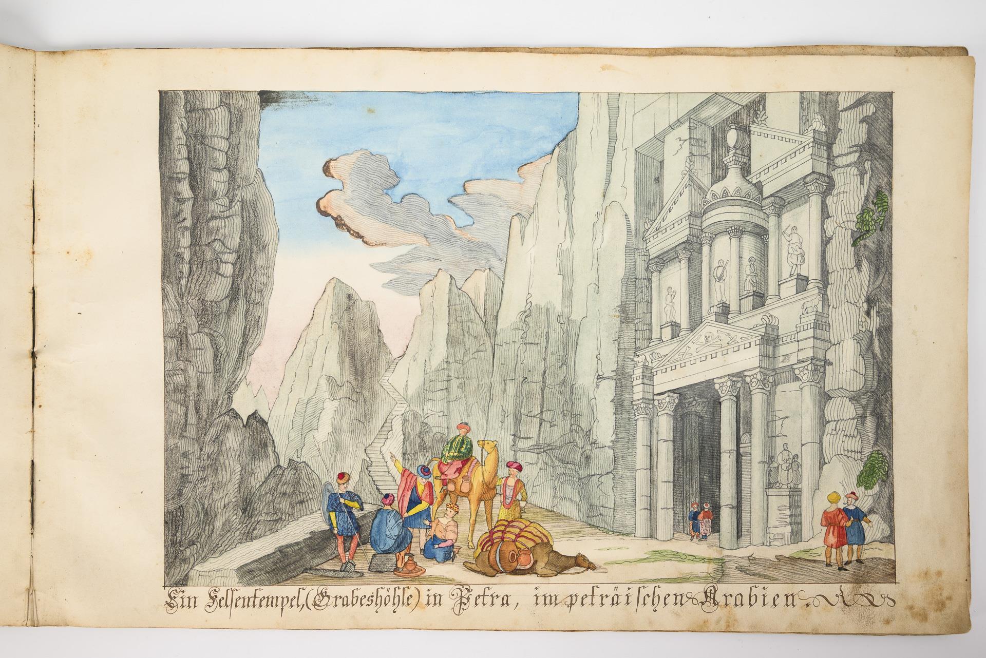 Ansichten aus den Städten: London (Einweihung der Londonbrücke (London Bridge), Zollhaus, King's College, Tower of London, Königlich Polytechnisches Institut, St. Paul's Cathedral, East India House, Southwark Bridge); Felsentempel in Petra Jordanien; Jerusalem vom Ölberg aus; Kingston Jamaica; Vulkan auf Hawaii; Porträts von König Friedrich Wilhelm III. von Preußen sowie seine Frau Louise; vier weitere Männerbildnisse (Hakub Natscharoffe, Jakob Baumberger). Leicht rissig und Knicke an den Rändern.