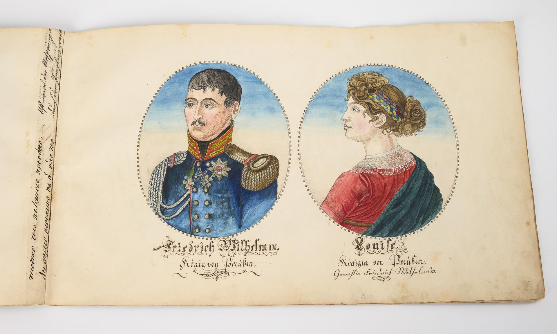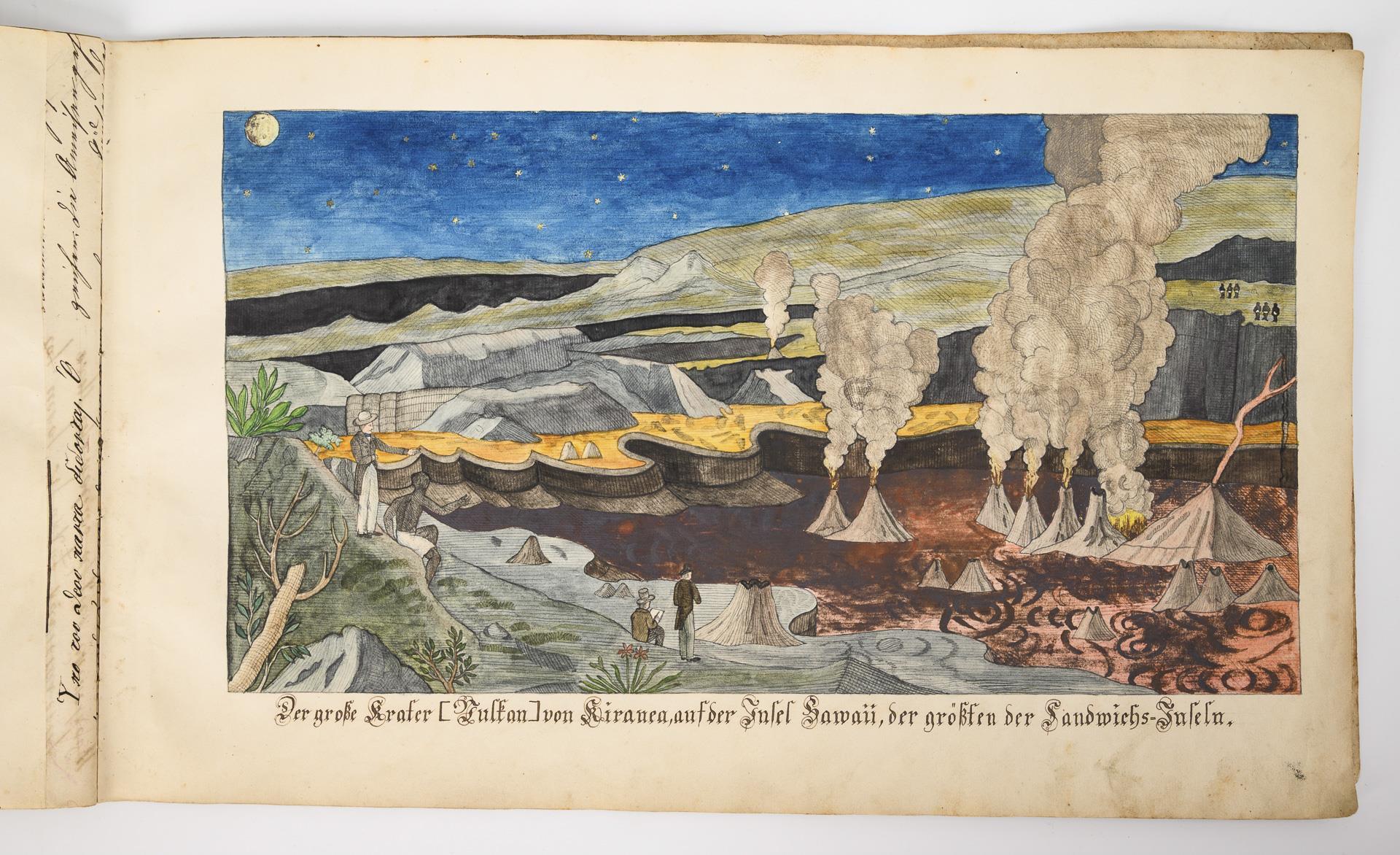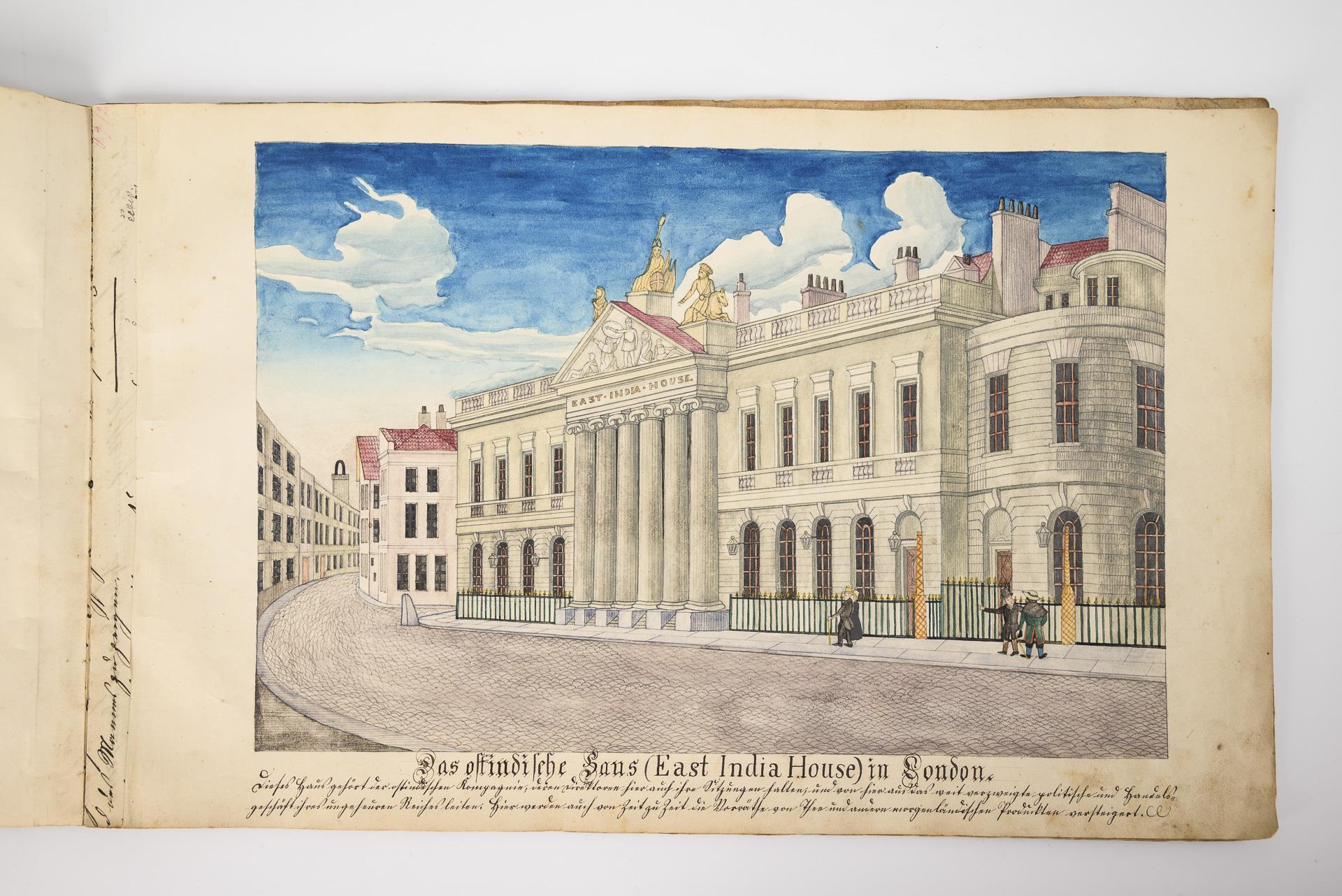 Ansichten aus den Städten: London (Einweihung der Londonbrücke (London Bridge), Zollhaus, King's College, Tower of London, Königlich Polytechnisches Institut, St. Paul's Cathedral, East India House, Southwark Bridge); Felsentempel in Petra Jordanien; Jerusalem vom Ölberg aus; Kingston Jamaica; Vulkan auf Hawaii; Porträts von König Friedrich Wilhelm III. von Preußen sowie seine Frau Louise; vier weitere Männerbildnisse (Hakub Natscharoffe, Jakob Baumberger). Leicht rissig und Knicke an den Rändern.