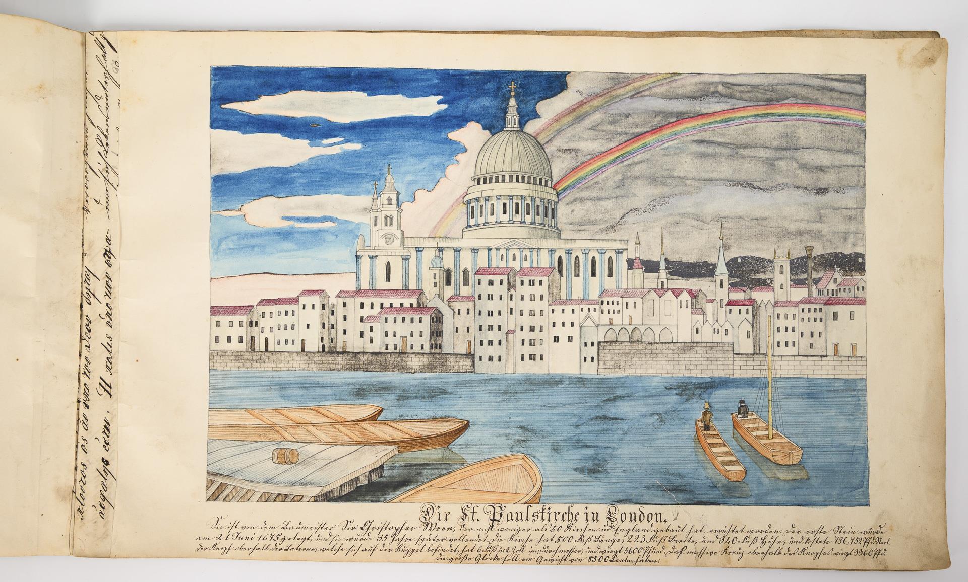 Heft mit 16 aquarellierten Bleistiftzeichnungen mit Ansichten aus London und aller Welt