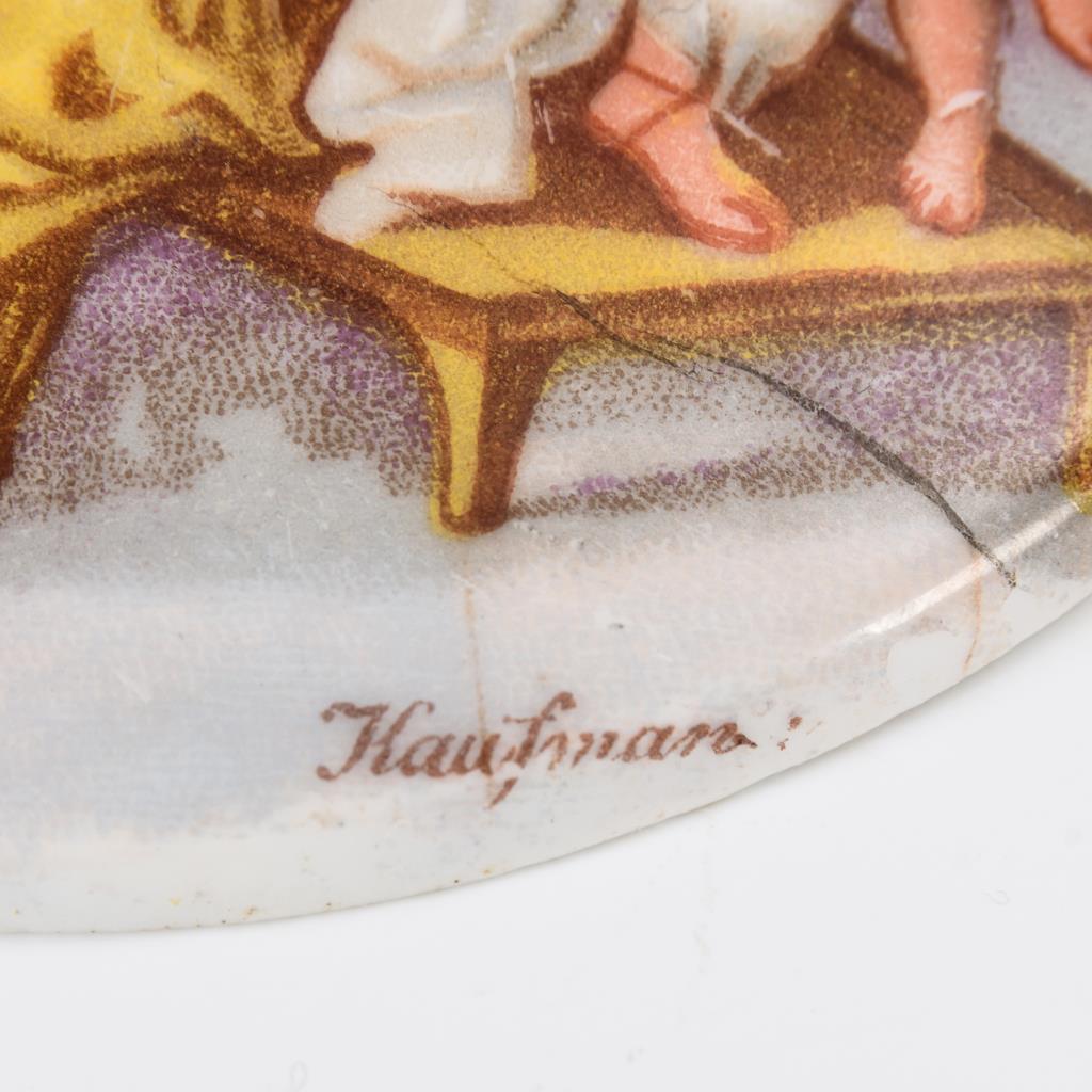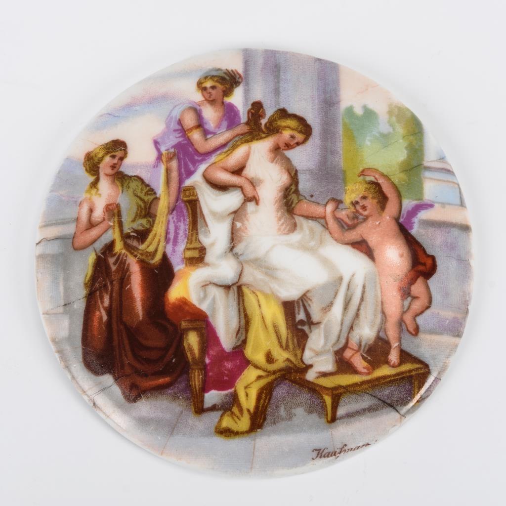 1x die Darstellung von Venus und Amor sowie zwei Damen, 1x Porträt einer Rokokodame, 1 mit Fabrikansicht. 1x berieben.