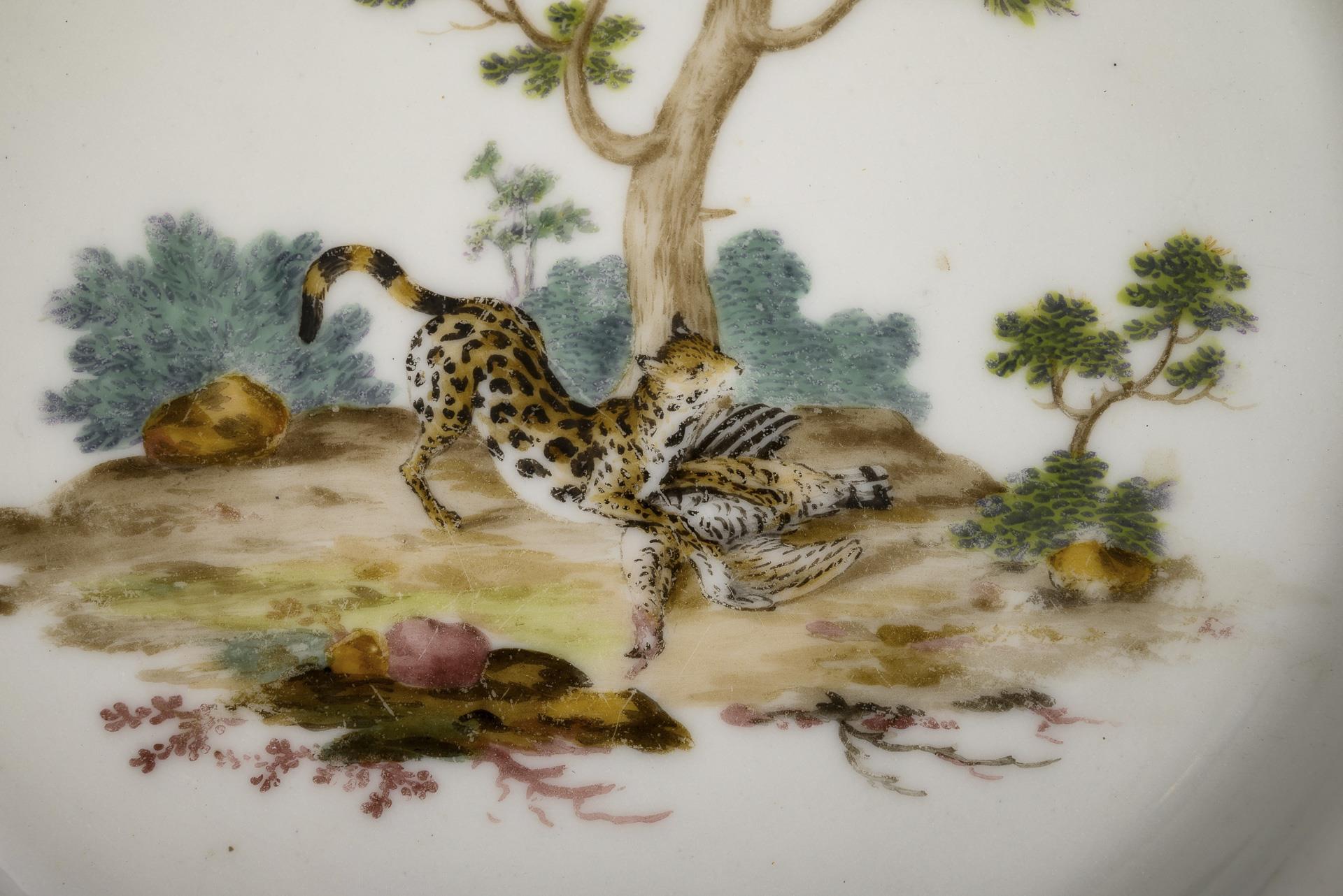 Glatter Teller, im Spiegel die Darstellung einer Landschaftsinsel mit jagendem Leoparden. Etwas berieben.