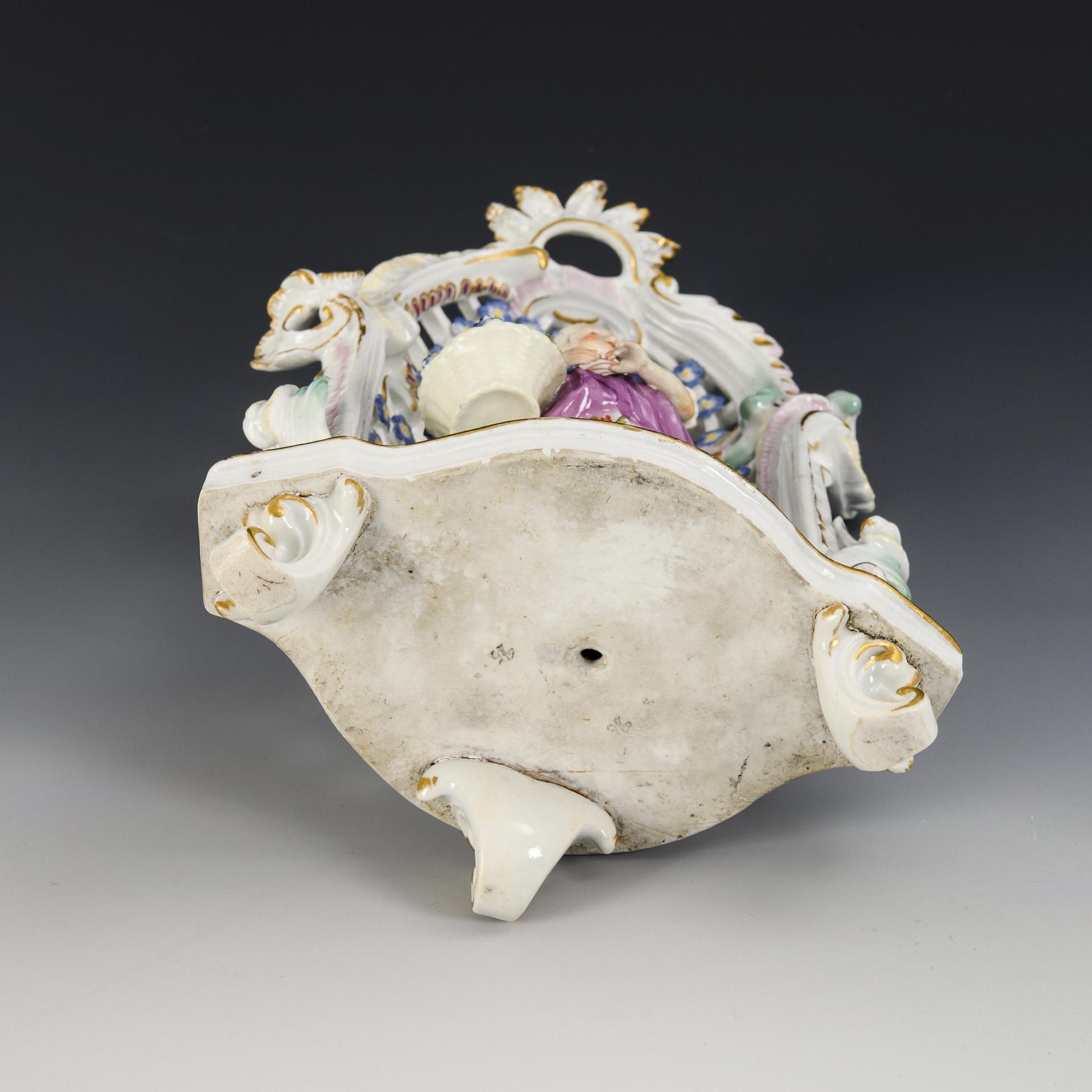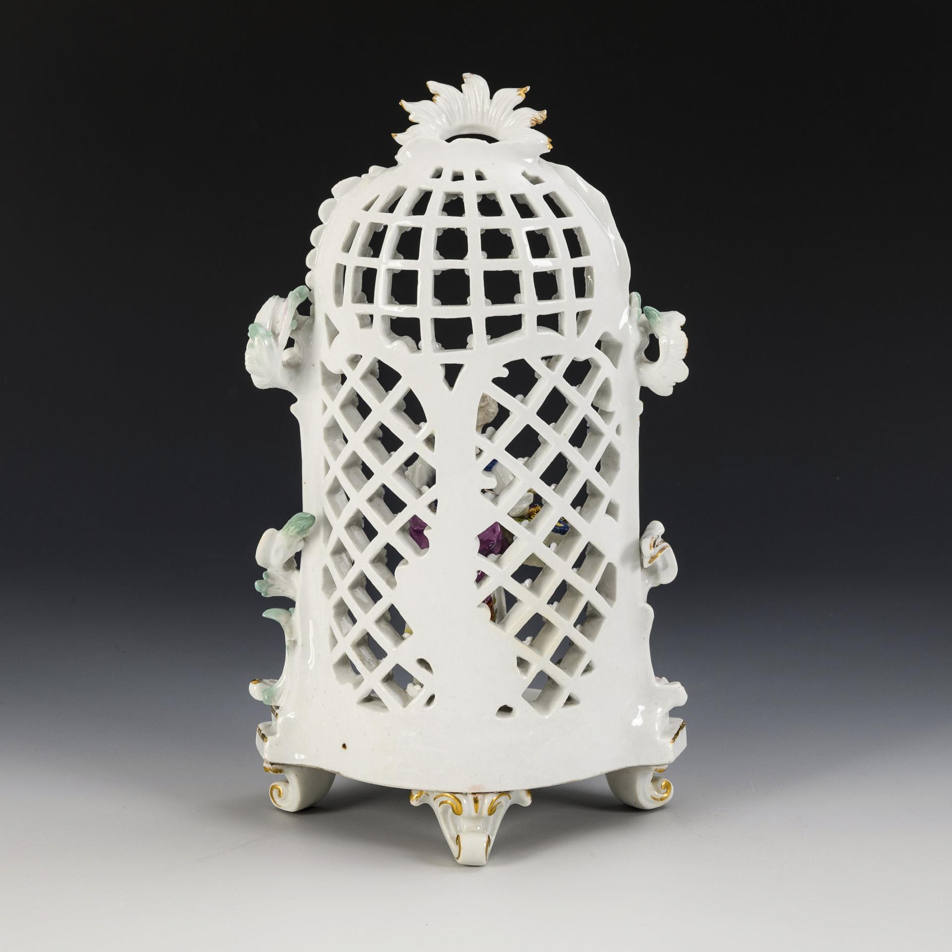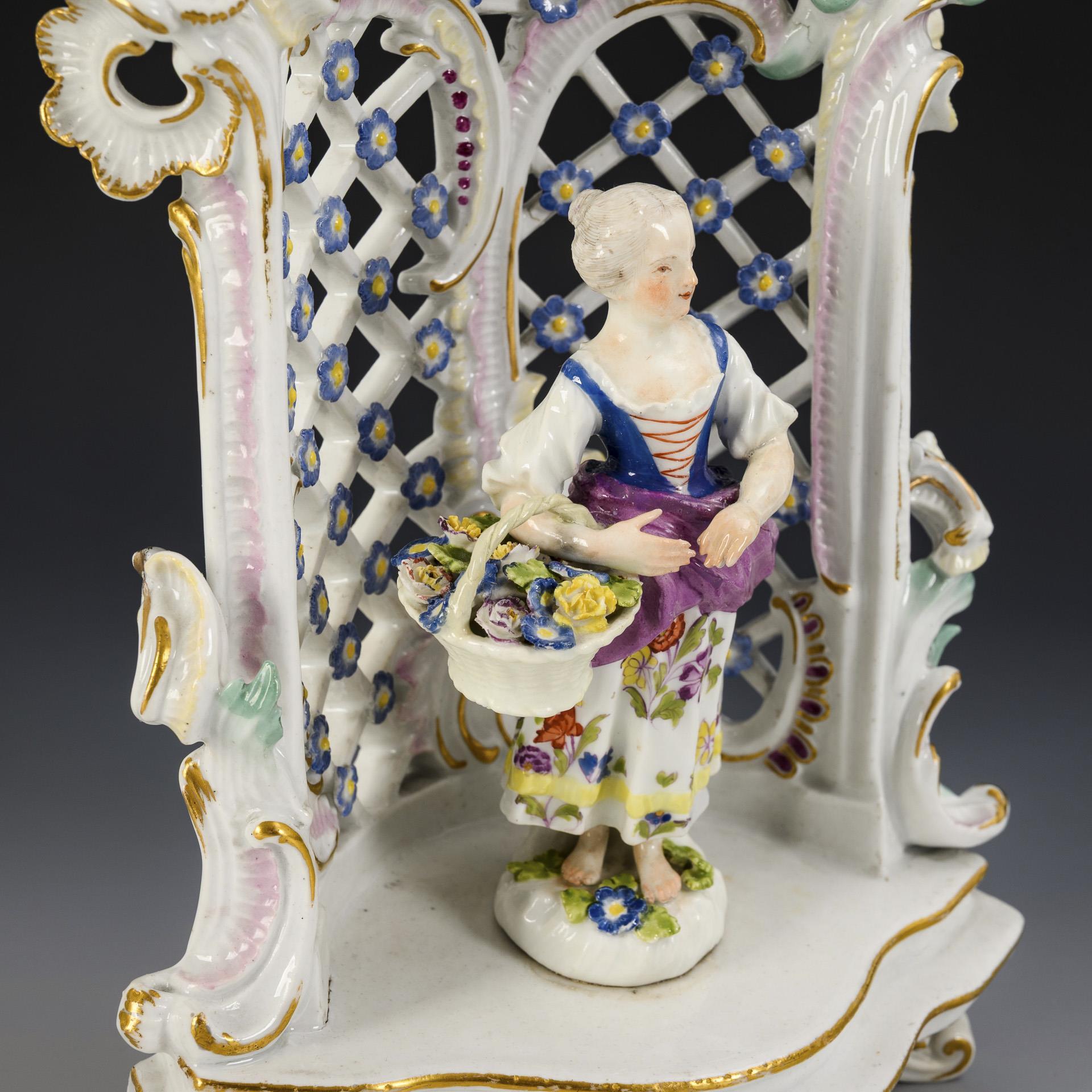 Gitterdurchbrochene Laube mit Rocaillezier, auf getrepptem Sockel mit drei Rocaillefüßen, darin ein Gärtnermädchen mit Korb stehend. Rocaillespitzen partiell restauriert, Korbhenkel, linker Arm und Taille des Mädchens restauriert.