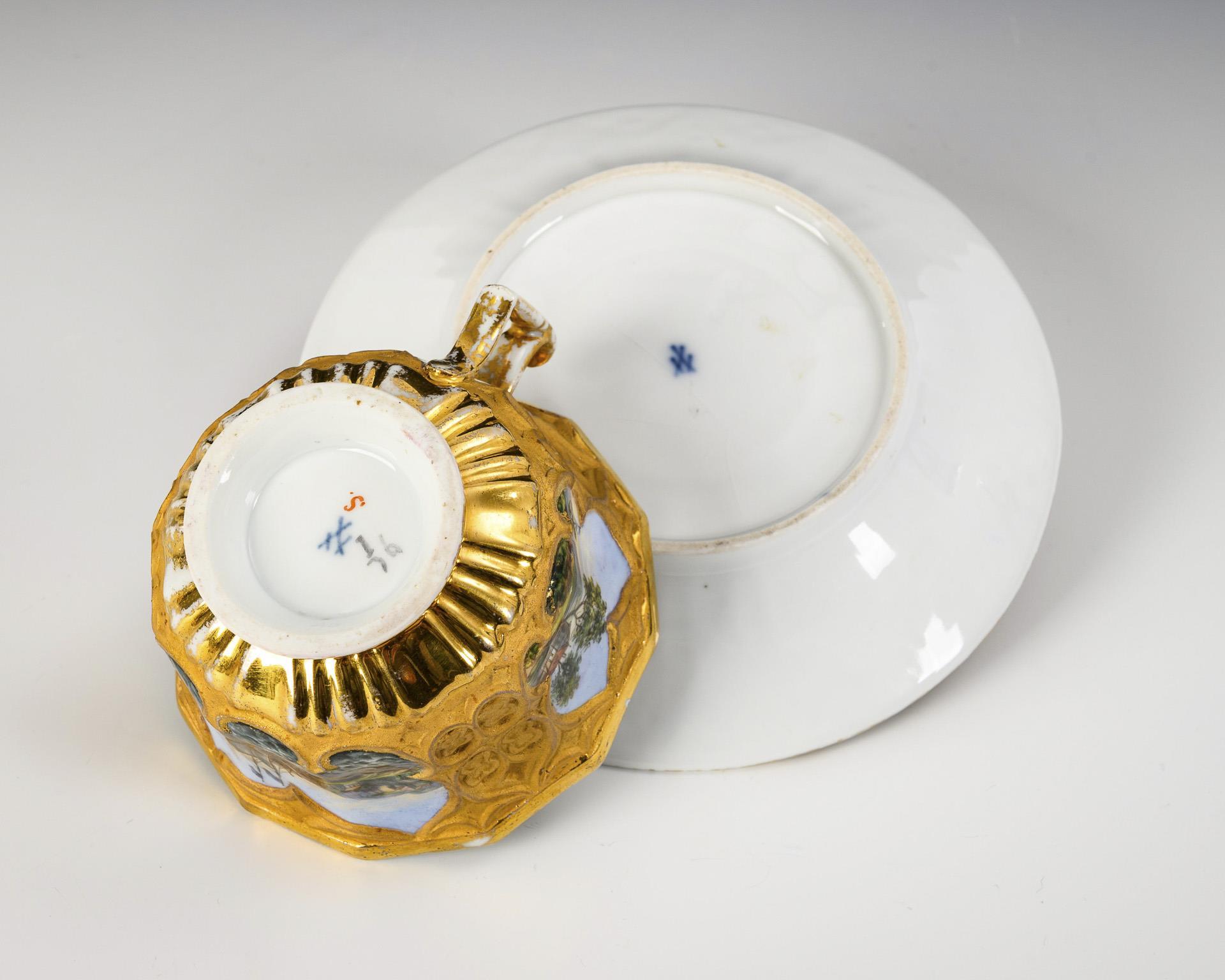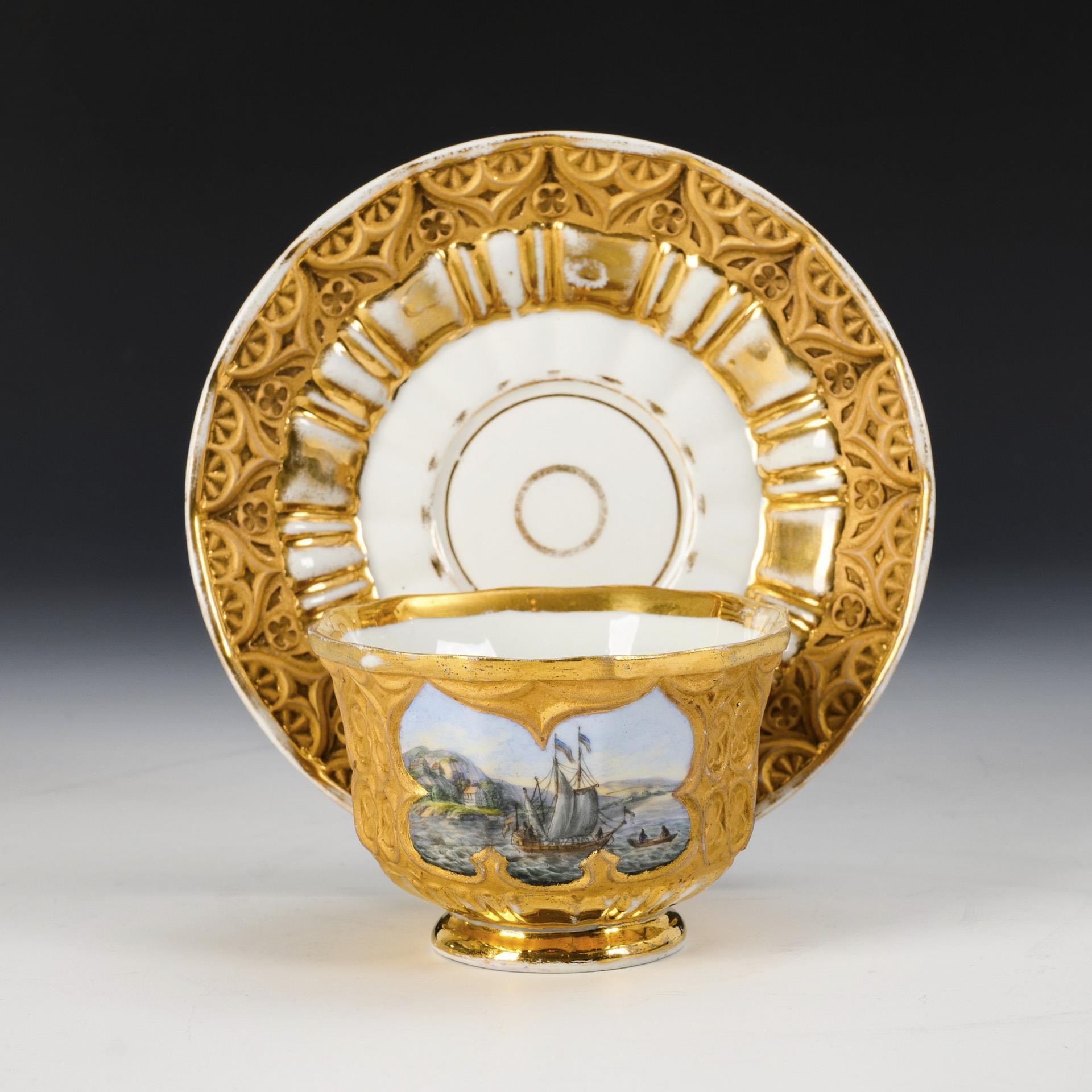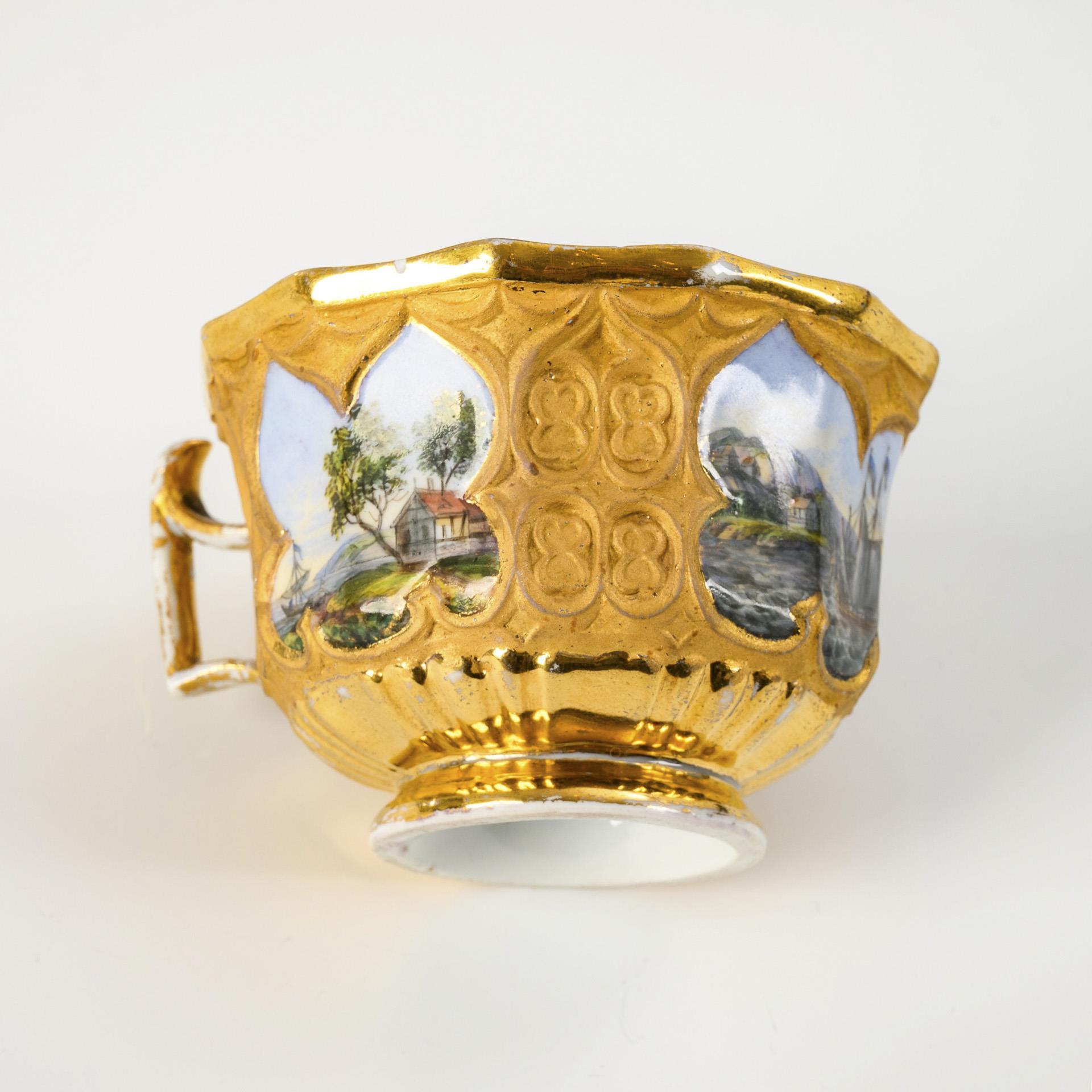 Gefußte Glockentasse mit goldbronziertem, gotisierendem Relief und spitz geschweiftem Henkel. In drei Kartuschen dargestellte Küstenlandschaften. Gold berieben, Haarrissspinne im Spiegel der Untertasse.
