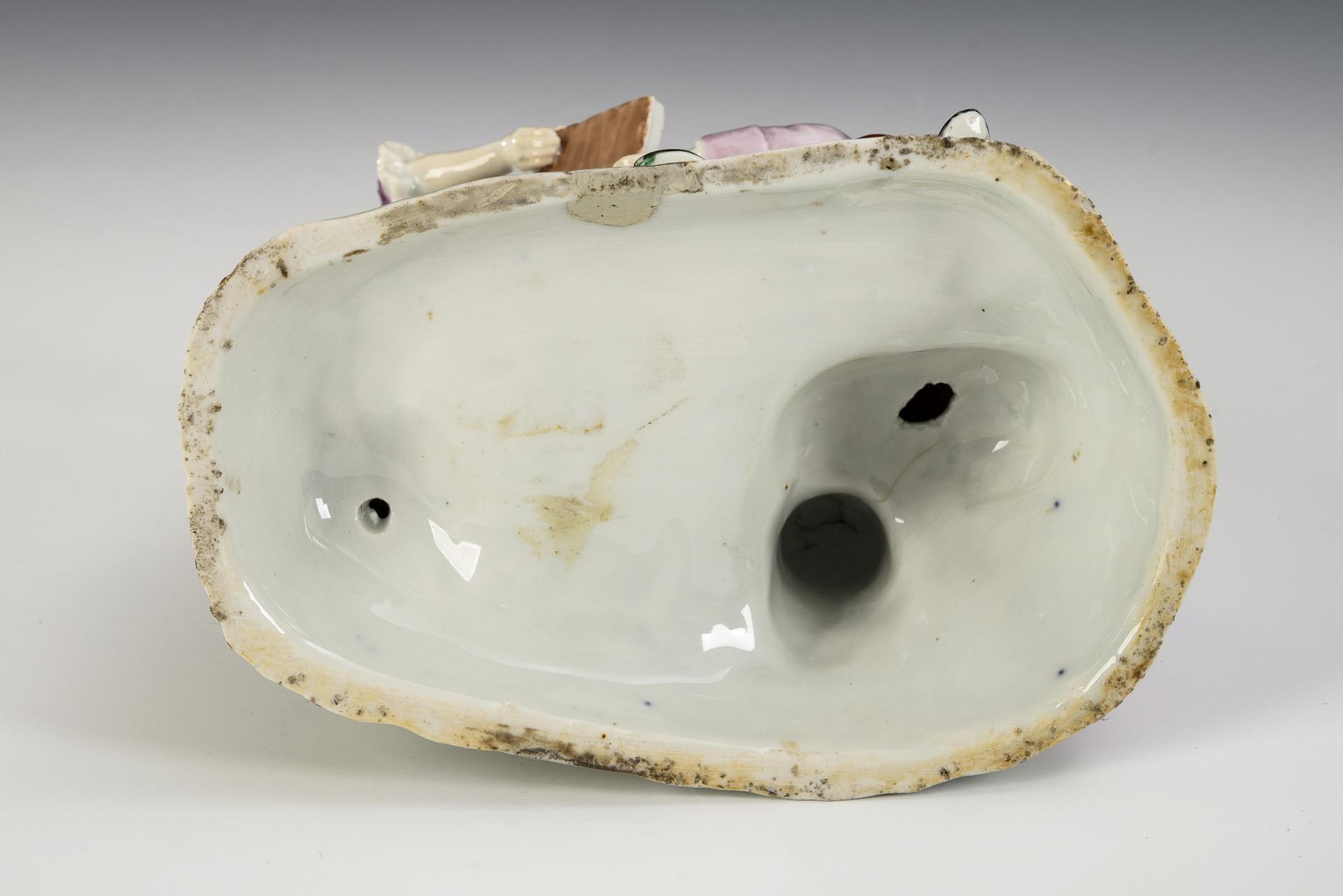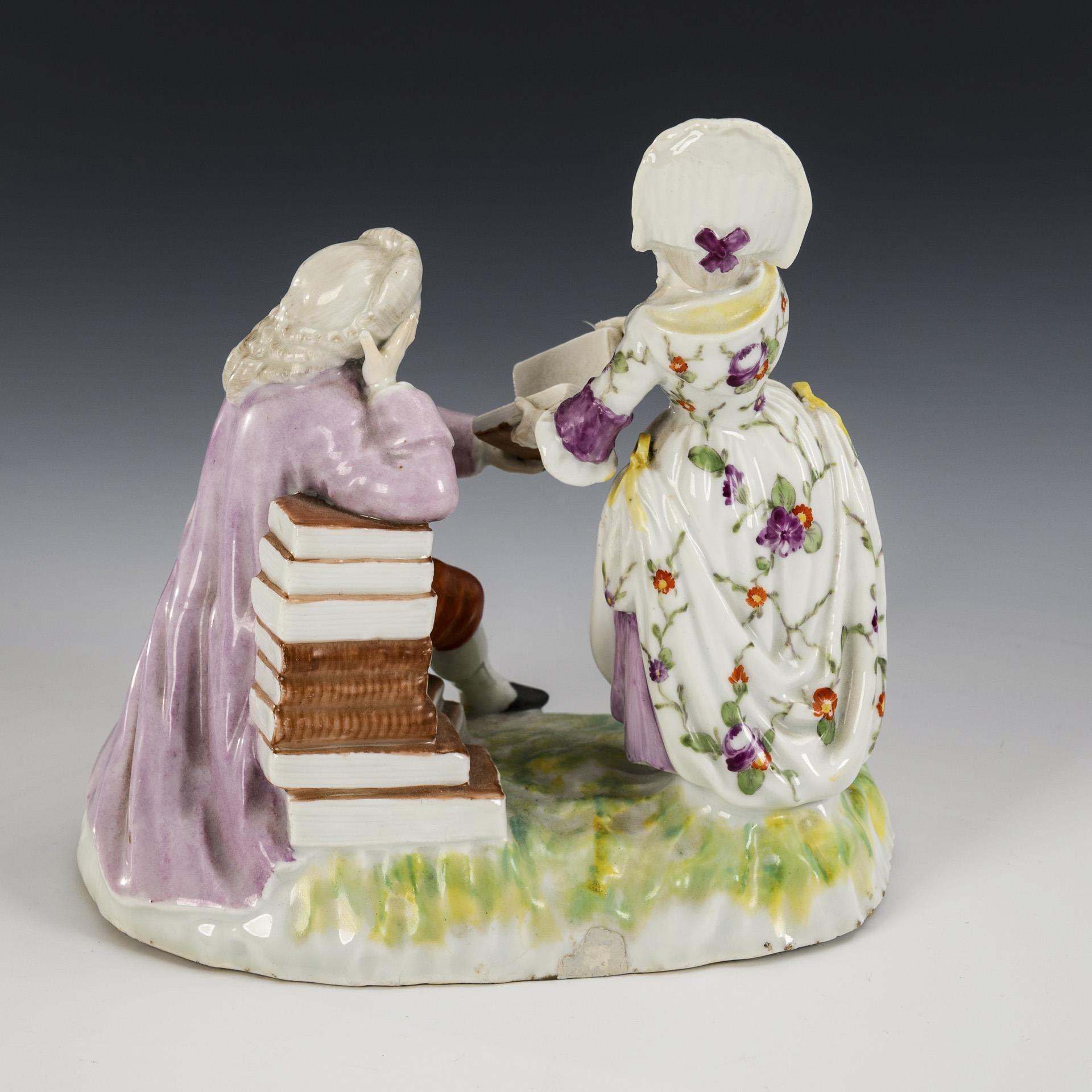 Einem an einem Bücherstapel sitzenden Rokokoherren ein Buch reichende Dame.