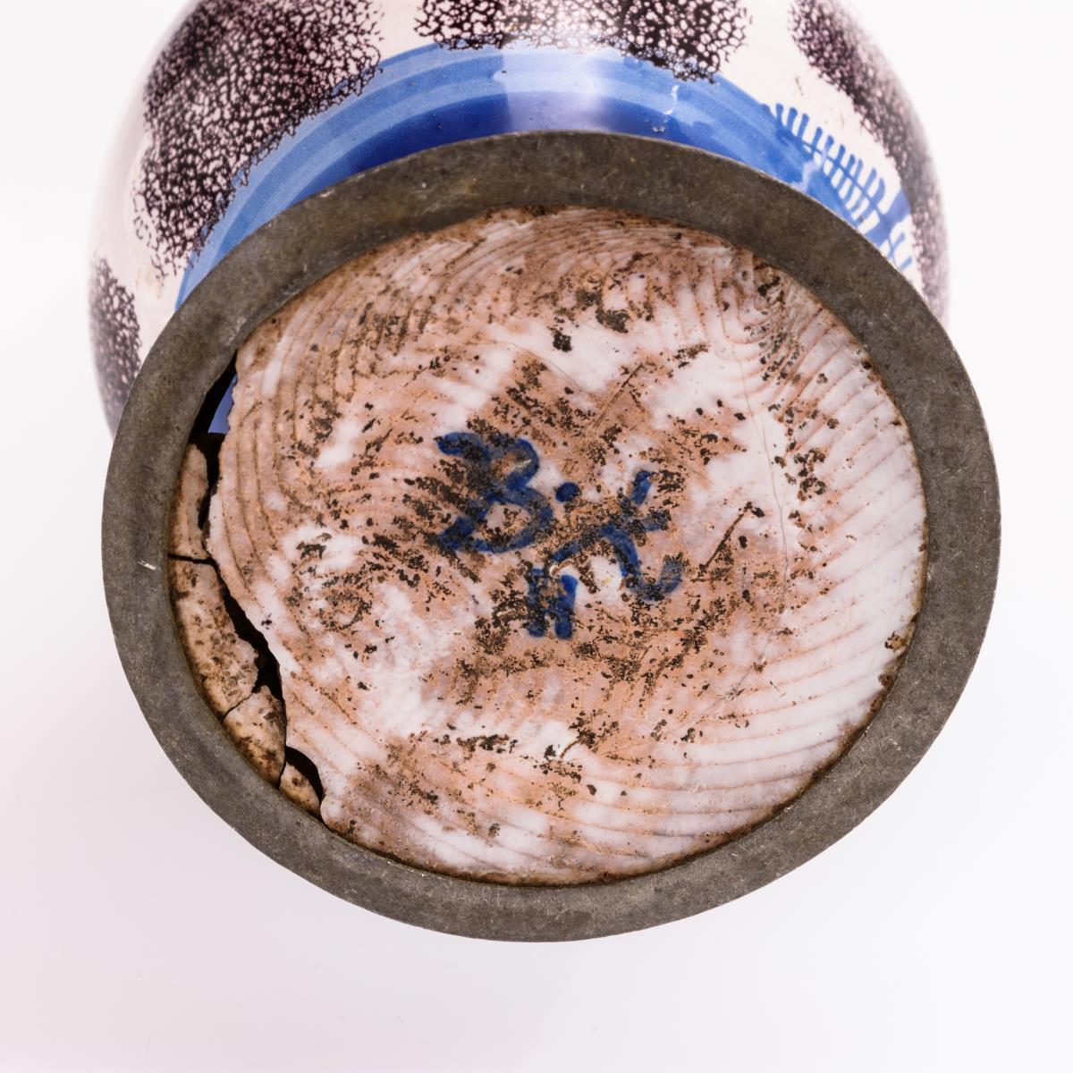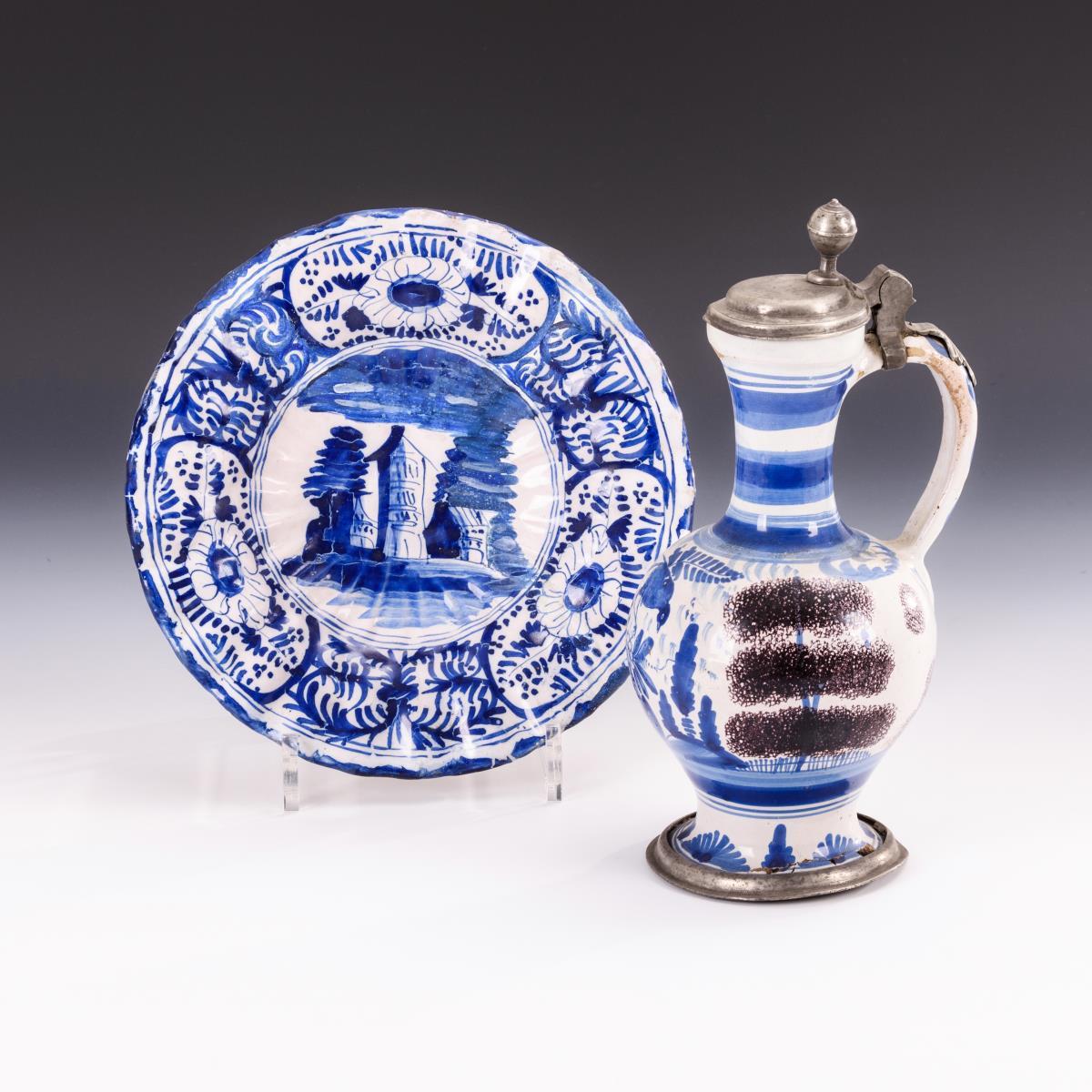 Bayreuther Enghalskrug mit Vogelmalerei, Zinndeckel und -standring (H 26 cm). Kleine Frankfurter Fächerplatte mit Architektur (Ø 22,5 cm). Defekte, teils restauriert.