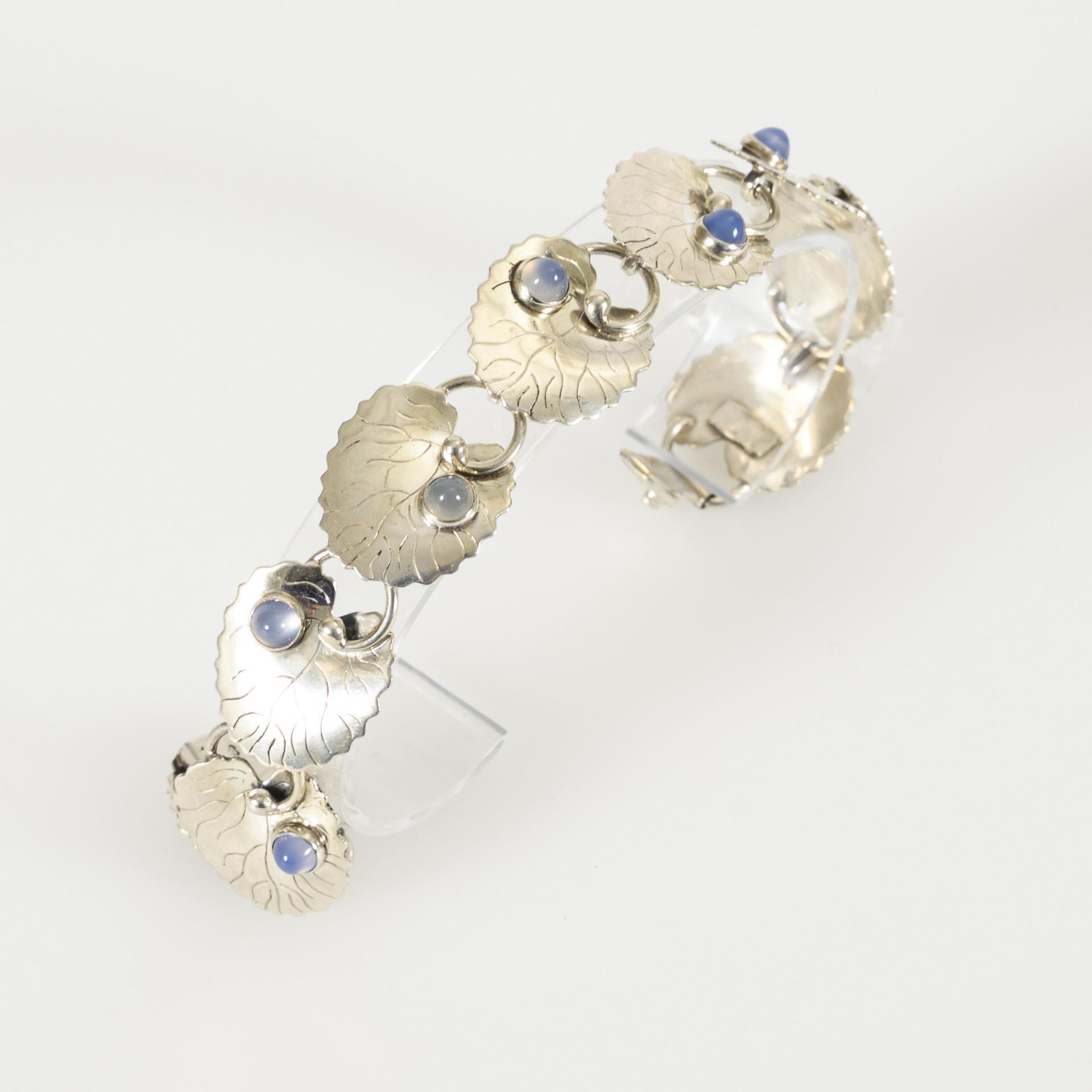 Vintage-Armband des in Schweden tätigen Designers ARVO SAARELA mit Gliedern in Form von Seerosenblättern, diese je mit einem Mondstein-Cabochon besetzt.