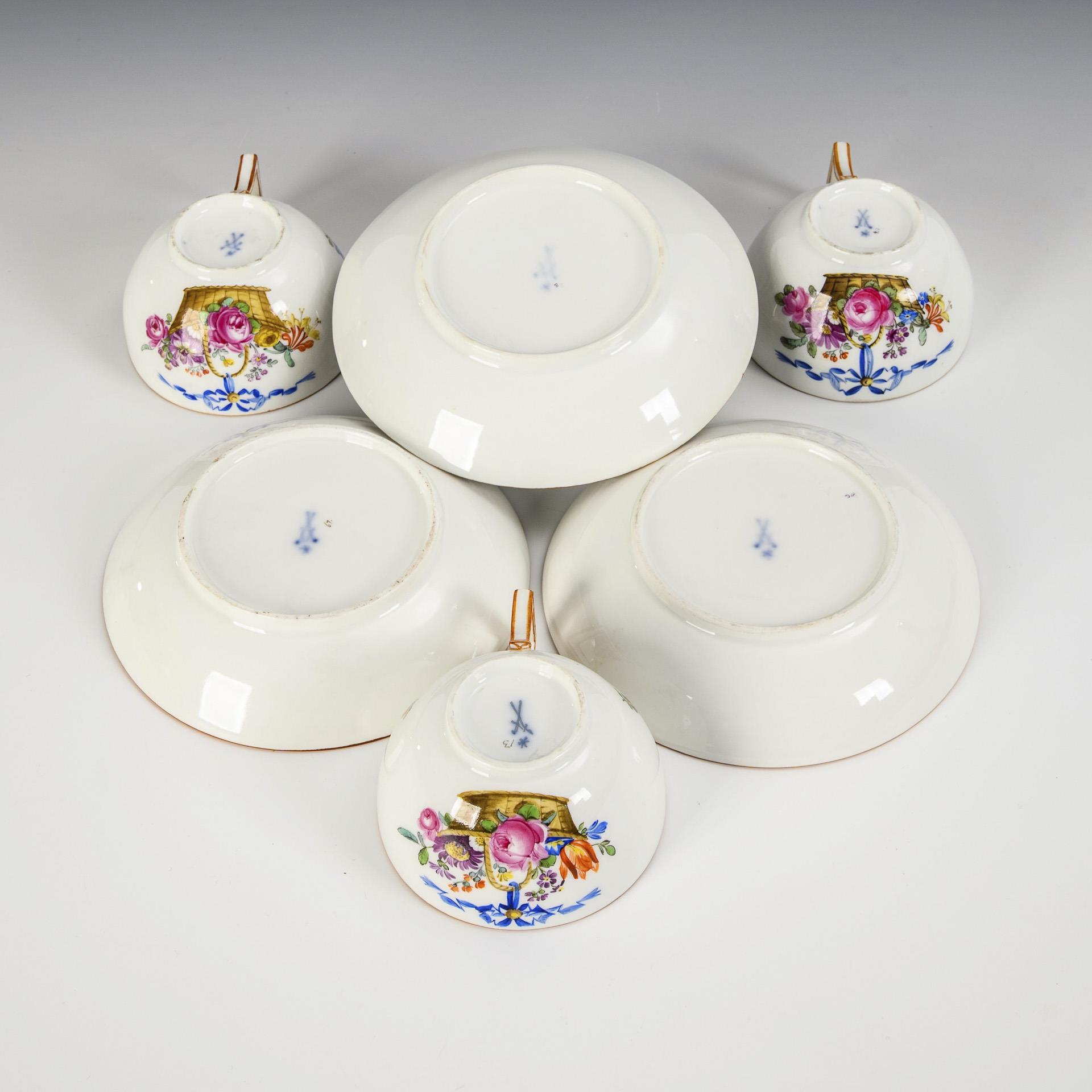 Bauchige Tassen mit gewinkeltem Henkel. Schauseitig auf der Tasse sowie im Spiegel der Untertasse die Darstellung eines Blumenkorbes mit blauem Schleifenband.