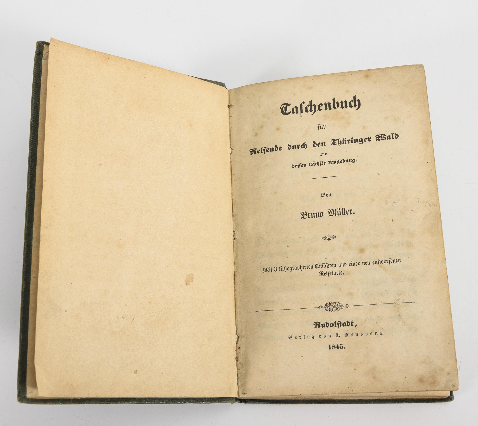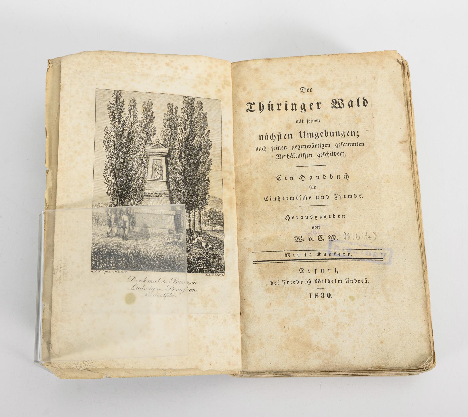 "Der Thüringer Wald mit seinen nächsten Umgebungen, nach seinen gegenwärtigen gesammten Verhältnissen geschildert. Ein Handbuch für Einheimische und Fremde. Herausgegeben von W. v. C.M. (Milbitz), Erfurt 1830, bei Friedrich Wilhelm Andreä. 25, 266 Seite mit allen 14 Kupferstichen. Broschureinband der Zeit mit Gebrauchsspuren, 19 x 11 cm. / Bruno Müller: "Taschenbuch für Reisende durch den Thüringer Wald und dessen nächste Umgebung", Rudolstadt, 1845, Verlag von L. Renovanz. 11, 187 Seiten mit einer Karte und 3 Lithografien. Im Leineneinband, 16 x 10 cm. Beide mit Besitzvermerken.