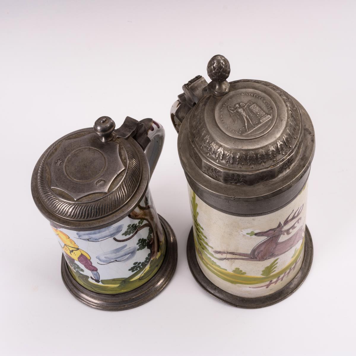 Zylinderkrug mit Jäger (H 18 cm) und springendem Hirsch (H 25 cm). Profilierte Zinndeckel. Großer Krug restauriert, partiell Defekte.
