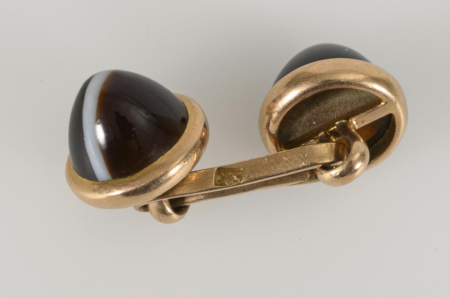 Manschettenknöpfe mit gebänderten Achaten in Sugarloaf-Form, mit Stegverbindung. Ein Steg in Gelbgold erneuert.