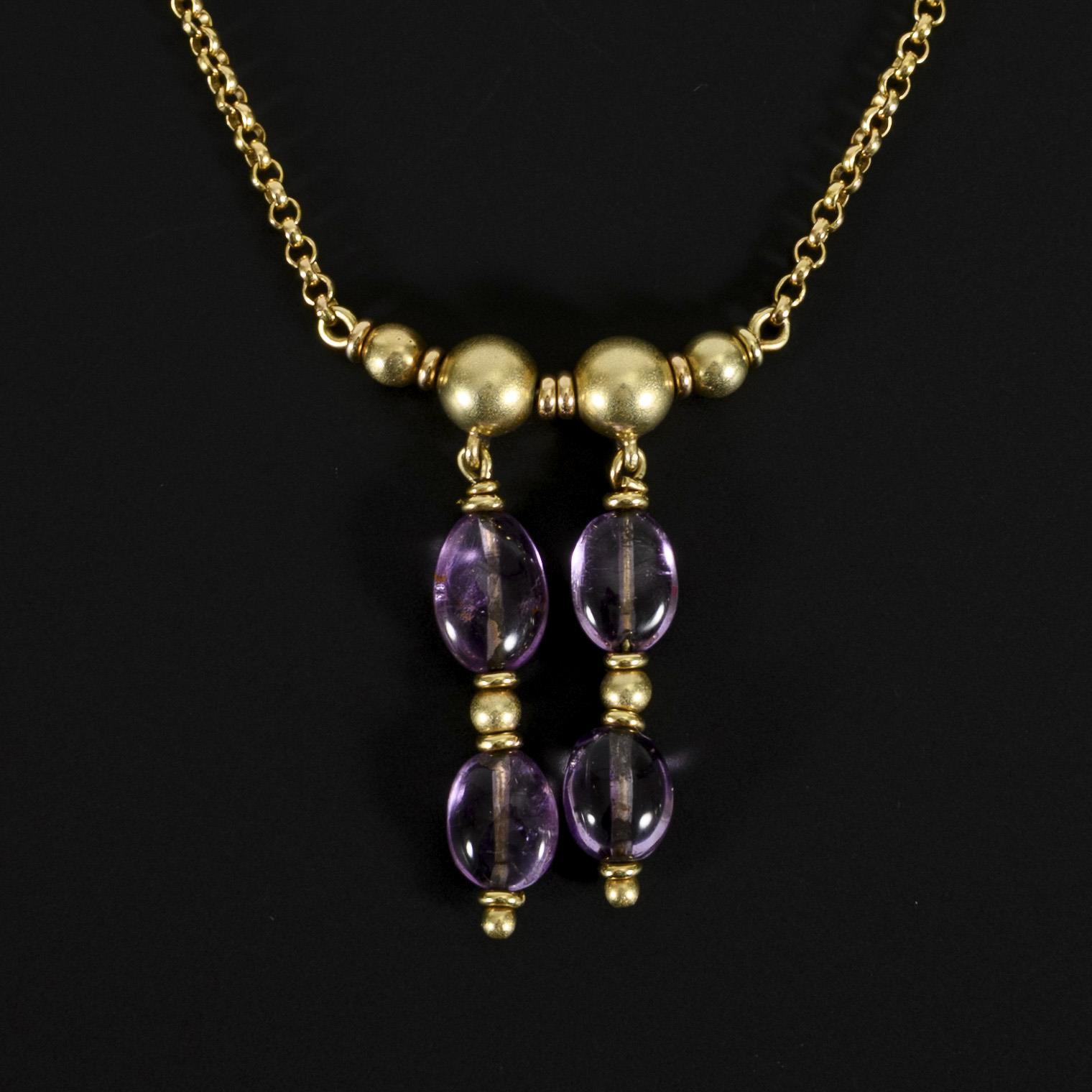 Collier mit einem Mittelstück, bestehend aus 4 Goldkugeln im Verlauf, daran zwei Abhängungen mit je 2 ovalen, durchbohrten Amethysten. Kette mit Federringverschluss.