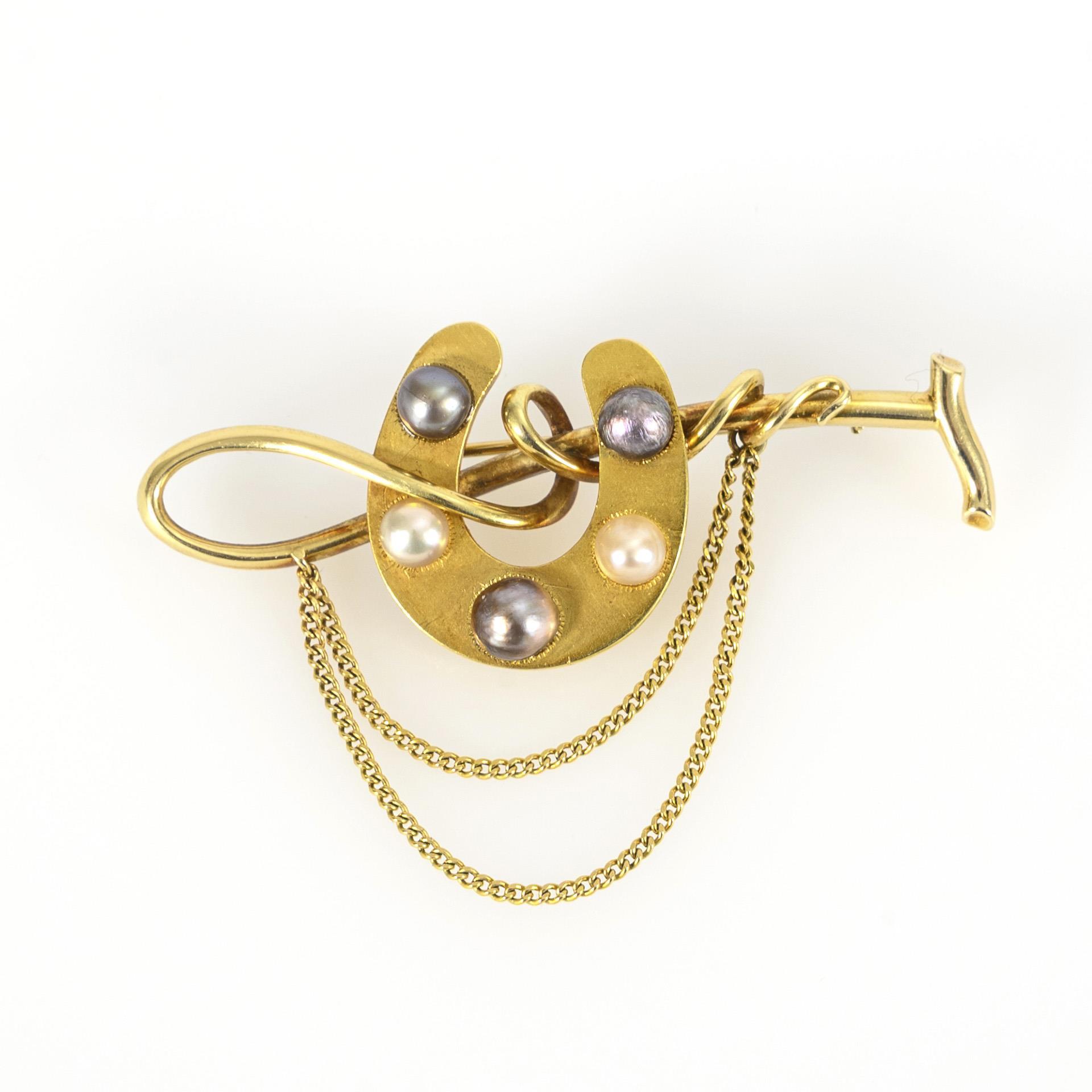 Originelle Brosche in Form einer ein mit dunklen und cremefarbenen Perlen besetztes Hufeisen umschlingender Springgerte mit 2 Kettenabhängungen. Die Nadel mit Schiebesicherung. Eine Perle mit leichten Tragespuren, das Gold partiell leicht verfärbt.