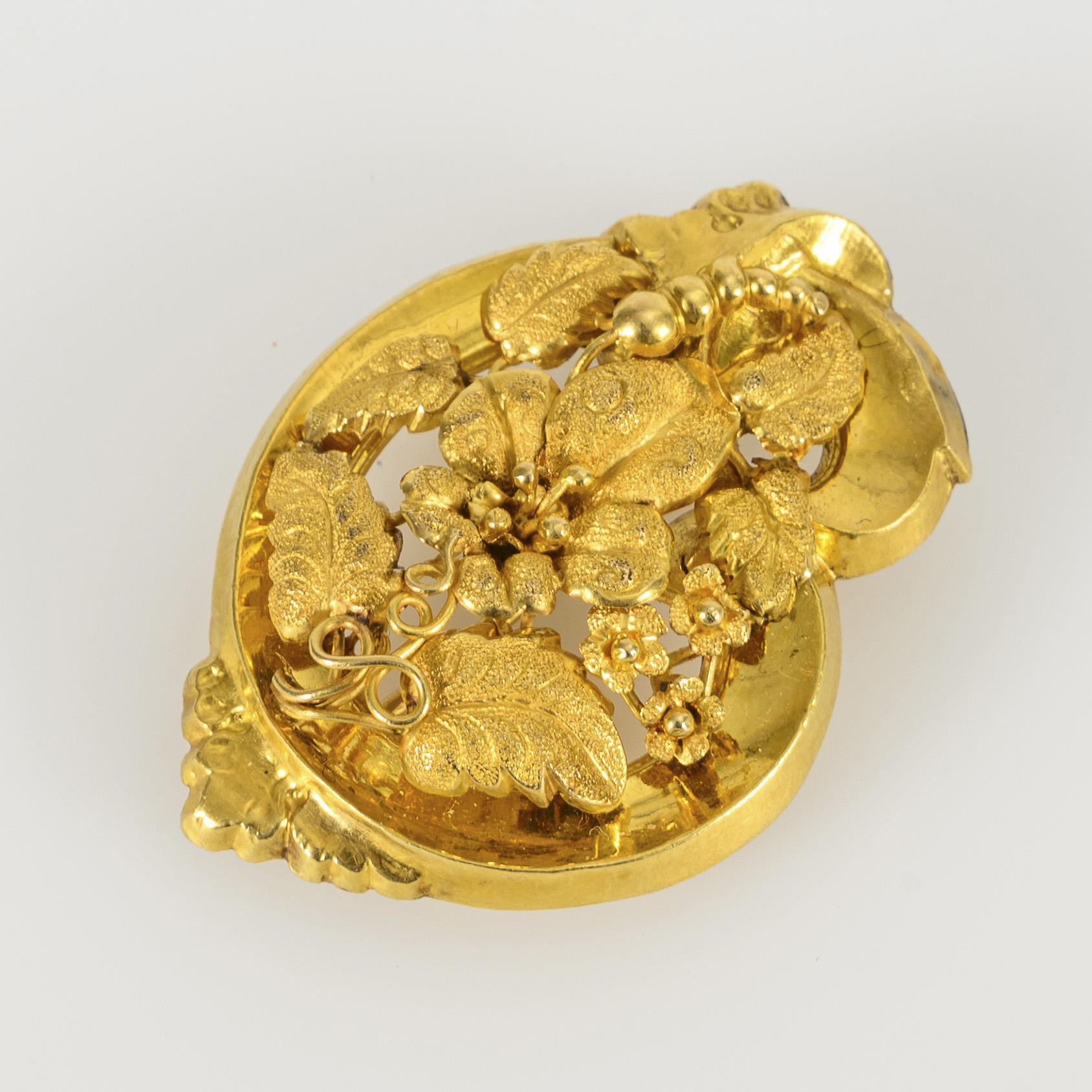 Anhänger-Brosche um 1840-50 in zarter, detailreich gearbeiteter floraler Ausgestaltung mit Blüten-, Rank- und Blattwerk. Kugelhakenverschluss. Leichte, altersgemäße Tragespuren; an einer der drei kleinen Blüten ist ein Blütenblatt abgebrochen, Broschierung älter erneuert.