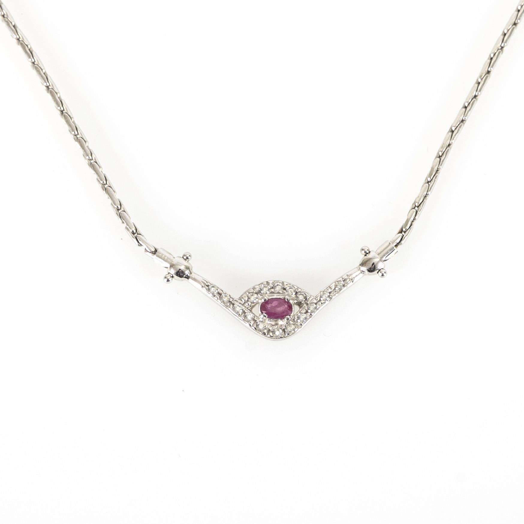 Collier mit rotem Farbstein, wohl Rubin, und hellen Farbsteinen.