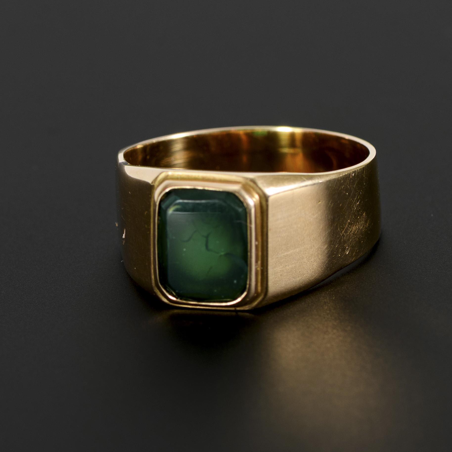 Breiter, großer Ring mit einem eingelassenen Grünachat mit facettierten Kanten. Tragespuren, unterseitig mit Spuren einer Ringgrößenerweiterung.