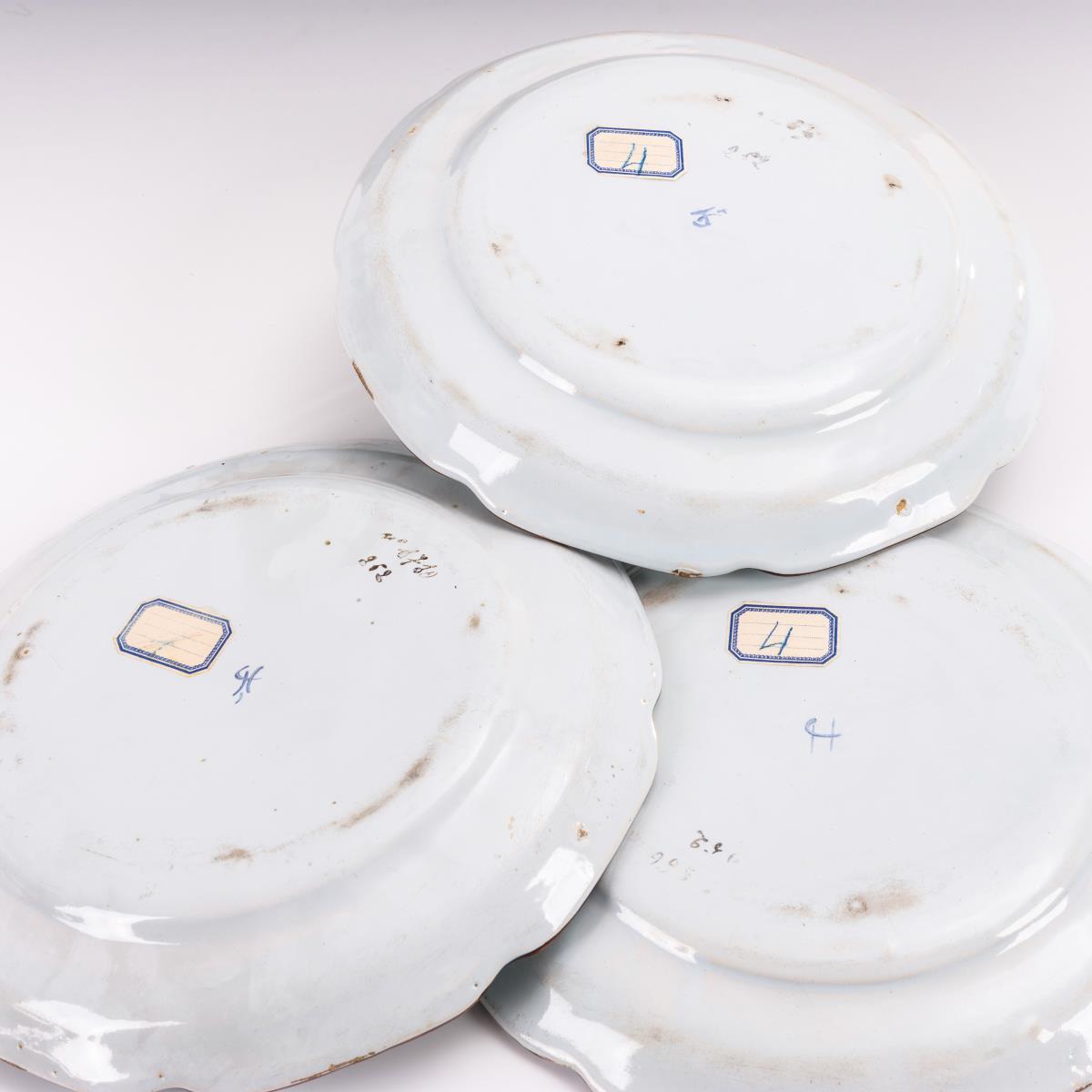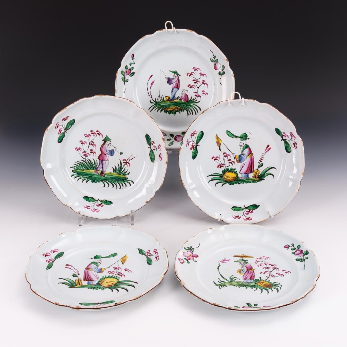 5 barocke Fayence-Teller mit Chinoiserien.