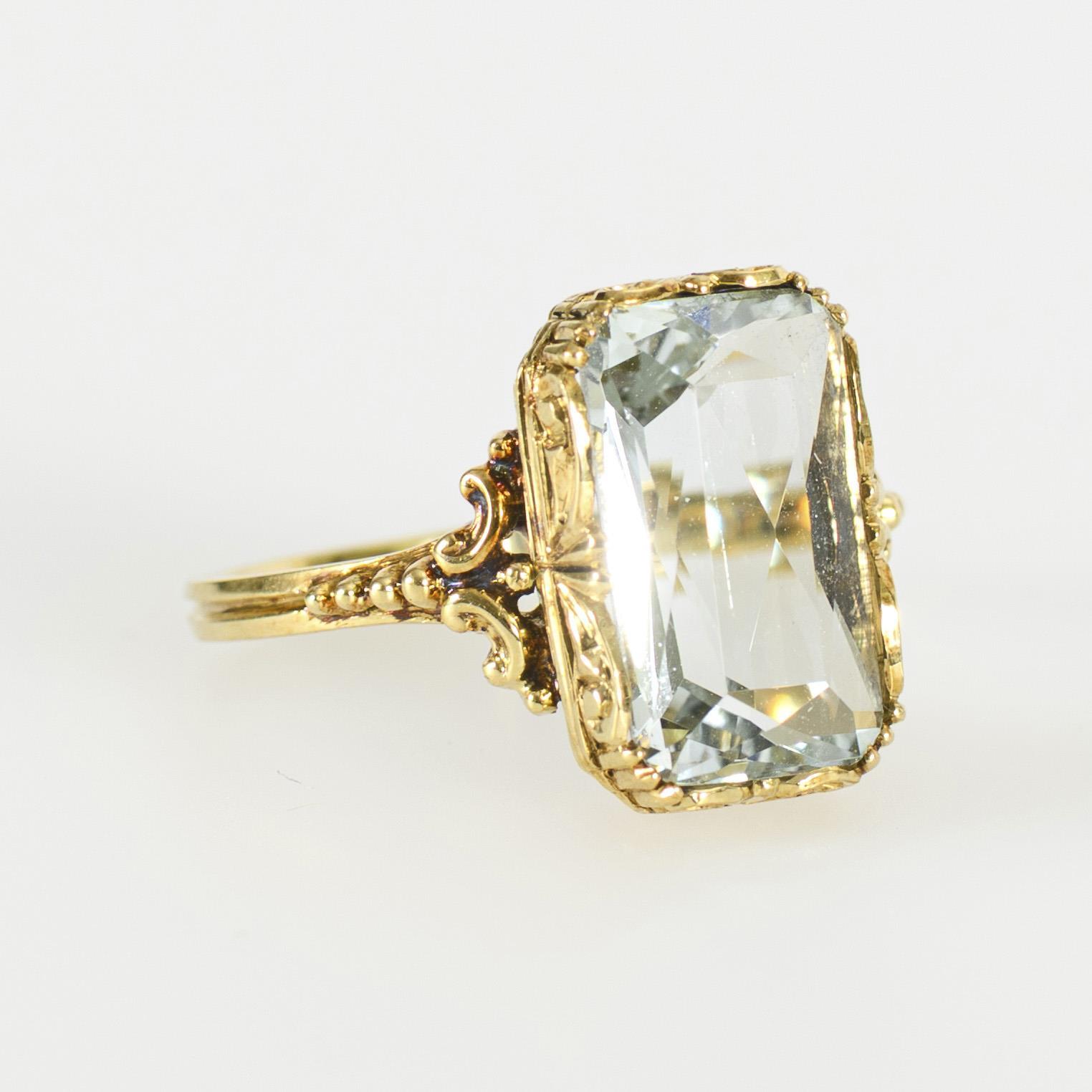 Ring mit einem hellblauen Farbstein in einer ornamental ausgestalteten Fassung zwischen ebenfalls ornamental gestalteten Ringschultern.
