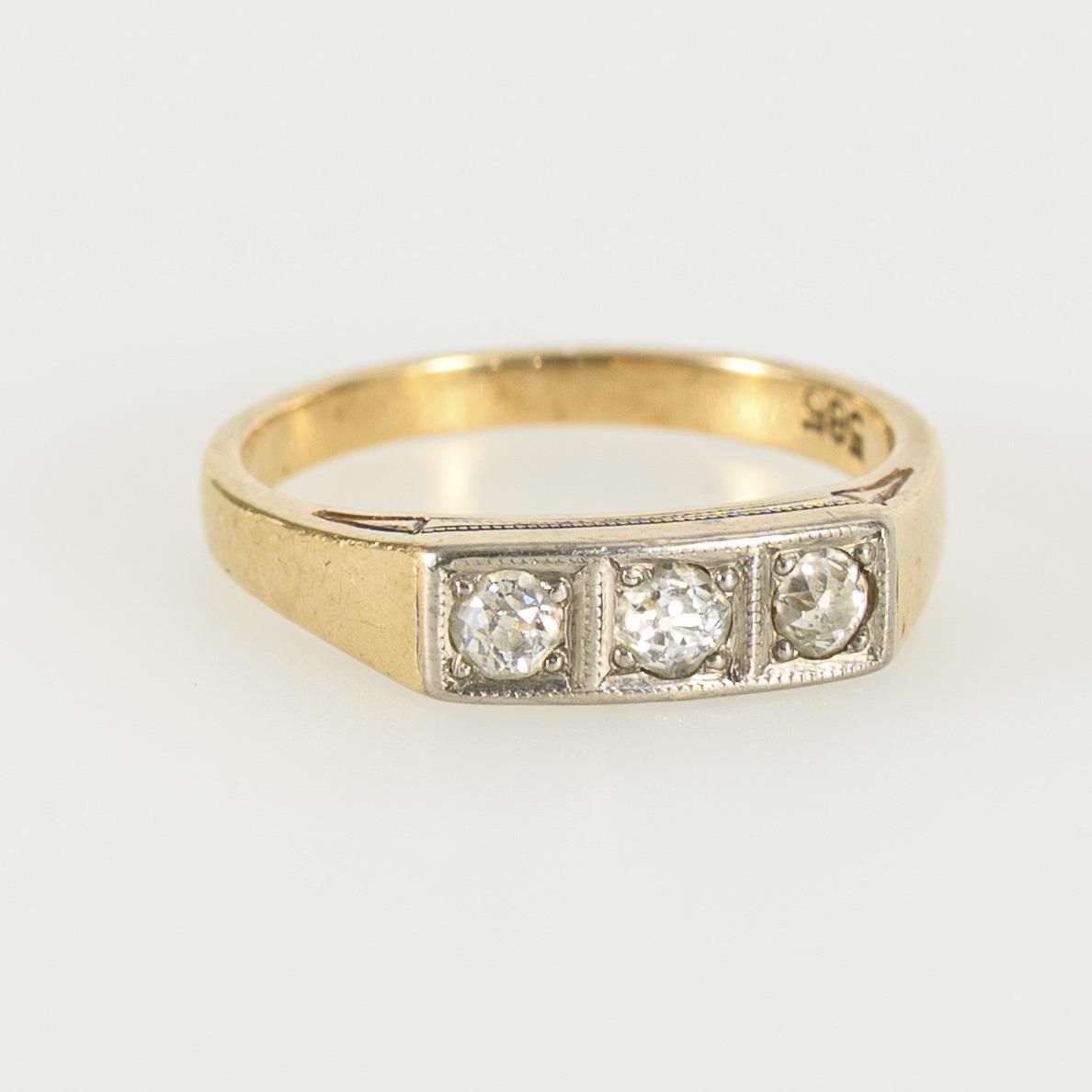 Ring aus der Zeit um 1900 mit einer Trilogie von 3 eingelassenen, in Weißgold gefassten Altschliff-Brillanten. Ringschiene mit leichten, altersentsprechenden Tragespuren.