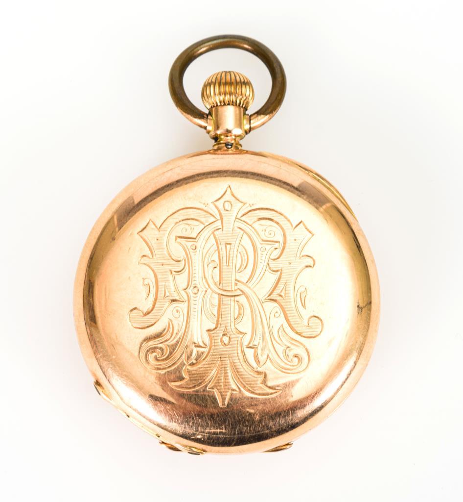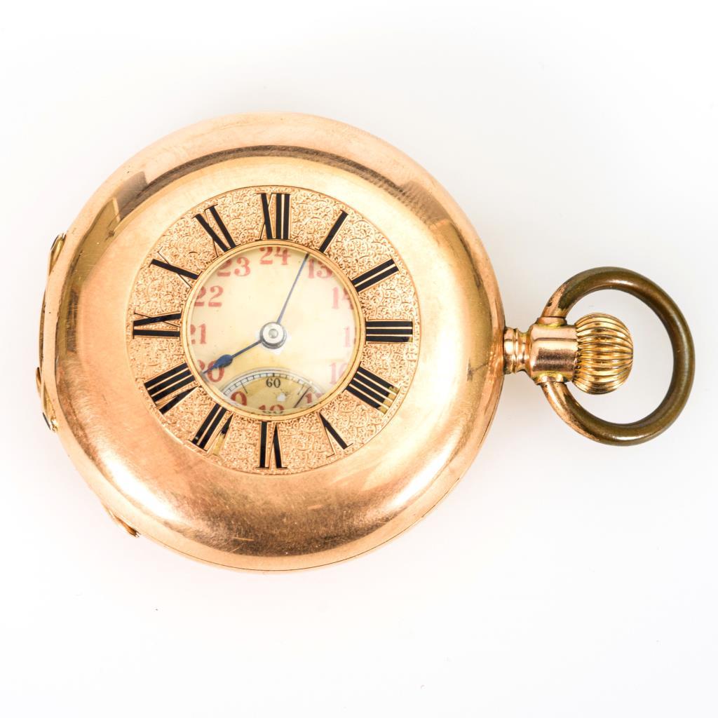 585 RG gepunzt. Glattes Gehäuse mit ligiertem Monogramm, Staubdeckel aus Metall. An 585 GG-Gliederkette im Verlauf, mit Karabiner und Federring, zusätzliches Gliederstück. Dazu ein goldener 585er Siegelring mit schwarz-weißem Onyx-Lagenstein. Werk läuft.Leichte Alters- und Gebrauchsspuren, Defekte am Email und am Stein, Hebel für Zeigerstellung arretiert nicht richtig.