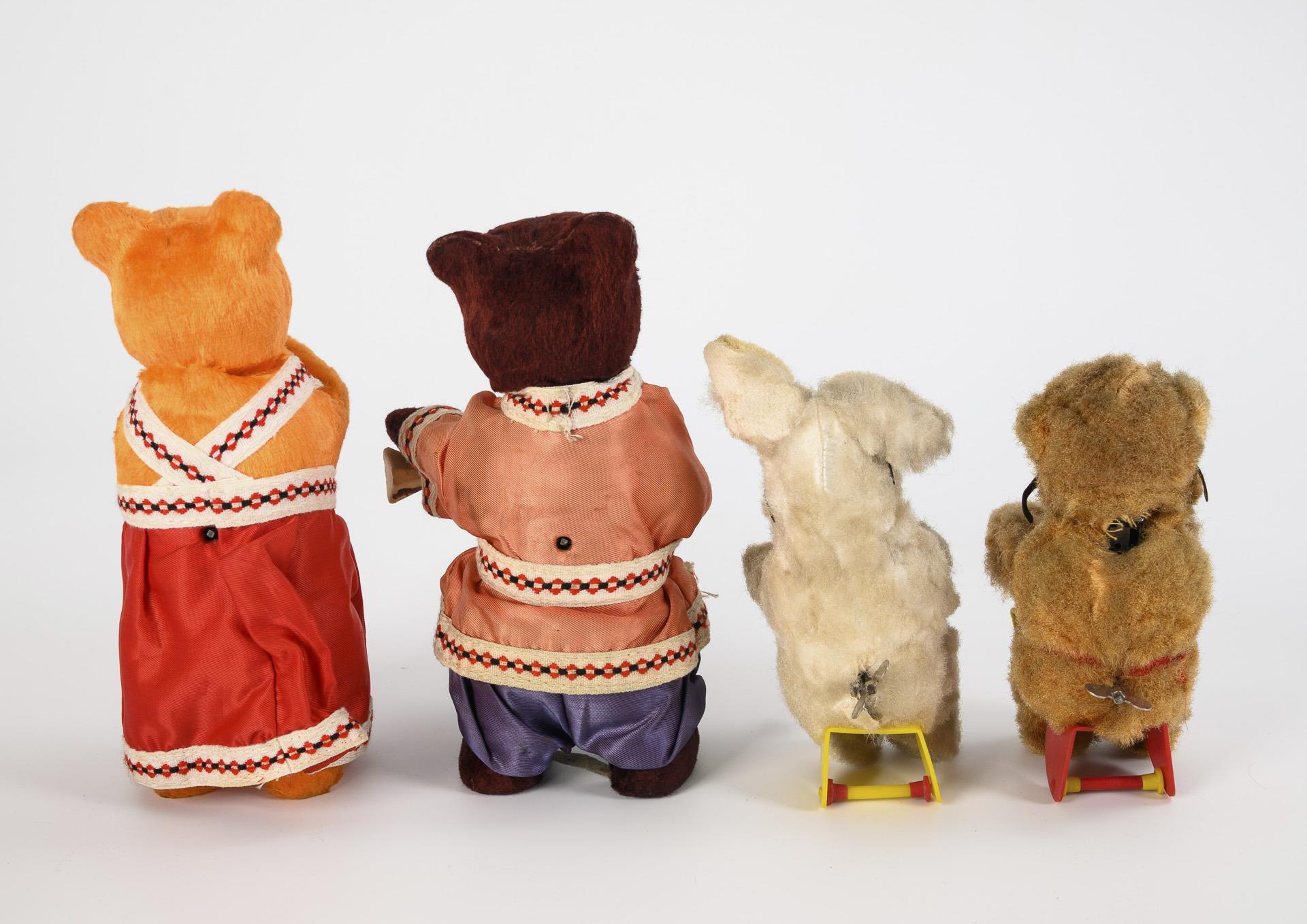 Konvolut 3 mechanische Teddys, Hase und 2 Katzen.
