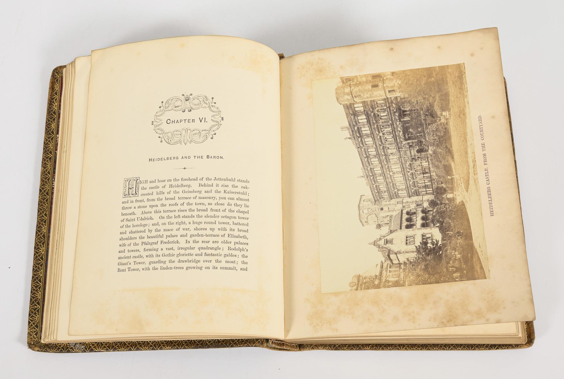 270 Seiten in englischer Sprache, mit 24 frühen Landschaftsfotografien (Albuminabzüge), im geprägten Ledereinband mit Goldschnitt. Die Fotos zeigen: Teufelsbrücke (Frontispiz), Drachenfels, Andernach (2), Stolzenfels, Liebenstein und Sternenfels, Heidelberg (3), Birkenau (2), Neckartal, Rhonegletscher, Meiringen, Interlaken (2), Staubbach, Innsbruck (2), Landeck, St. Gilgen, St. Wolfgang und Stuttgart (2). Einband abgegriffen, Fotoseiten schwach stockfleckig.