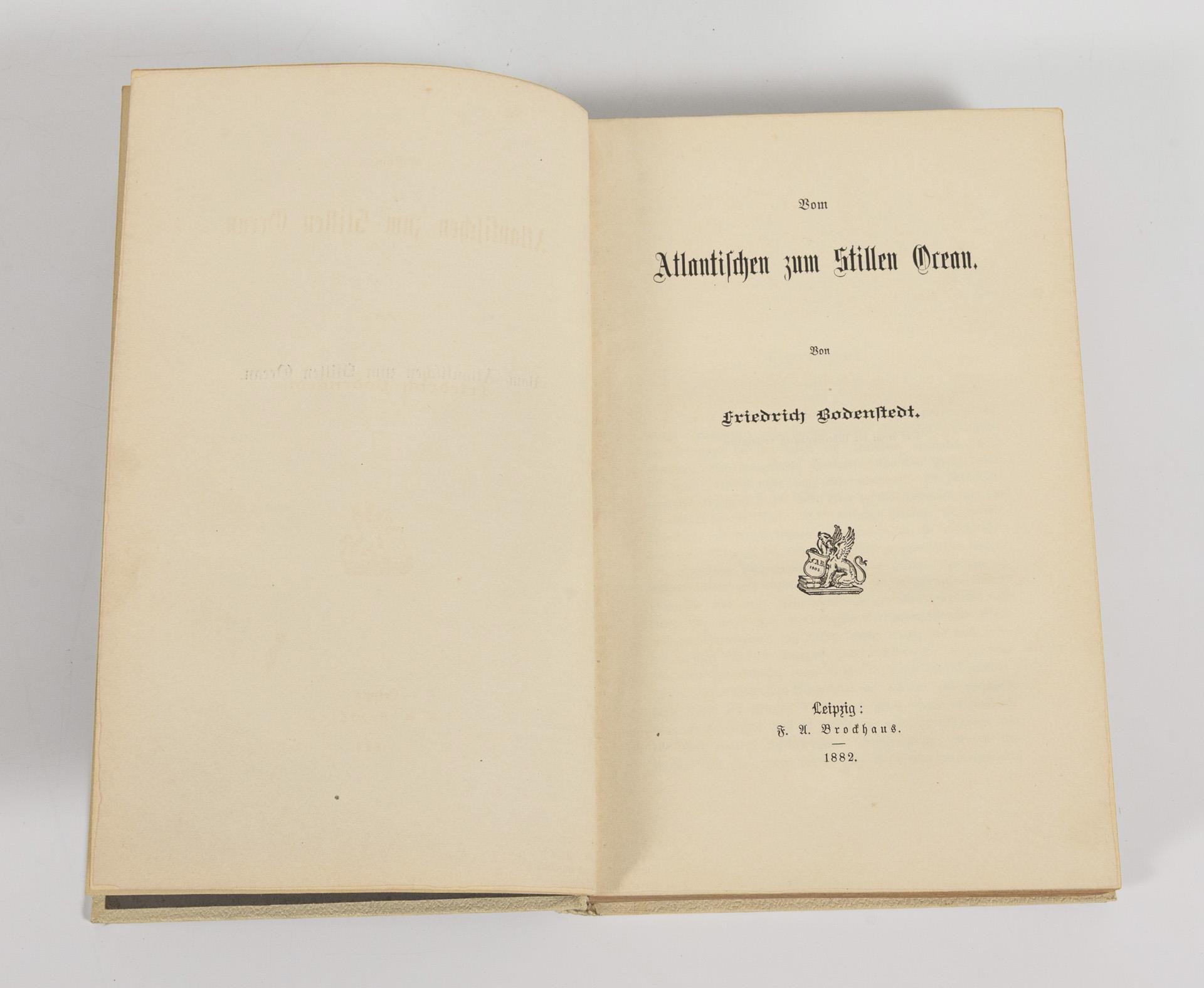 Arthur Schüler: "Guide Through North- and Central-America - Souvenir of the North German Lloyd, Bremen", Berlin und New York 1889, Publishers: J. Reichmann & Cantor. 44, 469 Seiten mit Ansichten und einigen Karten, darunter eine Faltkarte, in farbig geprägtem Leineneinband, 18,5 x 12,5 cm. / Bodenstedt, Friedrich: "Vom Atlantischen zum Stillen Ocean", F.A. Brockhaus. Leipzig. 1882. 11, 426 Seiten im goldgeprägten Leineneinband, 22,5 x 15 cm. Im Vorsatz handschriftliche biografische Daten über den Verfasser. / Imgersoll, Ernest: "The Crest of the Continent a record of a summer's ramble in the Rocky Mountains and beyond.", Chicago 1885, R.R. Donnelly & Sons, Publishers. 344 Seiten mit zahlreichen Abbildungen, im farbig geprägten Leineneinband. 22 x 17,5 cm. Altersgemäß guter Zustand mit schwachen Altersspuren, ohne die gelegentlich aufgeführte Karte. / Barton, Leslie M.: "A study of all American markets including all cities and towns of 1,000 population or more in the United States, arranged by markets and states". Jefferson City. 1929, The Hugh Stephens Press. 640 Seiten mit Beschreibung der Städte sowie Statistiken und Tabellen, im flexiblen, geprägten Leineneinband, mit Grünschnitt. 35 x 28 cm.
